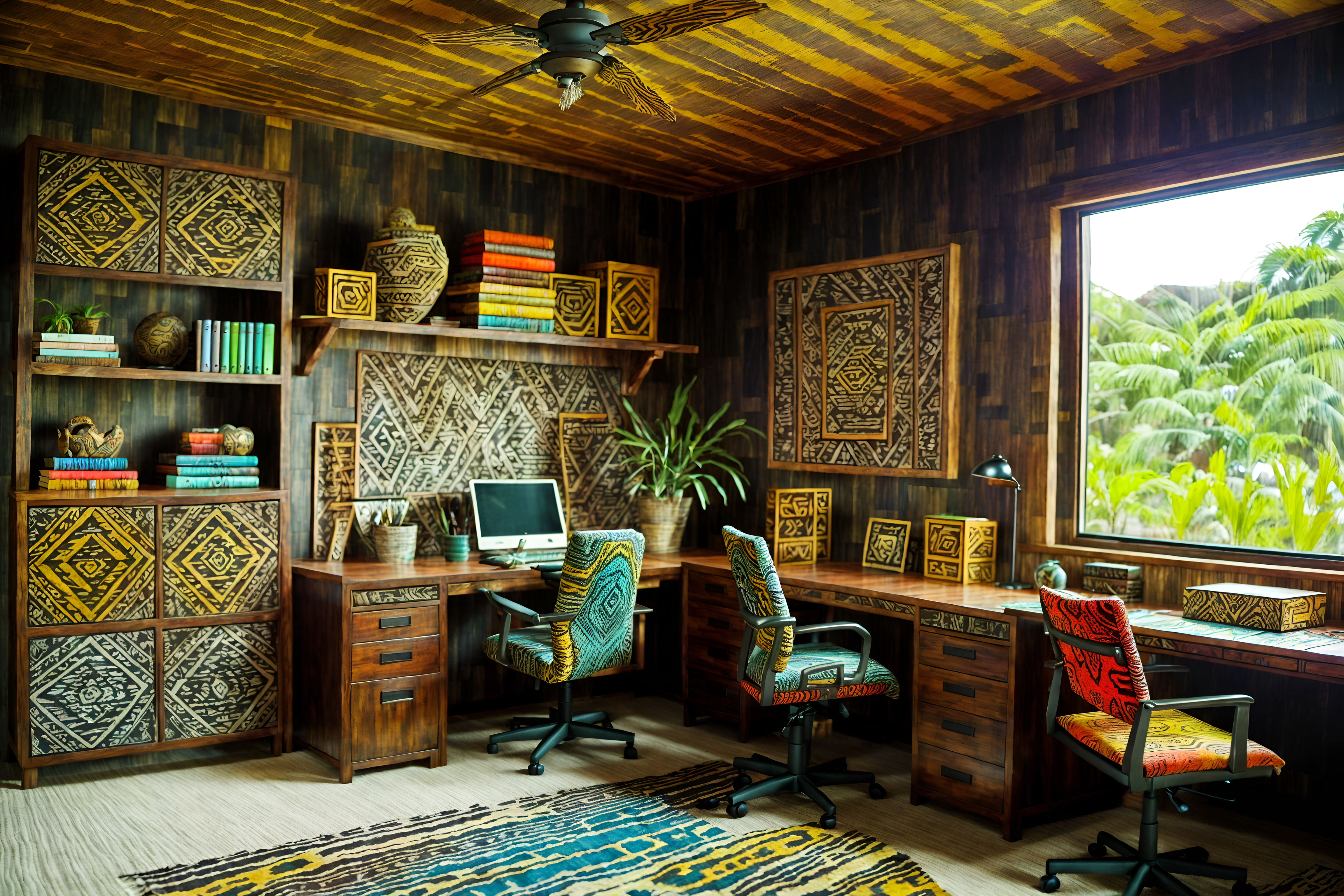 photo from pinterest of tribal-style interior designed (home office interior) with cabinets and plant and computer desk and desk lamp and office chair and cabinets. . with hand dyed batik fabrics and animal furslinen and exuberant splashes of colour and planks of stone and tribal patterns and sculptures and artworks and animal prints and smooth worn timbers. . cinematic photo, highly detailed, cinematic lighting, ultra-detailed, ultrarealistic, photorealism, 8k. trending on pinterest. tribal interior design style. masterpiece, cinematic light, ultrarealistic+, photorealistic+, 8k, raw photo, realistic, sharp focus on eyes, (symmetrical eyes), (intact eyes), hyperrealistic, highest quality, best quality, , highly detailed, masterpiece, best quality, extremely detailed 8k wallpaper, masterpiece, best quality, ultra-detailed, best shadow, detailed background, detailed face, detailed eyes, high contrast, best illumination, detailed face, dulux, caustic, dynamic angle, detailed glow. dramatic lighting. highly detailed, insanely detailed hair, symmetrical, intricate details, professionally retouched, 8k high definition. strong bokeh. award winning photo.