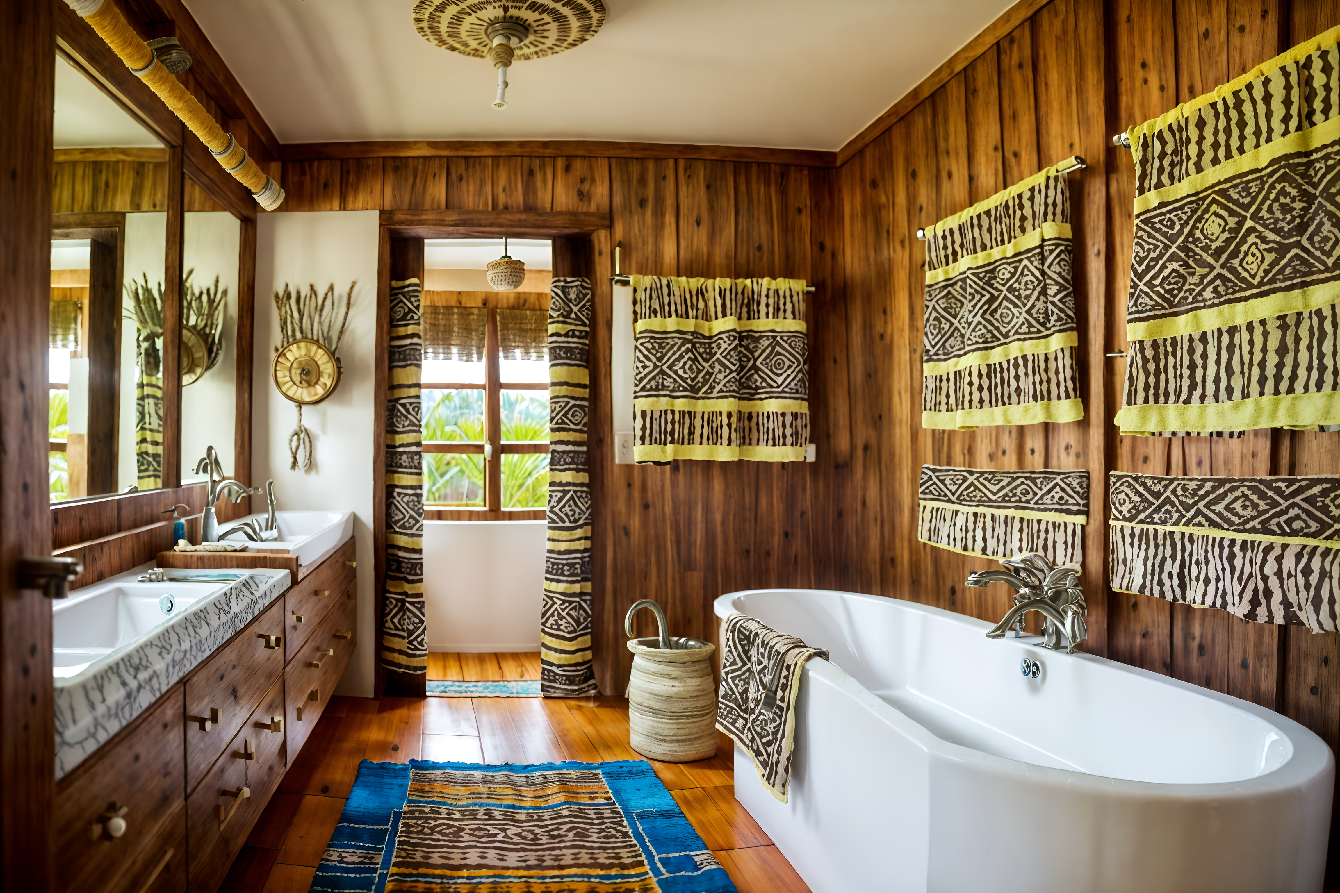 photo from pinterest of tribal-style interior designed (hotel bathroom interior) with bathroom cabinet and mirror and shower and bathroom sink with faucet and bath towel and bathtub and bath rail and waste basket. . with tribal patterns and desert colours and smooth worn timbers and exuberant splashes of colour and hand dyed batik fabrics and tribal revival and animal prints and animal furslinen. . cinematic photo, highly detailed, cinematic lighting, ultra-detailed, ultrarealistic, photorealism, 8k. trending on pinterest. tribal interior design style. masterpiece, cinematic light, ultrarealistic+, photorealistic+, 8k, raw photo, realistic, sharp focus on eyes, (symmetrical eyes), (intact eyes), hyperrealistic, highest quality, best quality, , highly detailed, masterpiece, best quality, extremely detailed 8k wallpaper, masterpiece, best quality, ultra-detailed, best shadow, detailed background, detailed face, detailed eyes, high contrast, best illumination, detailed face, dulux, caustic, dynamic angle, detailed glow. dramatic lighting. highly detailed, insanely detailed hair, symmetrical, intricate details, professionally retouched, 8k high definition. strong bokeh. award winning photo.