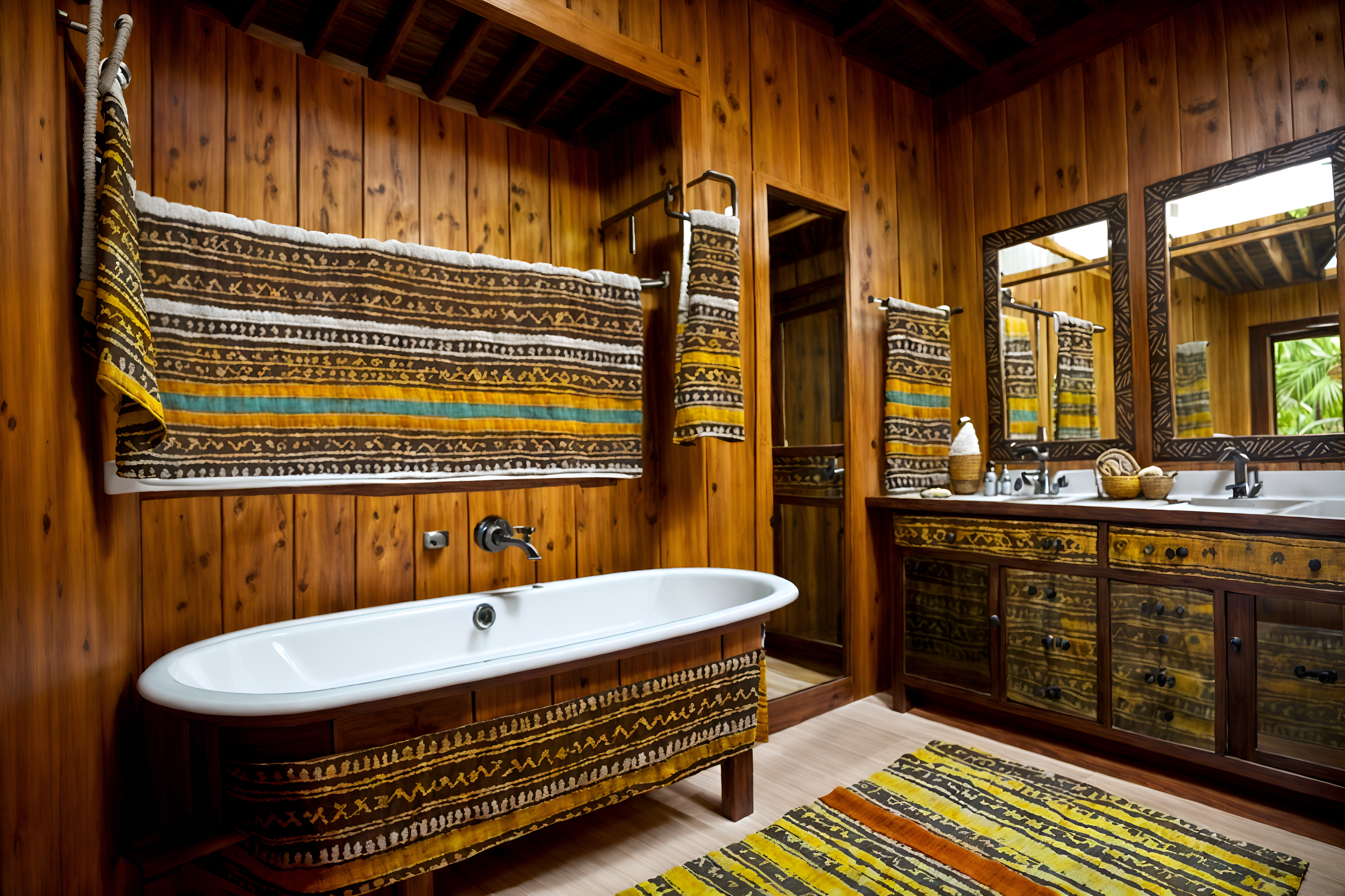 photo from pinterest of tribal-style interior designed (hotel bathroom interior) with bathroom cabinet and mirror and shower and bathroom sink with faucet and bath towel and bathtub and bath rail and waste basket. . with tribal patterns and desert colours and smooth worn timbers and exuberant splashes of colour and hand dyed batik fabrics and tribal revival and animal prints and animal furslinen. . cinematic photo, highly detailed, cinematic lighting, ultra-detailed, ultrarealistic, photorealism, 8k. trending on pinterest. tribal interior design style. masterpiece, cinematic light, ultrarealistic+, photorealistic+, 8k, raw photo, realistic, sharp focus on eyes, (symmetrical eyes), (intact eyes), hyperrealistic, highest quality, best quality, , highly detailed, masterpiece, best quality, extremely detailed 8k wallpaper, masterpiece, best quality, ultra-detailed, best shadow, detailed background, detailed face, detailed eyes, high contrast, best illumination, detailed face, dulux, caustic, dynamic angle, detailed glow. dramatic lighting. highly detailed, insanely detailed hair, symmetrical, intricate details, professionally retouched, 8k high definition. strong bokeh. award winning photo.
