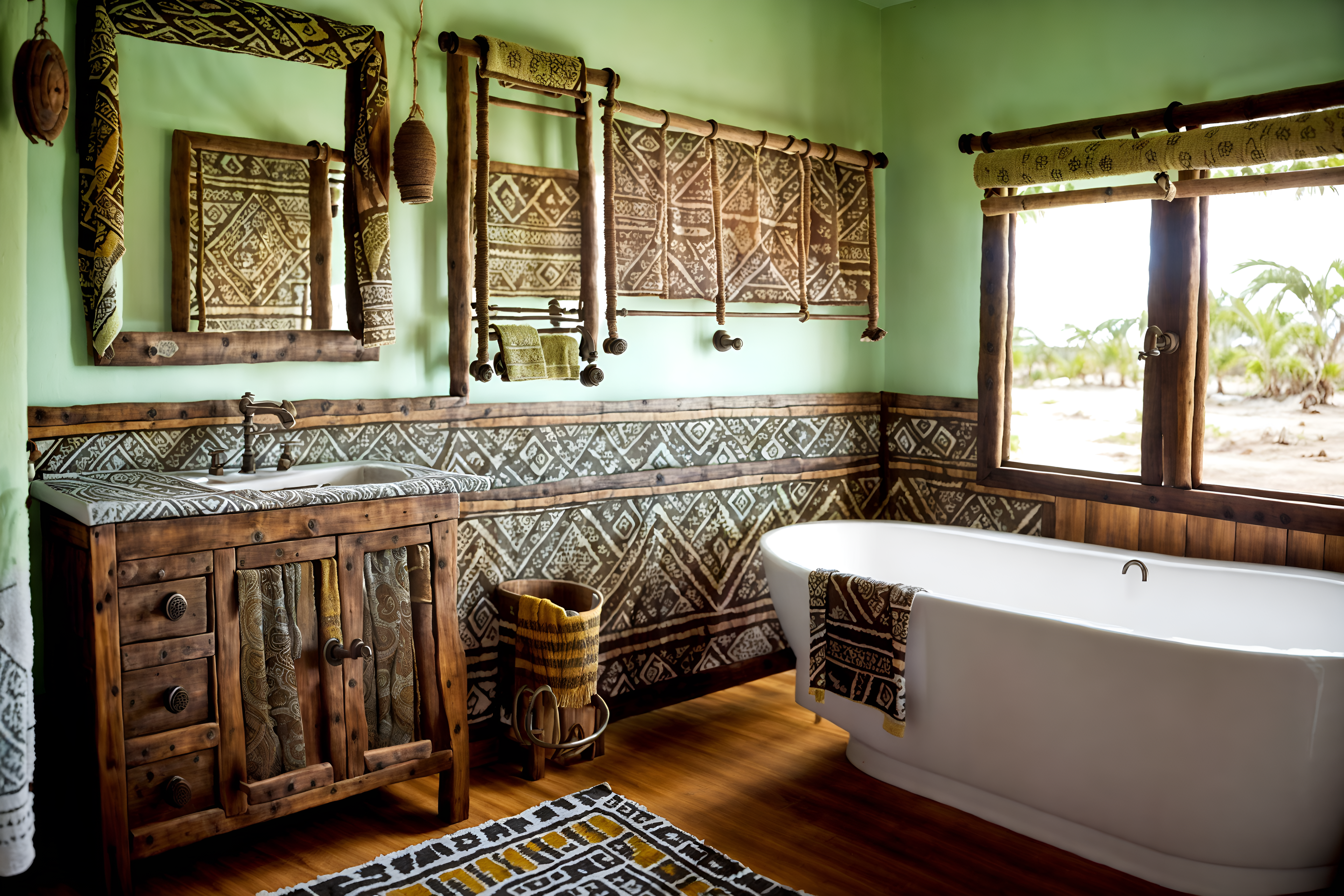 photo from pinterest of tribal-style interior designed (hotel bathroom interior) with bathroom cabinet and mirror and shower and bathroom sink with faucet and bath towel and bathtub and bath rail and waste basket. . with tribal patterns and desert colours and smooth worn timbers and exuberant splashes of colour and hand dyed batik fabrics and tribal revival and animal prints and animal furslinen. . cinematic photo, highly detailed, cinematic lighting, ultra-detailed, ultrarealistic, photorealism, 8k. trending on pinterest. tribal interior design style. masterpiece, cinematic light, ultrarealistic+, photorealistic+, 8k, raw photo, realistic, sharp focus on eyes, (symmetrical eyes), (intact eyes), hyperrealistic, highest quality, best quality, , highly detailed, masterpiece, best quality, extremely detailed 8k wallpaper, masterpiece, best quality, ultra-detailed, best shadow, detailed background, detailed face, detailed eyes, high contrast, best illumination, detailed face, dulux, caustic, dynamic angle, detailed glow. dramatic lighting. highly detailed, insanely detailed hair, symmetrical, intricate details, professionally retouched, 8k high definition. strong bokeh. award winning photo.