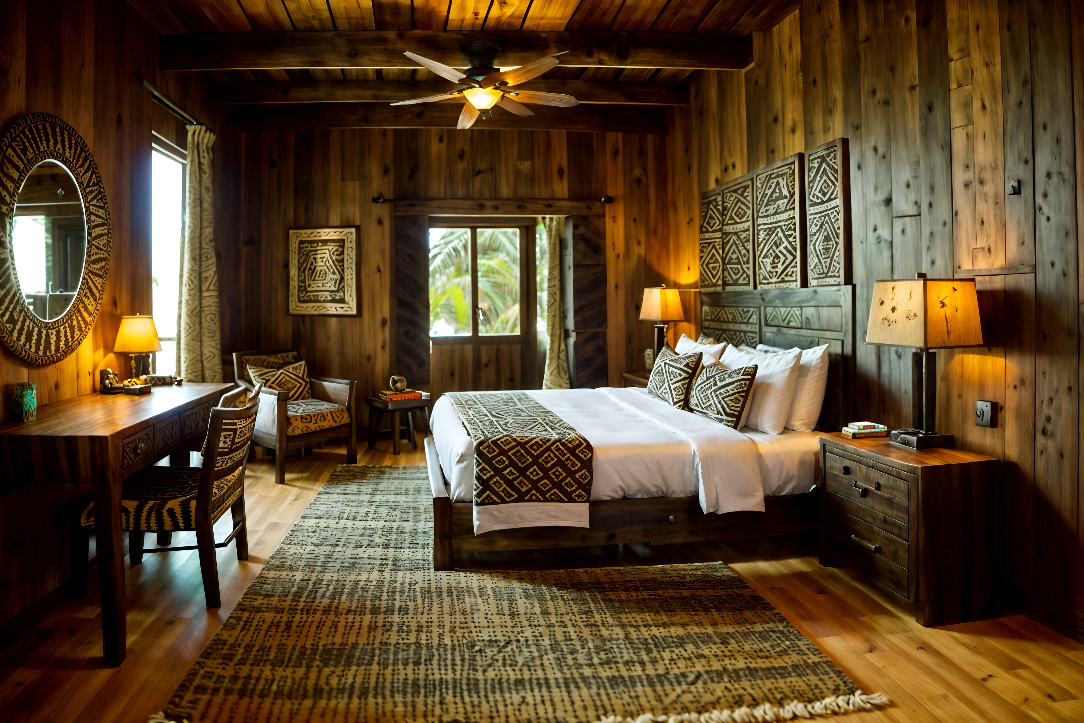photo from pinterest of tribal-style interior designed (hotel room interior) with accent chair and bedside table or night stand and hotel bathroom and storage bench or ottoman and mirror and working desk with desk chair and dresser closet and night light. . with smooth worn timbers and tribal patterns and planks of stone and animal prints and tribal revival and desert colours and intricate grass weaving and sculptures and artworks. . cinematic photo, highly detailed, cinematic lighting, ultra-detailed, ultrarealistic, photorealism, 8k. trending on pinterest. tribal interior design style. masterpiece, cinematic light, ultrarealistic+, photorealistic+, 8k, raw photo, realistic, sharp focus on eyes, (symmetrical eyes), (intact eyes), hyperrealistic, highest quality, best quality, , highly detailed, masterpiece, best quality, extremely detailed 8k wallpaper, masterpiece, best quality, ultra-detailed, best shadow, detailed background, detailed face, detailed eyes, high contrast, best illumination, detailed face, dulux, caustic, dynamic angle, detailed glow. dramatic lighting. highly detailed, insanely detailed hair, symmetrical, intricate details, professionally retouched, 8k high definition. strong bokeh. award winning photo.