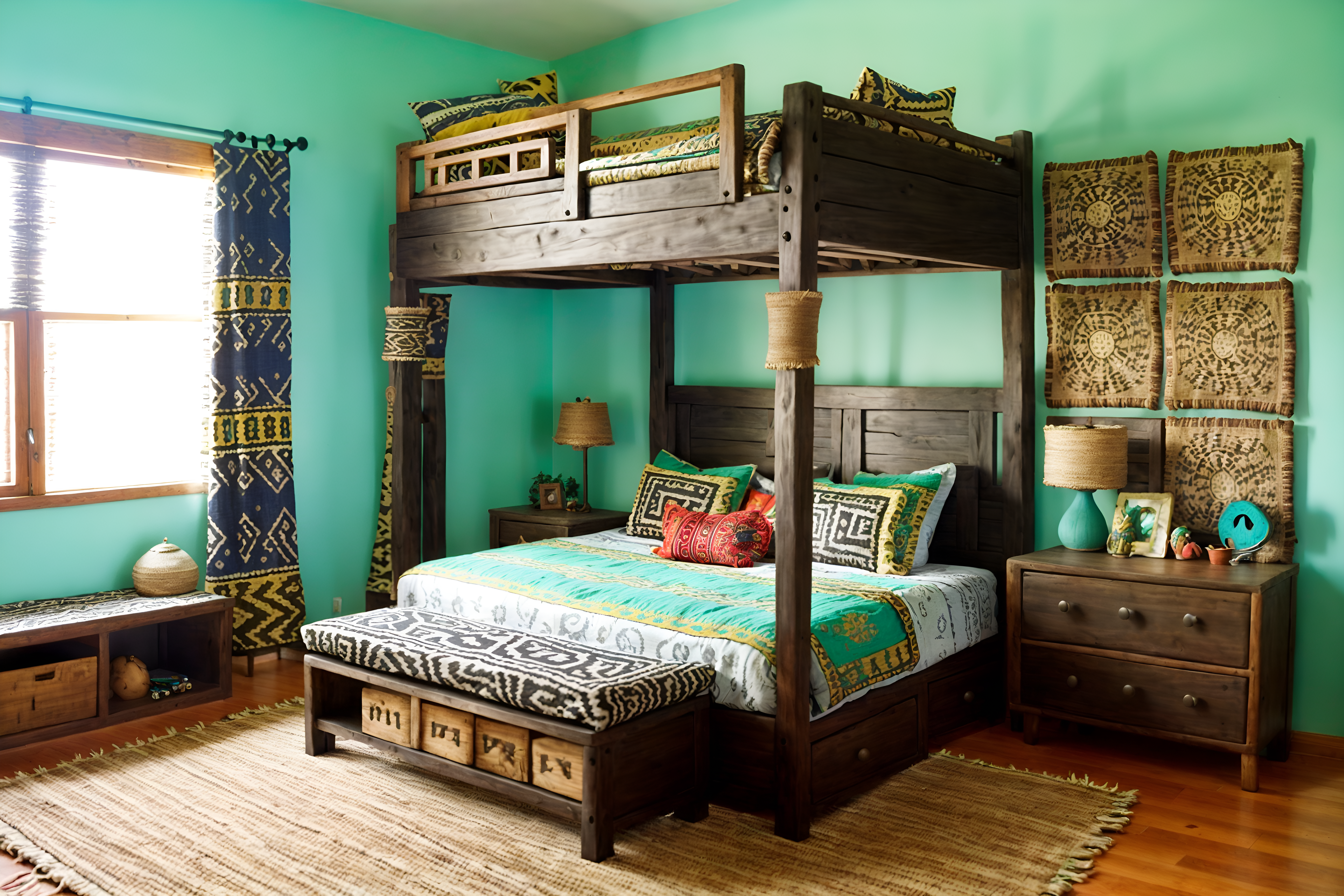 photo from pinterest of tribal-style interior designed (kids room interior) with storage bench or ottoman and dresser closet and kids desk and headboard and bedside table or night stand and plant and mirror and night light. . with planks of stone and animal prints and smooth worn timbers and exuberant splashes of colour and tribal revival and hand dyed batik fabrics and intricate grass weaving and desert colours. . cinematic photo, highly detailed, cinematic lighting, ultra-detailed, ultrarealistic, photorealism, 8k. trending on pinterest. tribal interior design style. masterpiece, cinematic light, ultrarealistic+, photorealistic+, 8k, raw photo, realistic, sharp focus on eyes, (symmetrical eyes), (intact eyes), hyperrealistic, highest quality, best quality, , highly detailed, masterpiece, best quality, extremely detailed 8k wallpaper, masterpiece, best quality, ultra-detailed, best shadow, detailed background, detailed face, detailed eyes, high contrast, best illumination, detailed face, dulux, caustic, dynamic angle, detailed glow. dramatic lighting. highly detailed, insanely detailed hair, symmetrical, intricate details, professionally retouched, 8k high definition. strong bokeh. award winning photo.