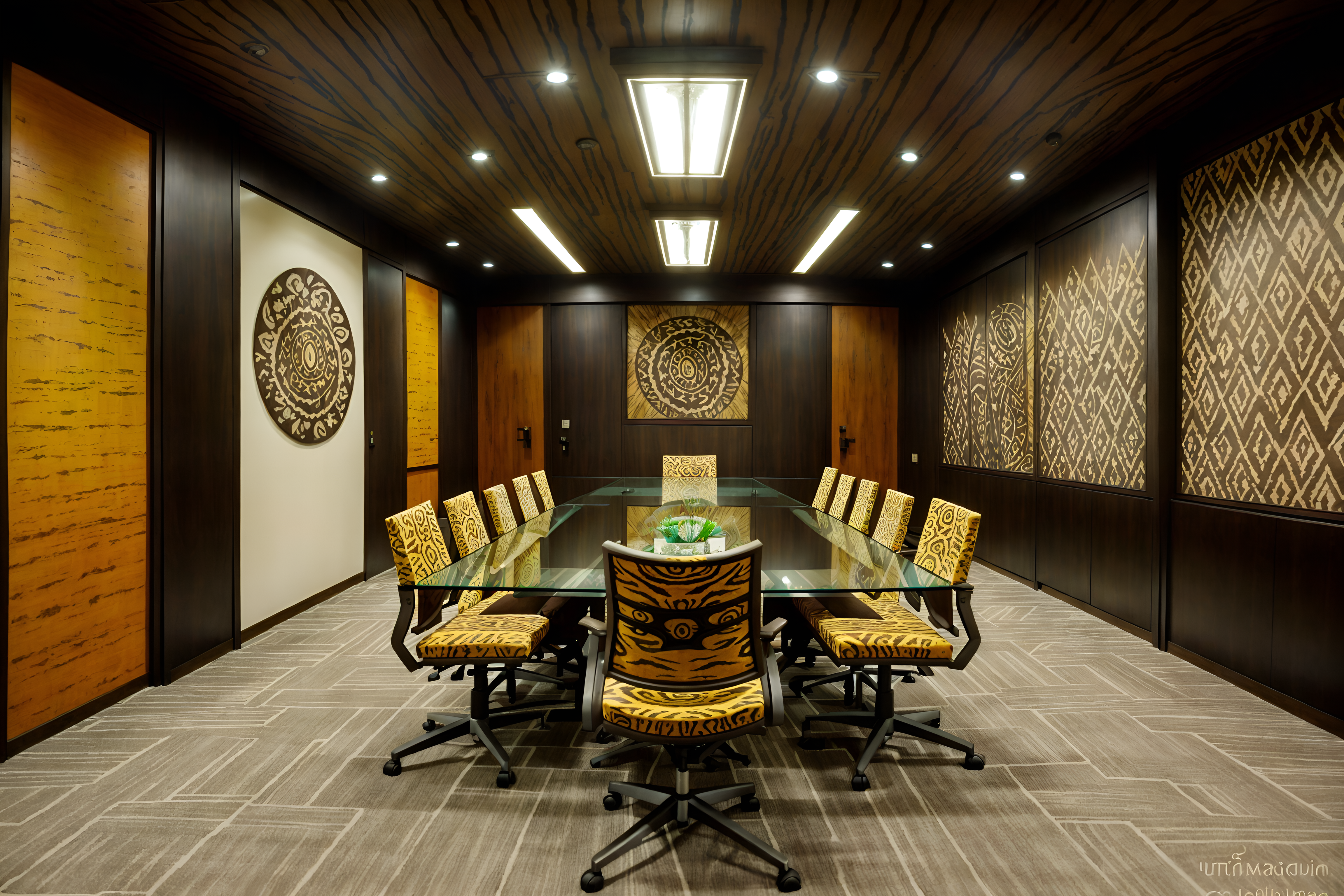photo from pinterest of tribal-style interior designed (meeting room interior) with glass doors and vase and glass walls and boardroom table and painting or photo on wall and plant and office chairs and cabinets. . with animal prints and tribal patterns and animal furslinen and tribal revival and exuberant splashes of colour and planks of stone and desert colours and smooth worn timbers. . cinematic photo, highly detailed, cinematic lighting, ultra-detailed, ultrarealistic, photorealism, 8k. trending on pinterest. tribal interior design style. masterpiece, cinematic light, ultrarealistic+, photorealistic+, 8k, raw photo, realistic, sharp focus on eyes, (symmetrical eyes), (intact eyes), hyperrealistic, highest quality, best quality, , highly detailed, masterpiece, best quality, extremely detailed 8k wallpaper, masterpiece, best quality, ultra-detailed, best shadow, detailed background, detailed face, detailed eyes, high contrast, best illumination, detailed face, dulux, caustic, dynamic angle, detailed glow. dramatic lighting. highly detailed, insanely detailed hair, symmetrical, intricate details, professionally retouched, 8k high definition. strong bokeh. award winning photo.