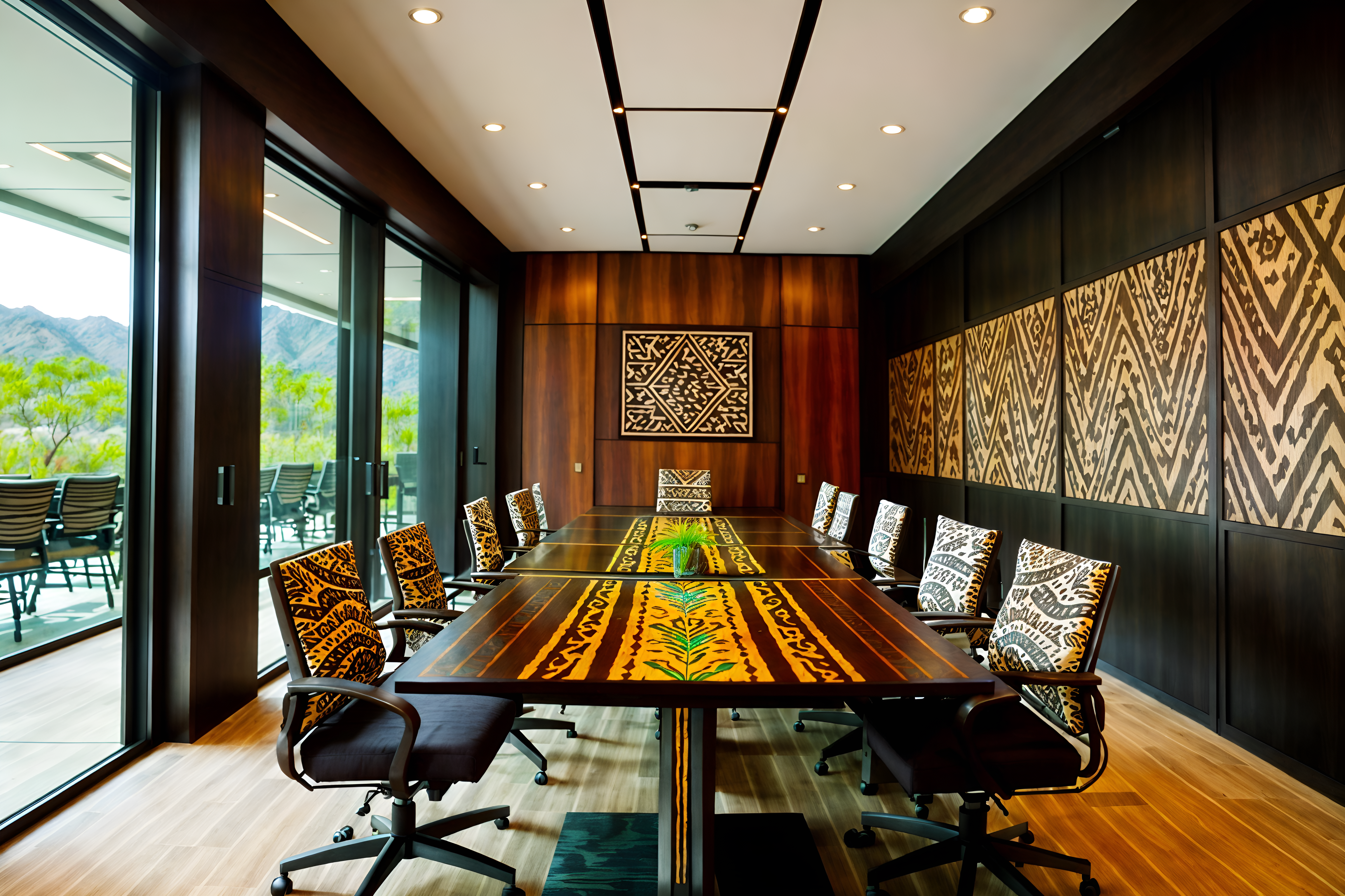 photo from pinterest of tribal-style interior designed (meeting room interior) with glass doors and vase and glass walls and boardroom table and painting or photo on wall and plant and office chairs and cabinets. . with animal prints and tribal patterns and animal furslinen and tribal revival and exuberant splashes of colour and planks of stone and desert colours and smooth worn timbers. . cinematic photo, highly detailed, cinematic lighting, ultra-detailed, ultrarealistic, photorealism, 8k. trending on pinterest. tribal interior design style. masterpiece, cinematic light, ultrarealistic+, photorealistic+, 8k, raw photo, realistic, sharp focus on eyes, (symmetrical eyes), (intact eyes), hyperrealistic, highest quality, best quality, , highly detailed, masterpiece, best quality, extremely detailed 8k wallpaper, masterpiece, best quality, ultra-detailed, best shadow, detailed background, detailed face, detailed eyes, high contrast, best illumination, detailed face, dulux, caustic, dynamic angle, detailed glow. dramatic lighting. highly detailed, insanely detailed hair, symmetrical, intricate details, professionally retouched, 8k high definition. strong bokeh. award winning photo.