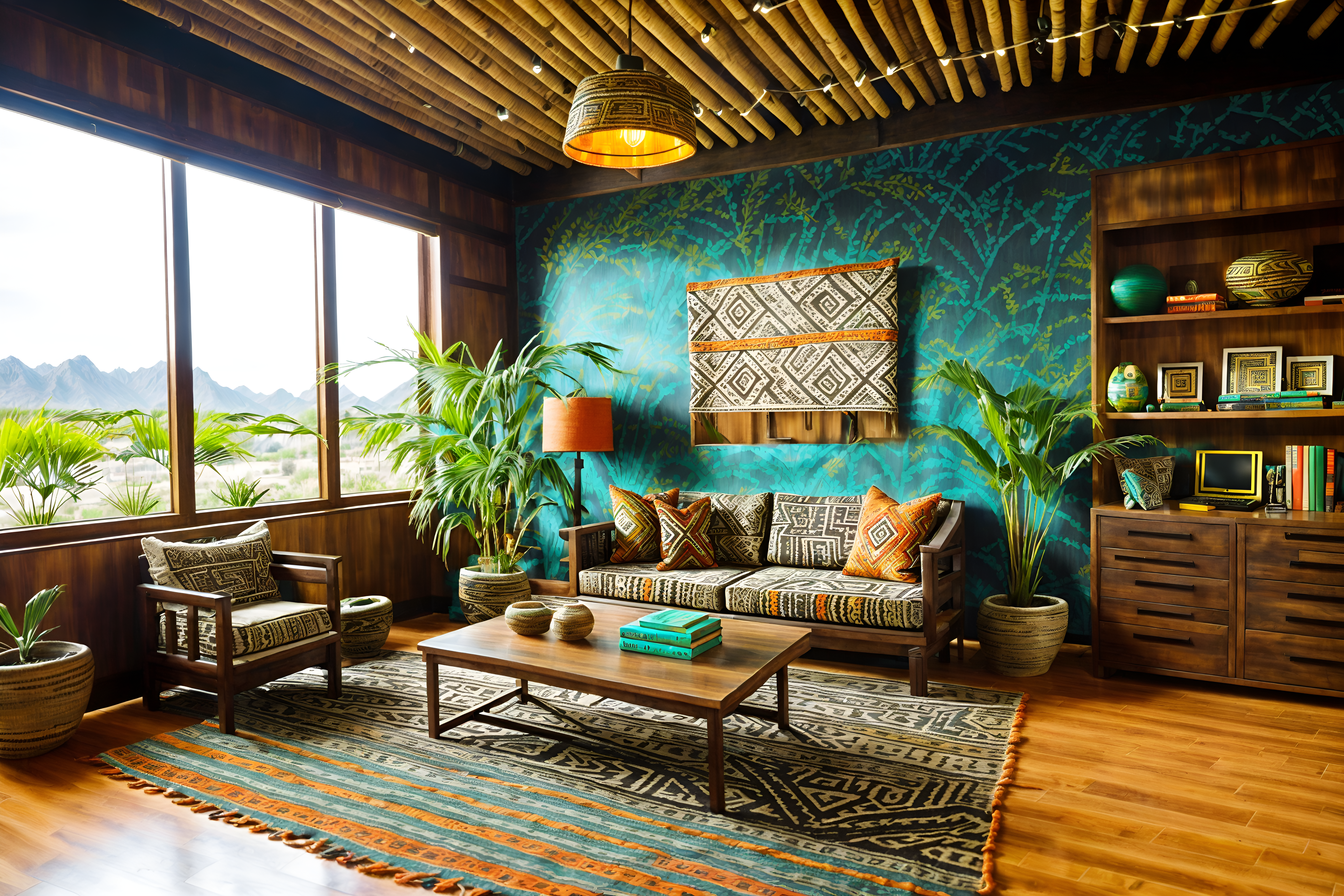 photo from pinterest of tribal-style interior designed (office interior) with cabinets and desk lamps and office desks and plants and computer desks and windows and seating area with sofa and lounge chairs. . with tribal revival and exuberant splashes of colour and intricate grass weaving and desert colours and planks of stone and animal prints and hand dyed batik fabrics and sculptures and artworks. . cinematic photo, highly detailed, cinematic lighting, ultra-detailed, ultrarealistic, photorealism, 8k. trending on pinterest. tribal interior design style. masterpiece, cinematic light, ultrarealistic+, photorealistic+, 8k, raw photo, realistic, sharp focus on eyes, (symmetrical eyes), (intact eyes), hyperrealistic, highest quality, best quality, , highly detailed, masterpiece, best quality, extremely detailed 8k wallpaper, masterpiece, best quality, ultra-detailed, best shadow, detailed background, detailed face, detailed eyes, high contrast, best illumination, detailed face, dulux, caustic, dynamic angle, detailed glow. dramatic lighting. highly detailed, insanely detailed hair, symmetrical, intricate details, professionally retouched, 8k high definition. strong bokeh. award winning photo.