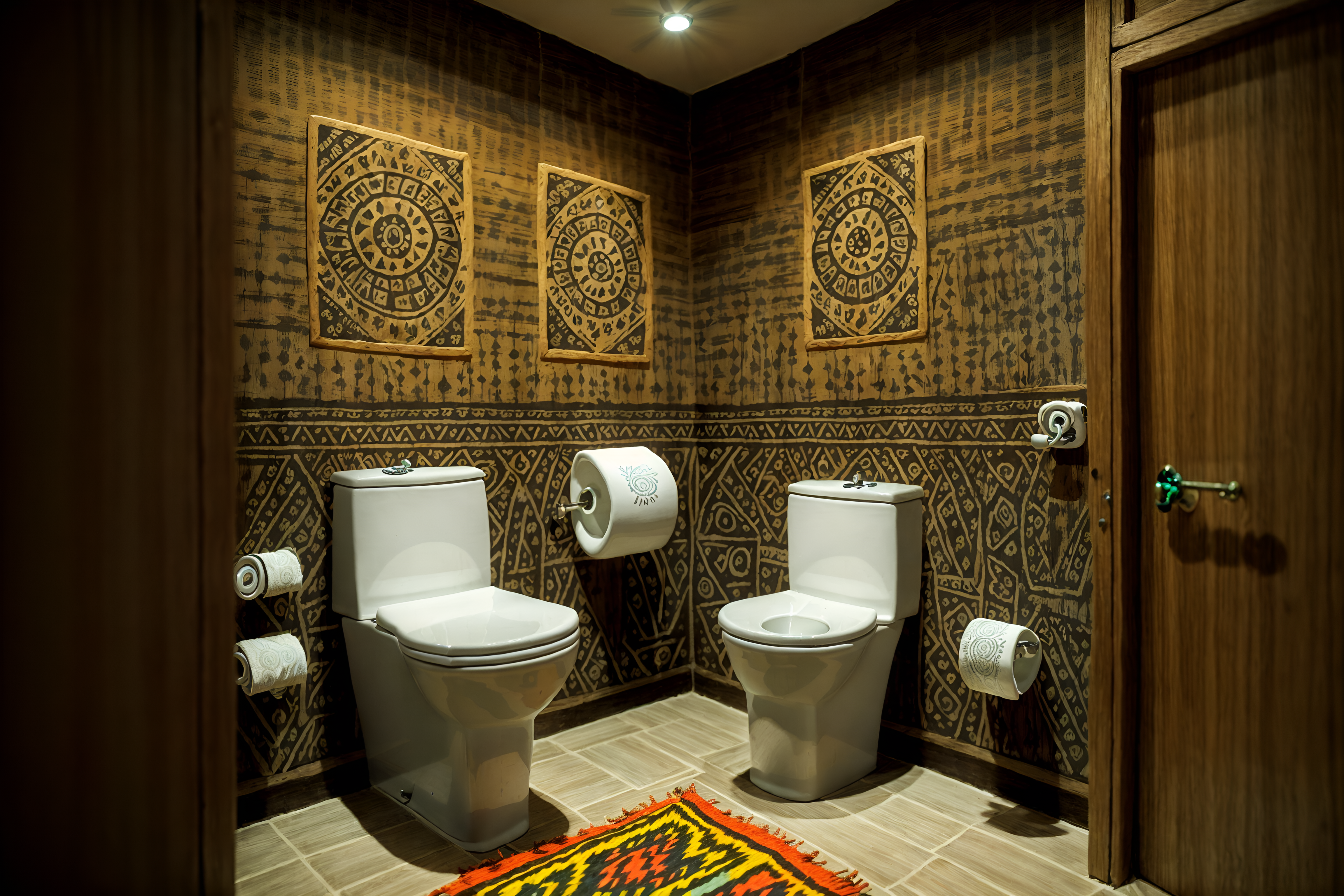 photo from pinterest of tribal-style interior designed (toilet interior) with sink with tap and toilet with toilet seat up and toilet paper hanger and sink with tap. . with exuberant splashes of colour and desert colours and animal prints and intricate grass weaving and tribal revival and animal furslinen and tribal patterns and sculptures and artworks. . cinematic photo, highly detailed, cinematic lighting, ultra-detailed, ultrarealistic, photorealism, 8k. trending on pinterest. tribal interior design style. masterpiece, cinematic light, ultrarealistic+, photorealistic+, 8k, raw photo, realistic, sharp focus on eyes, (symmetrical eyes), (intact eyes), hyperrealistic, highest quality, best quality, , highly detailed, masterpiece, best quality, extremely detailed 8k wallpaper, masterpiece, best quality, ultra-detailed, best shadow, detailed background, detailed face, detailed eyes, high contrast, best illumination, detailed face, dulux, caustic, dynamic angle, detailed glow. dramatic lighting. highly detailed, insanely detailed hair, symmetrical, intricate details, professionally retouched, 8k high definition. strong bokeh. award winning photo.
