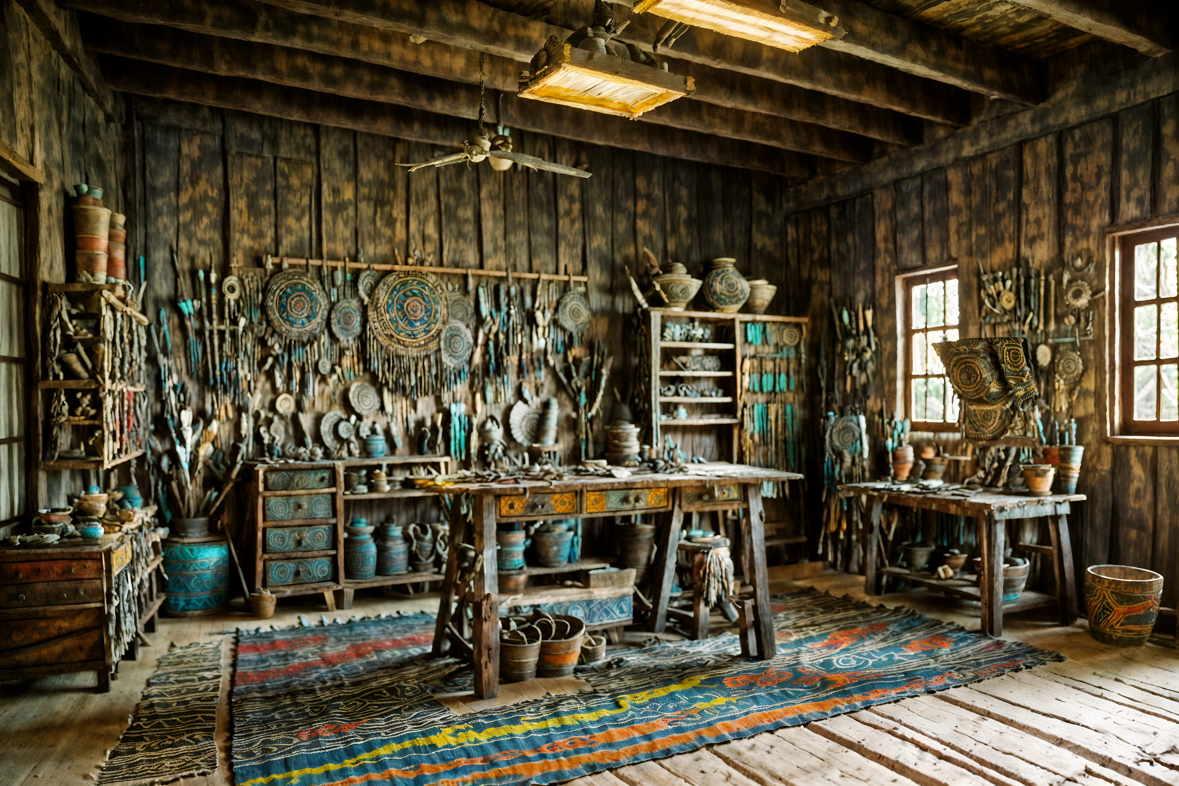 photo from pinterest of tribal-style interior designed (workshop interior) with tool wall and messy and wooden workbench and tool wall. . with tribal patterns and sculptures and artworks and planks of stone and exuberant splashes of colour and animal prints and animal furslinen and hand dyed batik fabrics and tribal revival. . cinematic photo, highly detailed, cinematic lighting, ultra-detailed, ultrarealistic, photorealism, 8k. trending on pinterest. tribal interior design style. masterpiece, cinematic light, ultrarealistic+, photorealistic+, 8k, raw photo, realistic, sharp focus on eyes, (symmetrical eyes), (intact eyes), hyperrealistic, highest quality, best quality, , highly detailed, masterpiece, best quality, extremely detailed 8k wallpaper, masterpiece, best quality, ultra-detailed, best shadow, detailed background, detailed face, detailed eyes, high contrast, best illumination, detailed face, dulux, caustic, dynamic angle, detailed glow. dramatic lighting. highly detailed, insanely detailed hair, symmetrical, intricate details, professionally retouched, 8k high definition. strong bokeh. award winning photo.