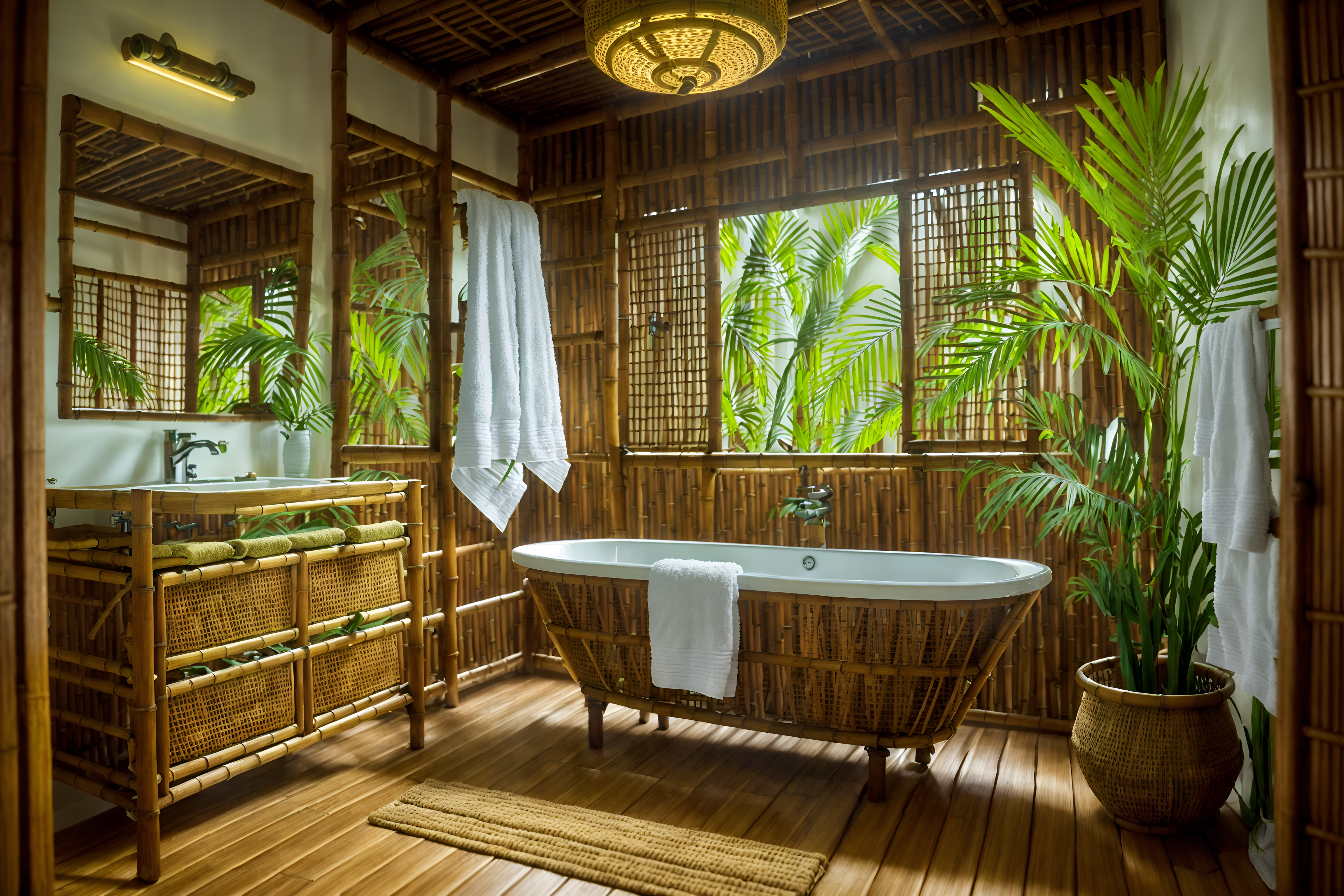 photo from pinterest of tropical-style interior designed (bathroom interior) with bath towel and bathroom sink with faucet and bathroom cabinet and mirror and shower and waste basket and plant and bath rail. . with bamboo and teak and lattice prints and cane motifs and palm trees and rattan and wicker and palm leaves. . cinematic photo, highly detailed, cinematic lighting, ultra-detailed, ultrarealistic, photorealism, 8k. trending on pinterest. tropical interior design style. masterpiece, cinematic light, ultrarealistic+, photorealistic+, 8k, raw photo, realistic, sharp focus on eyes, (symmetrical eyes), (intact eyes), hyperrealistic, highest quality, best quality, , highly detailed, masterpiece, best quality, extremely detailed 8k wallpaper, masterpiece, best quality, ultra-detailed, best shadow, detailed background, detailed face, detailed eyes, high contrast, best illumination, detailed face, dulux, caustic, dynamic angle, detailed glow. dramatic lighting. highly detailed, insanely detailed hair, symmetrical, intricate details, professionally retouched, 8k high definition. strong bokeh. award winning photo.