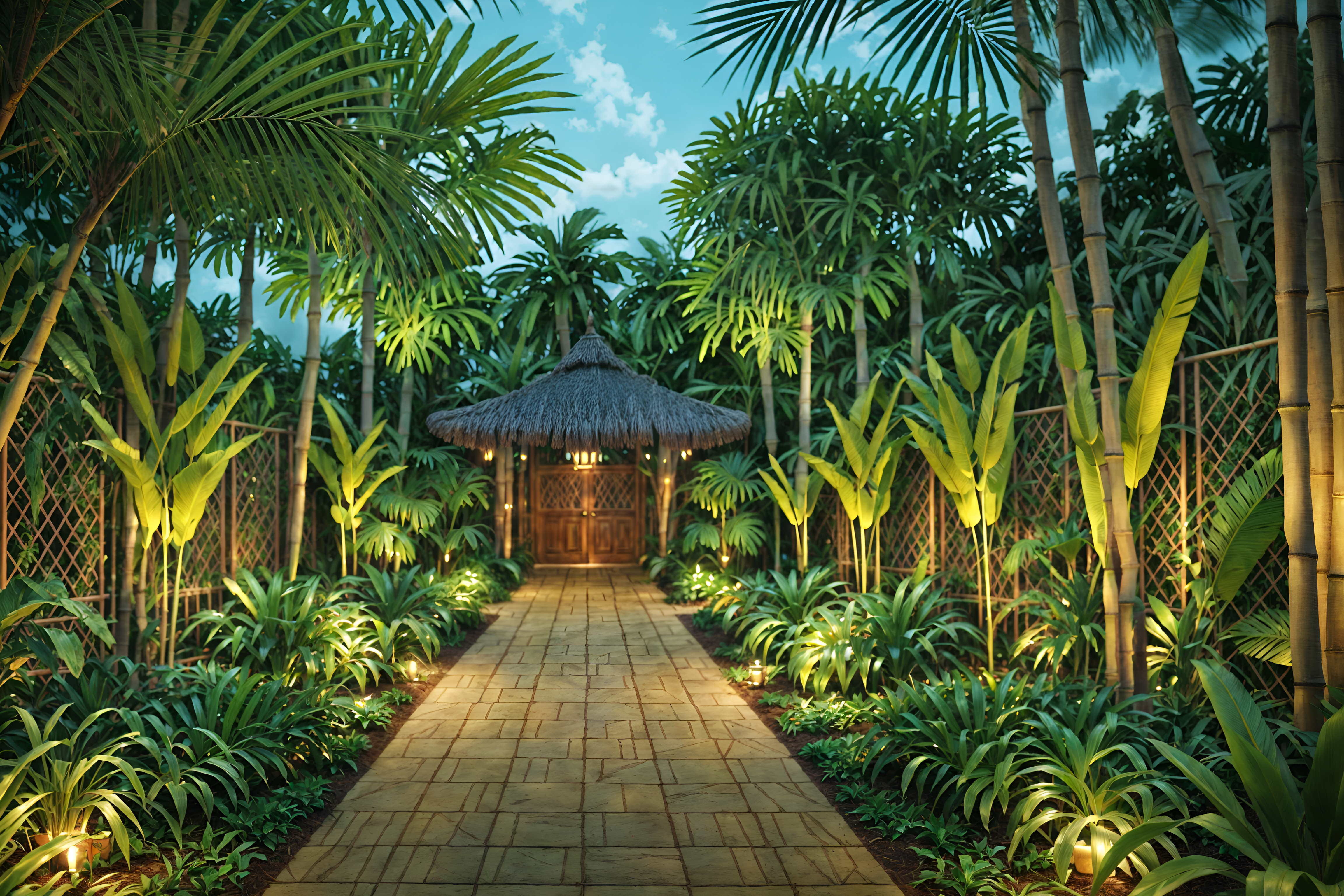 photo from pinterest of tropical-style designed (outdoor garden ) with garden plants and grass and garden tree and garden plants. . with wicker and lattice prints and palm leaves and bamboo and palm trees and rattan and teak and cane motifs. . cinematic photo, highly detailed, cinematic lighting, ultra-detailed, ultrarealistic, photorealism, 8k. trending on pinterest. tropical design style. masterpiece, cinematic light, ultrarealistic+, photorealistic+, 8k, raw photo, realistic, sharp focus on eyes, (symmetrical eyes), (intact eyes), hyperrealistic, highest quality, best quality, , highly detailed, masterpiece, best quality, extremely detailed 8k wallpaper, masterpiece, best quality, ultra-detailed, best shadow, detailed background, detailed face, detailed eyes, high contrast, best illumination, detailed face, dulux, caustic, dynamic angle, detailed glow. dramatic lighting. highly detailed, insanely detailed hair, symmetrical, intricate details, professionally retouched, 8k high definition. strong bokeh. award winning photo.