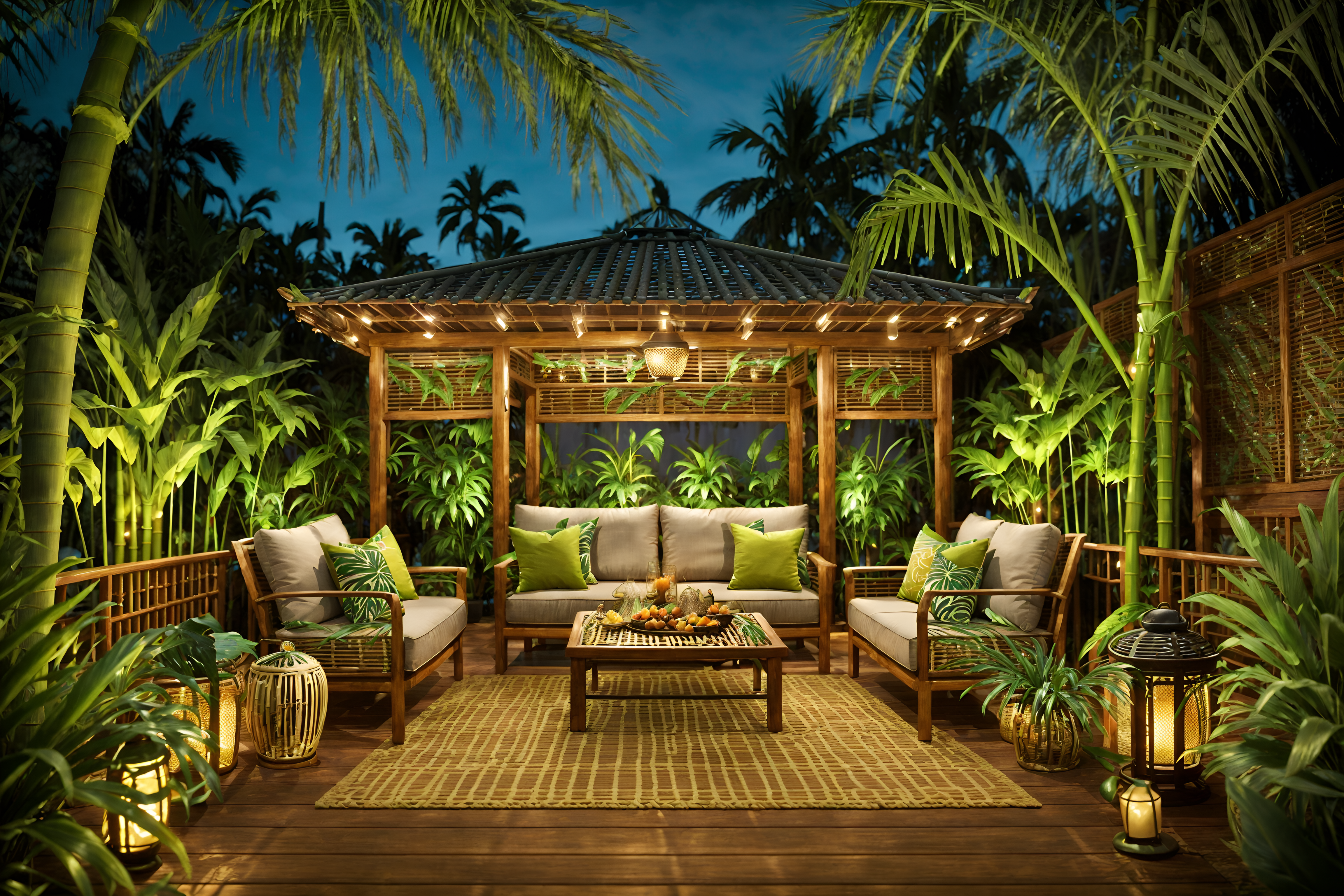 photo from pinterest of tropical-style designed (outdoor patio ) with barbeque or grill and grass and deck with deck chairs and patio couch with pillows and plant and barbeque or grill. . with cane motifs and bamboo and wicker and palm leaves and lattice prints and rattan and palm trees and teak. . cinematic photo, highly detailed, cinematic lighting, ultra-detailed, ultrarealistic, photorealism, 8k. trending on pinterest. tropical design style. masterpiece, cinematic light, ultrarealistic+, photorealistic+, 8k, raw photo, realistic, sharp focus on eyes, (symmetrical eyes), (intact eyes), hyperrealistic, highest quality, best quality, , highly detailed, masterpiece, best quality, extremely detailed 8k wallpaper, masterpiece, best quality, ultra-detailed, best shadow, detailed background, detailed face, detailed eyes, high contrast, best illumination, detailed face, dulux, caustic, dynamic angle, detailed glow. dramatic lighting. highly detailed, insanely detailed hair, symmetrical, intricate details, professionally retouched, 8k high definition. strong bokeh. award winning photo.