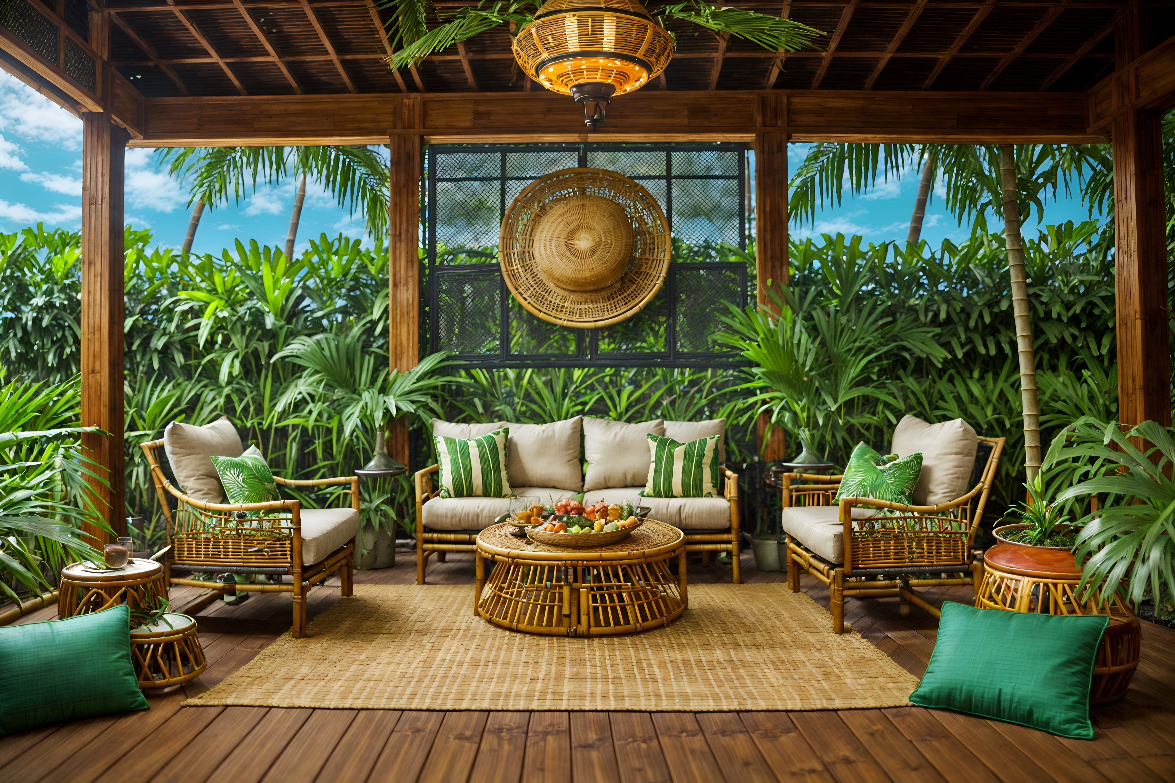 photo from pinterest of tropical-style designed (outdoor patio ) with barbeque or grill and grass and deck with deck chairs and patio couch with pillows and plant and barbeque or grill. . with cane motifs and bamboo and wicker and palm leaves and lattice prints and rattan and palm trees and teak. . cinematic photo, highly detailed, cinematic lighting, ultra-detailed, ultrarealistic, photorealism, 8k. trending on pinterest. tropical design style. masterpiece, cinematic light, ultrarealistic+, photorealistic+, 8k, raw photo, realistic, sharp focus on eyes, (symmetrical eyes), (intact eyes), hyperrealistic, highest quality, best quality, , highly detailed, masterpiece, best quality, extremely detailed 8k wallpaper, masterpiece, best quality, ultra-detailed, best shadow, detailed background, detailed face, detailed eyes, high contrast, best illumination, detailed face, dulux, caustic, dynamic angle, detailed glow. dramatic lighting. highly detailed, insanely detailed hair, symmetrical, intricate details, professionally retouched, 8k high definition. strong bokeh. award winning photo.