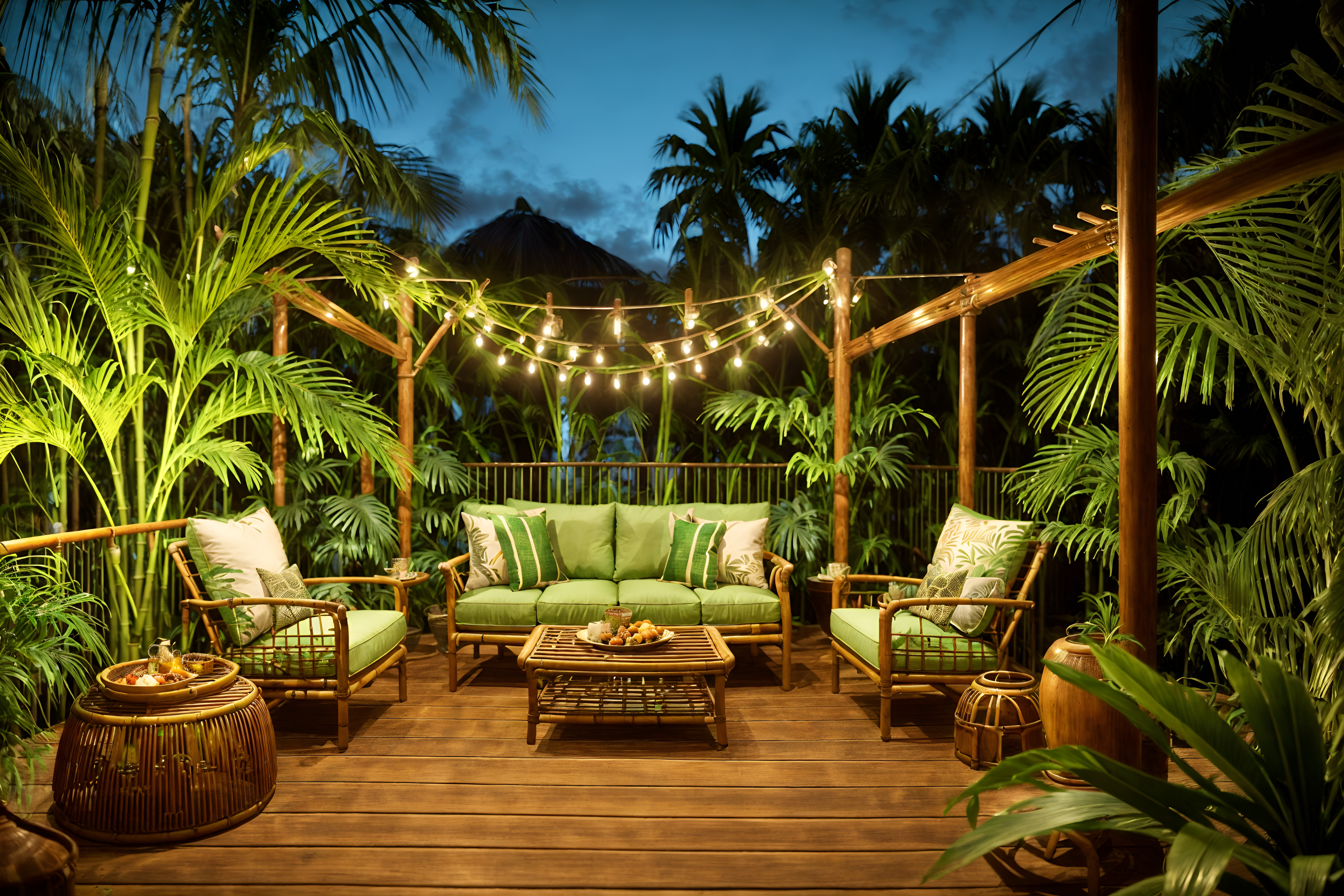 photo from pinterest of tropical-style designed (outdoor patio ) with barbeque or grill and grass and deck with deck chairs and patio couch with pillows and plant and barbeque or grill. . with cane motifs and bamboo and wicker and palm leaves and lattice prints and rattan and palm trees and teak. . cinematic photo, highly detailed, cinematic lighting, ultra-detailed, ultrarealistic, photorealism, 8k. trending on pinterest. tropical design style. masterpiece, cinematic light, ultrarealistic+, photorealistic+, 8k, raw photo, realistic, sharp focus on eyes, (symmetrical eyes), (intact eyes), hyperrealistic, highest quality, best quality, , highly detailed, masterpiece, best quality, extremely detailed 8k wallpaper, masterpiece, best quality, ultra-detailed, best shadow, detailed background, detailed face, detailed eyes, high contrast, best illumination, detailed face, dulux, caustic, dynamic angle, detailed glow. dramatic lighting. highly detailed, insanely detailed hair, symmetrical, intricate details, professionally retouched, 8k high definition. strong bokeh. award winning photo.