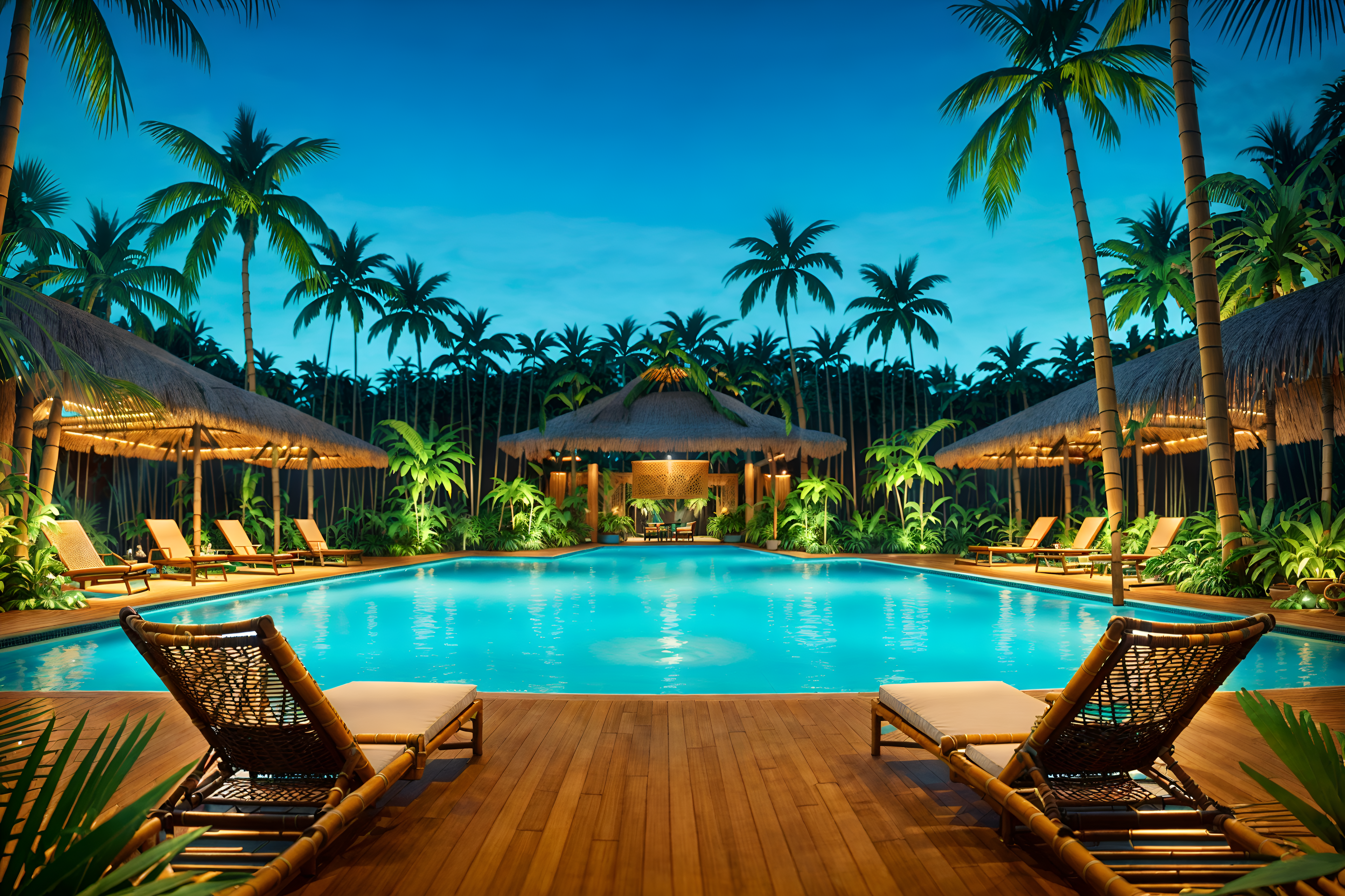 photo from pinterest of tropical-style designed (outdoor pool area ) with pool lights and pool lounge chairs and pool and pool lights. . with rattan and lattice prints and palm leaves and palm trees and wicker and teak and cane motifs and bamboo. . cinematic photo, highly detailed, cinematic lighting, ultra-detailed, ultrarealistic, photorealism, 8k. trending on pinterest. tropical design style. masterpiece, cinematic light, ultrarealistic+, photorealistic+, 8k, raw photo, realistic, sharp focus on eyes, (symmetrical eyes), (intact eyes), hyperrealistic, highest quality, best quality, , highly detailed, masterpiece, best quality, extremely detailed 8k wallpaper, masterpiece, best quality, ultra-detailed, best shadow, detailed background, detailed face, detailed eyes, high contrast, best illumination, detailed face, dulux, caustic, dynamic angle, detailed glow. dramatic lighting. highly detailed, insanely detailed hair, symmetrical, intricate details, professionally retouched, 8k high definition. strong bokeh. award winning photo.