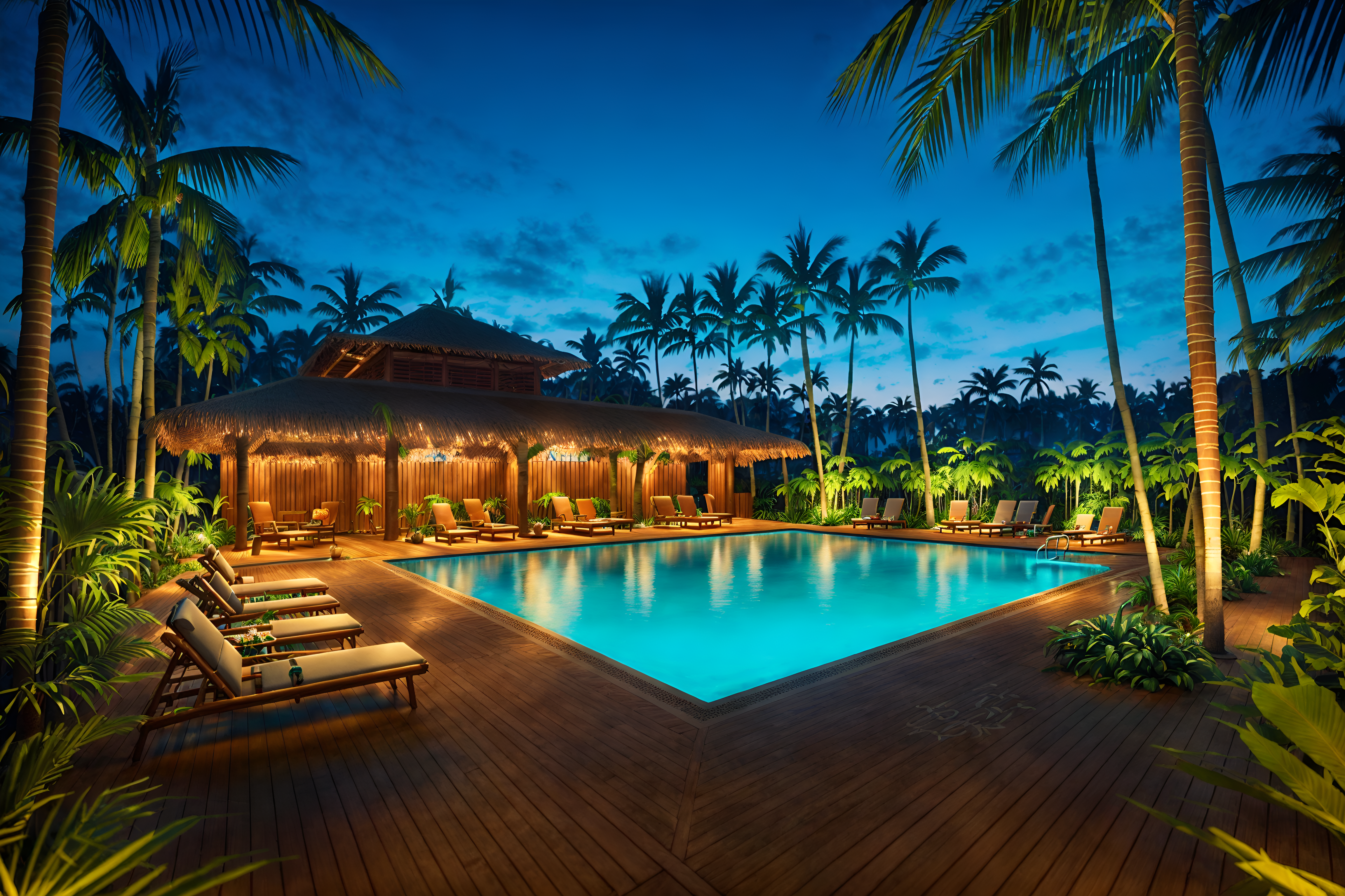 photo from pinterest of tropical-style designed (outdoor pool area ) with pool lights and pool lounge chairs and pool and pool lights. . with rattan and lattice prints and palm leaves and palm trees and wicker and teak and cane motifs and bamboo. . cinematic photo, highly detailed, cinematic lighting, ultra-detailed, ultrarealistic, photorealism, 8k. trending on pinterest. tropical design style. masterpiece, cinematic light, ultrarealistic+, photorealistic+, 8k, raw photo, realistic, sharp focus on eyes, (symmetrical eyes), (intact eyes), hyperrealistic, highest quality, best quality, , highly detailed, masterpiece, best quality, extremely detailed 8k wallpaper, masterpiece, best quality, ultra-detailed, best shadow, detailed background, detailed face, detailed eyes, high contrast, best illumination, detailed face, dulux, caustic, dynamic angle, detailed glow. dramatic lighting. highly detailed, insanely detailed hair, symmetrical, intricate details, professionally retouched, 8k high definition. strong bokeh. award winning photo.