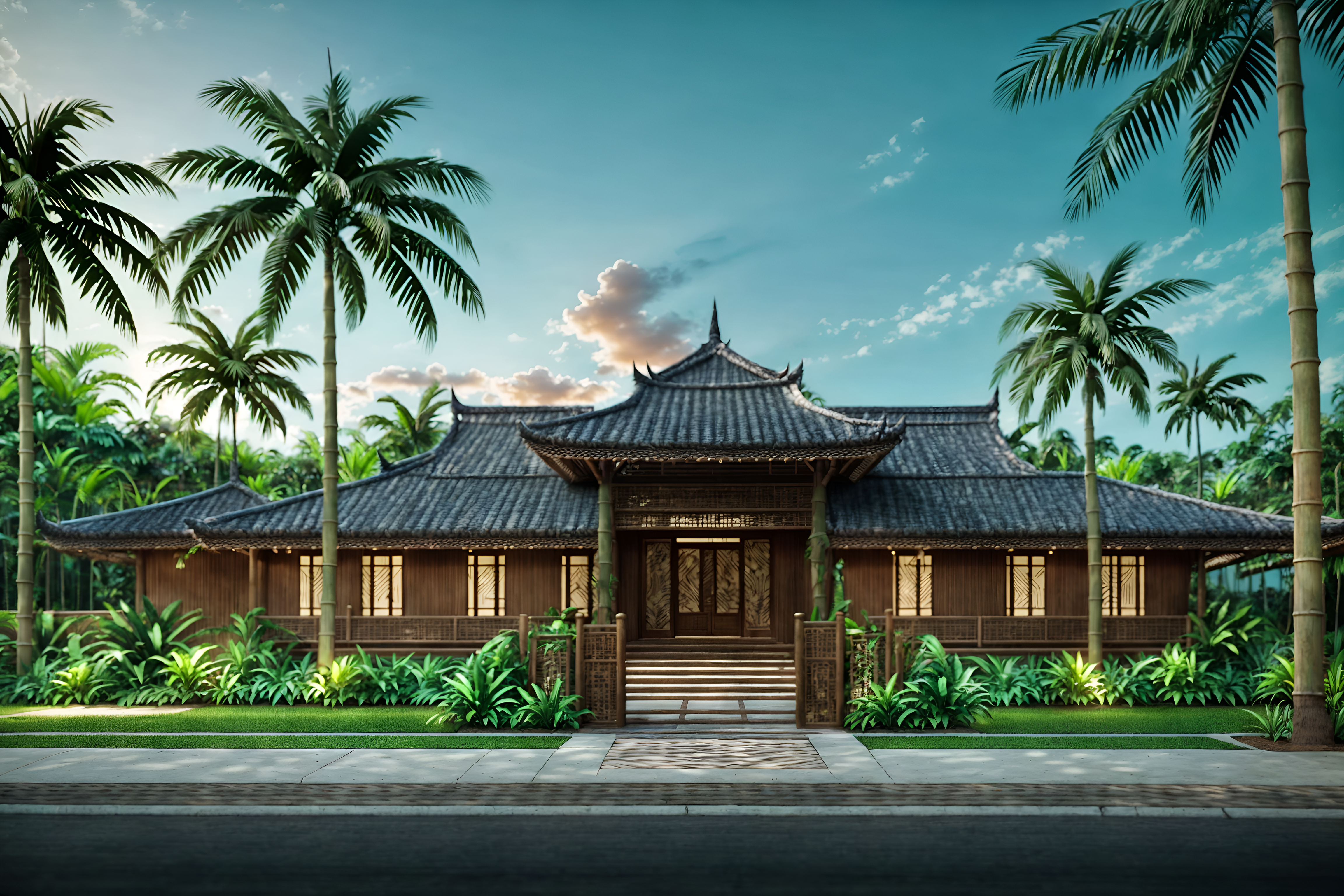 photo from pinterest of tropical-style exterior designed (house exterior exterior) . with cane motifs and bamboo and lattice prints and palm trees and wicker and teak and palm leaves and rattan. . cinematic photo, highly detailed, cinematic lighting, ultra-detailed, ultrarealistic, photorealism, 8k. trending on pinterest. tropical exterior design style. masterpiece, cinematic light, ultrarealistic+, photorealistic+, 8k, raw photo, realistic, sharp focus on eyes, (symmetrical eyes), (intact eyes), hyperrealistic, highest quality, best quality, , highly detailed, masterpiece, best quality, extremely detailed 8k wallpaper, masterpiece, best quality, ultra-detailed, best shadow, detailed background, detailed face, detailed eyes, high contrast, best illumination, detailed face, dulux, caustic, dynamic angle, detailed glow. dramatic lighting. highly detailed, insanely detailed hair, symmetrical, intricate details, professionally retouched, 8k high definition. strong bokeh. award winning photo.