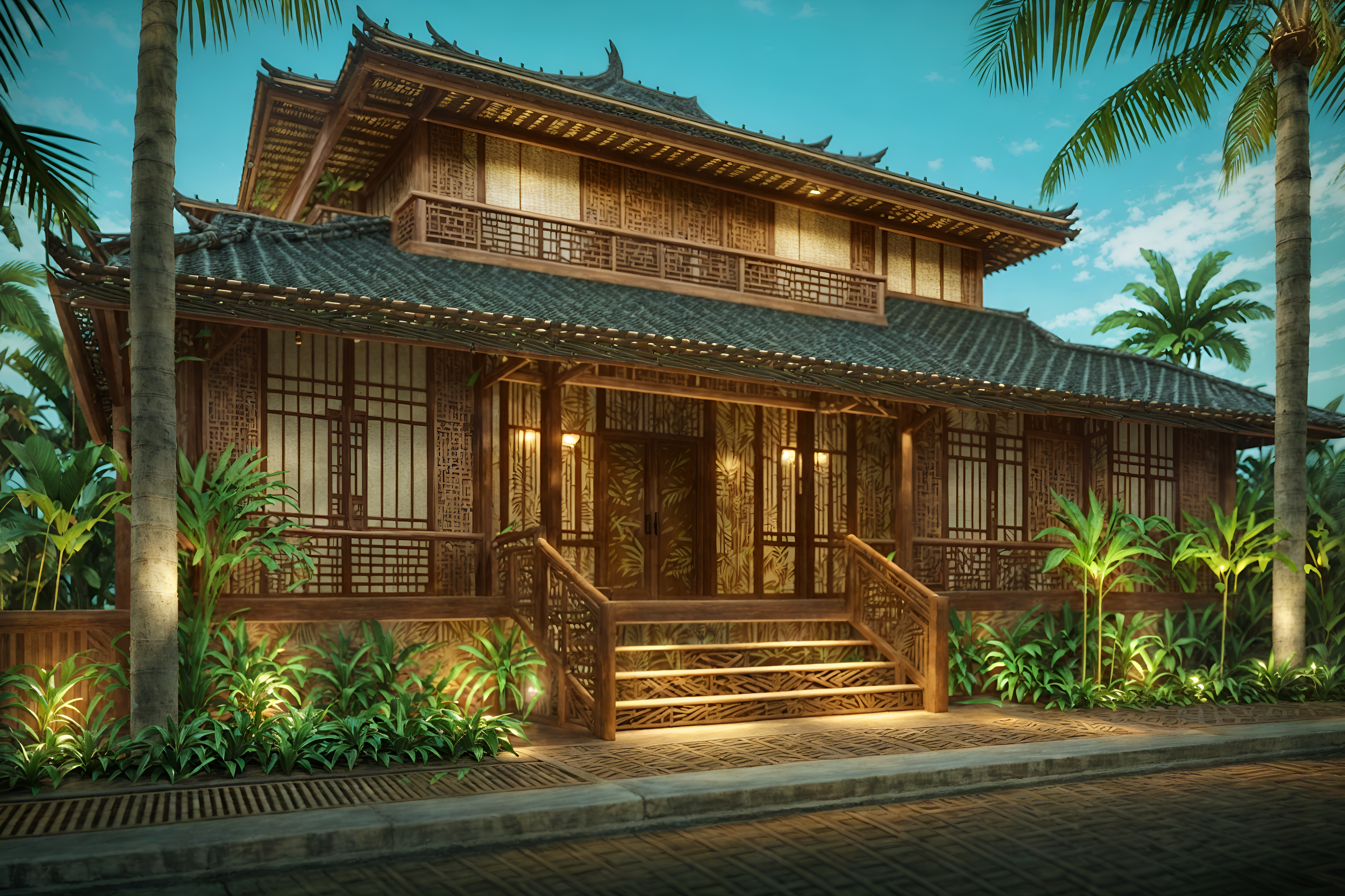 photo from pinterest of tropical-style exterior designed (house exterior exterior) . with cane motifs and bamboo and lattice prints and palm trees and wicker and teak and palm leaves and rattan. . cinematic photo, highly detailed, cinematic lighting, ultra-detailed, ultrarealistic, photorealism, 8k. trending on pinterest. tropical exterior design style. masterpiece, cinematic light, ultrarealistic+, photorealistic+, 8k, raw photo, realistic, sharp focus on eyes, (symmetrical eyes), (intact eyes), hyperrealistic, highest quality, best quality, , highly detailed, masterpiece, best quality, extremely detailed 8k wallpaper, masterpiece, best quality, ultra-detailed, best shadow, detailed background, detailed face, detailed eyes, high contrast, best illumination, detailed face, dulux, caustic, dynamic angle, detailed glow. dramatic lighting. highly detailed, insanely detailed hair, symmetrical, intricate details, professionally retouched, 8k high definition. strong bokeh. award winning photo.