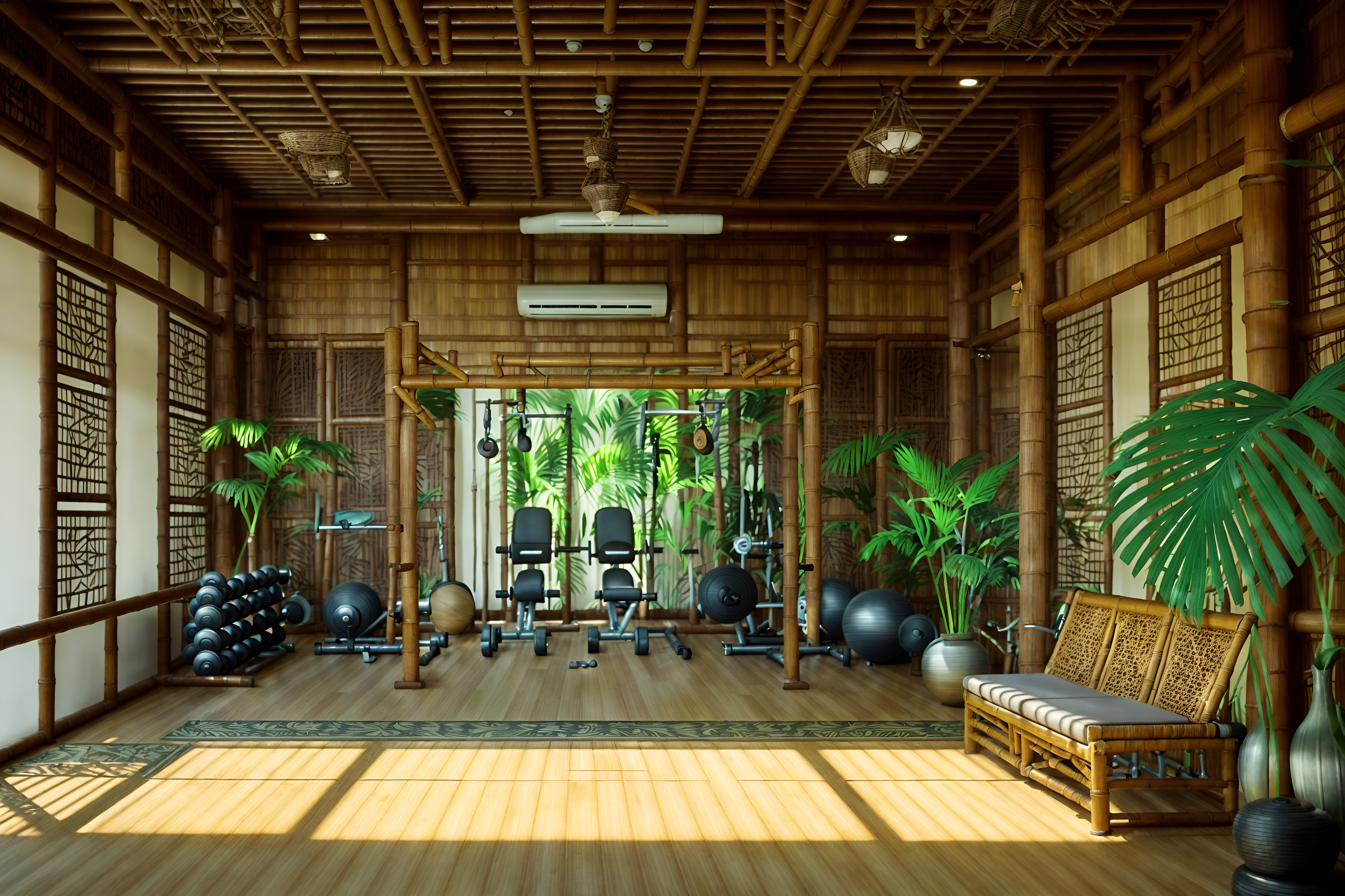 photo from pinterest of tropical-style interior designed (fitness gym interior) with squat rack and bench press and exercise bicycle and dumbbell stand and crosstrainer and squat rack. . with bamboo and teak and wicker and rattan and cane motifs and palm leaves and lattice prints and palm trees. . cinematic photo, highly detailed, cinematic lighting, ultra-detailed, ultrarealistic, photorealism, 8k. trending on pinterest. tropical interior design style. masterpiece, cinematic light, ultrarealistic+, photorealistic+, 8k, raw photo, realistic, sharp focus on eyes, (symmetrical eyes), (intact eyes), hyperrealistic, highest quality, best quality, , highly detailed, masterpiece, best quality, extremely detailed 8k wallpaper, masterpiece, best quality, ultra-detailed, best shadow, detailed background, detailed face, detailed eyes, high contrast, best illumination, detailed face, dulux, caustic, dynamic angle, detailed glow. dramatic lighting. highly detailed, insanely detailed hair, symmetrical, intricate details, professionally retouched, 8k high definition. strong bokeh. award winning photo.