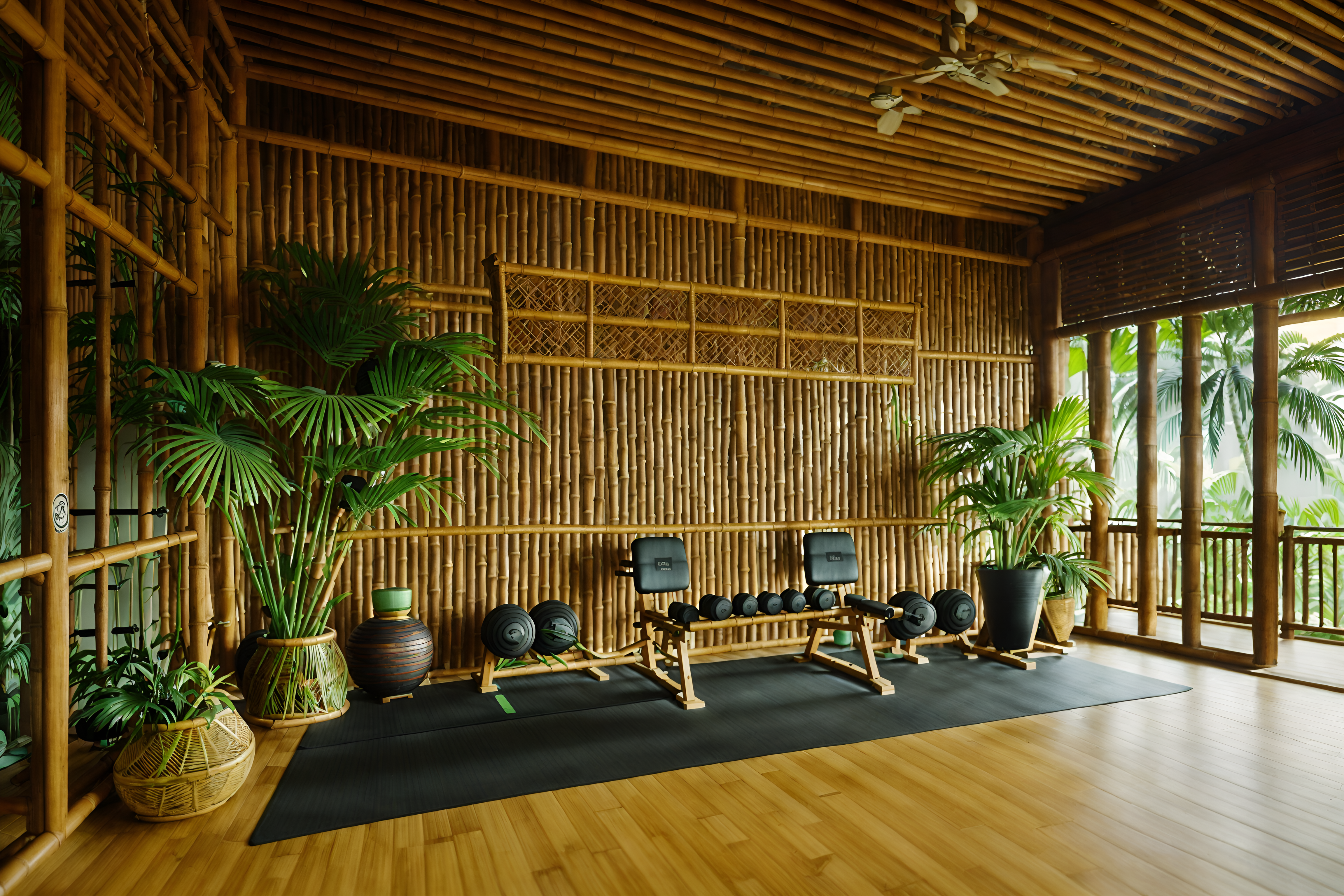 photo from pinterest of tropical-style interior designed (fitness gym interior) with squat rack and bench press and exercise bicycle and dumbbell stand and crosstrainer and squat rack. . with bamboo and teak and wicker and rattan and cane motifs and palm leaves and lattice prints and palm trees. . cinematic photo, highly detailed, cinematic lighting, ultra-detailed, ultrarealistic, photorealism, 8k. trending on pinterest. tropical interior design style. masterpiece, cinematic light, ultrarealistic+, photorealistic+, 8k, raw photo, realistic, sharp focus on eyes, (symmetrical eyes), (intact eyes), hyperrealistic, highest quality, best quality, , highly detailed, masterpiece, best quality, extremely detailed 8k wallpaper, masterpiece, best quality, ultra-detailed, best shadow, detailed background, detailed face, detailed eyes, high contrast, best illumination, detailed face, dulux, caustic, dynamic angle, detailed glow. dramatic lighting. highly detailed, insanely detailed hair, symmetrical, intricate details, professionally retouched, 8k high definition. strong bokeh. award winning photo.