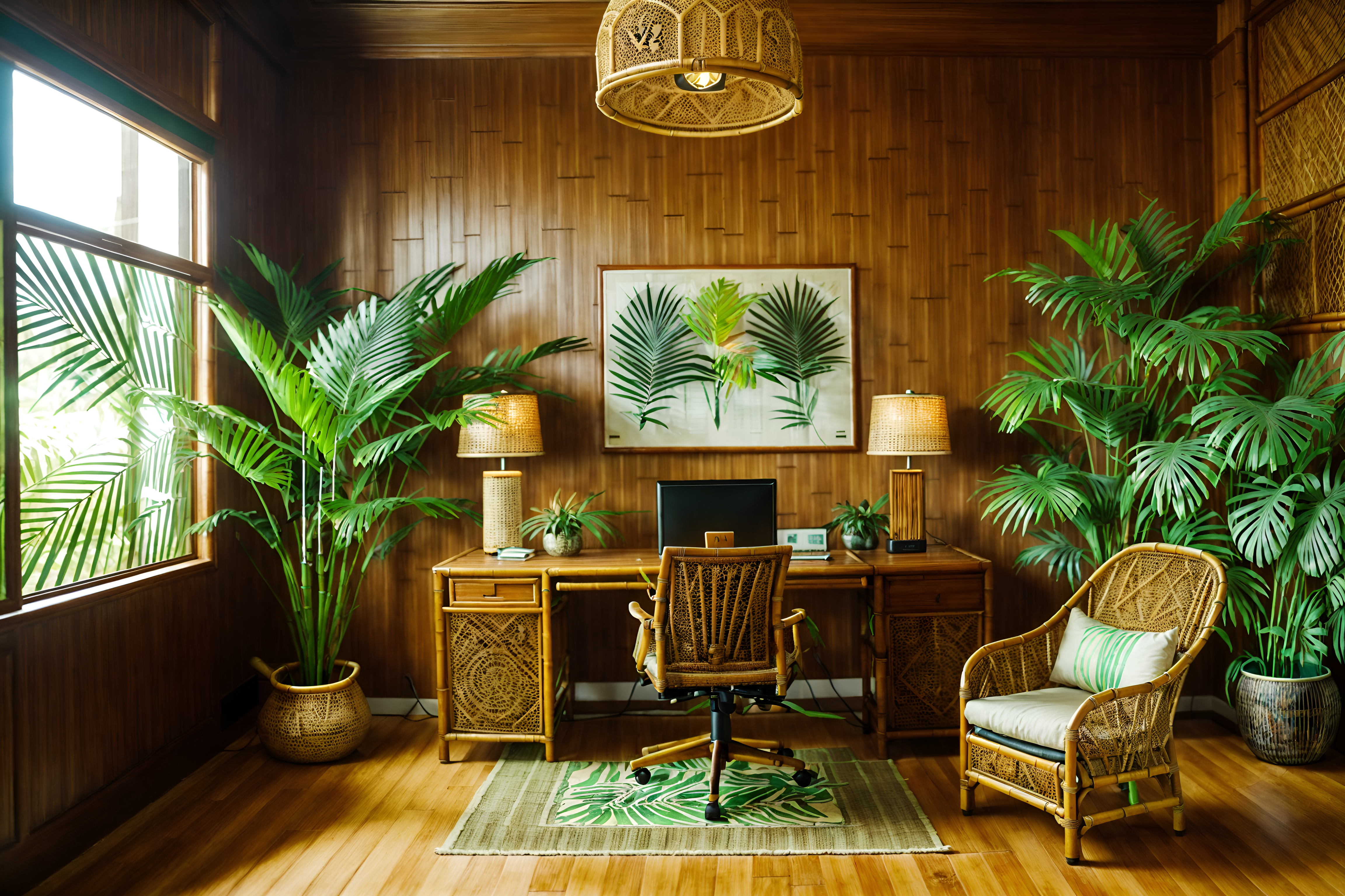 photo from pinterest of tropical-style interior designed (home office interior) with cabinets and plant and computer desk and desk lamp and office chair and cabinets. . with bamboo and palm leaves and lattice prints and rattan and palm trees and wicker and cane motifs and teak. . cinematic photo, highly detailed, cinematic lighting, ultra-detailed, ultrarealistic, photorealism, 8k. trending on pinterest. tropical interior design style. masterpiece, cinematic light, ultrarealistic+, photorealistic+, 8k, raw photo, realistic, sharp focus on eyes, (symmetrical eyes), (intact eyes), hyperrealistic, highest quality, best quality, , highly detailed, masterpiece, best quality, extremely detailed 8k wallpaper, masterpiece, best quality, ultra-detailed, best shadow, detailed background, detailed face, detailed eyes, high contrast, best illumination, detailed face, dulux, caustic, dynamic angle, detailed glow. dramatic lighting. highly detailed, insanely detailed hair, symmetrical, intricate details, professionally retouched, 8k high definition. strong bokeh. award winning photo.