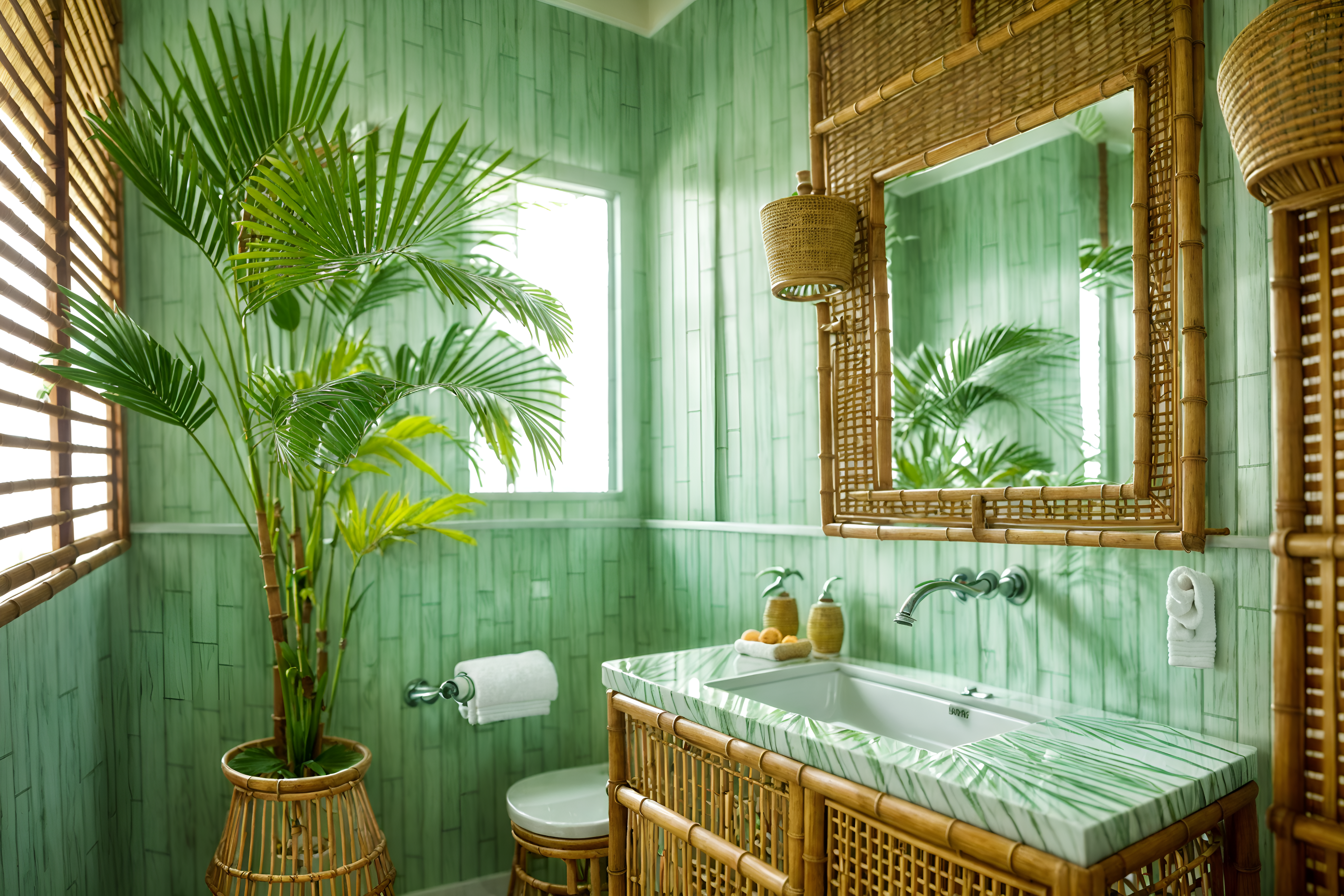 photo from pinterest of tropical-style interior designed (hotel bathroom interior) with bathroom cabinet and mirror and bathroom sink with faucet and bath towel and bathtub and shower and toilet seat and plant. . with cane motifs and rattan and lattice prints and wicker and teak and palm leaves and palm trees and bamboo. . cinematic photo, highly detailed, cinematic lighting, ultra-detailed, ultrarealistic, photorealism, 8k. trending on pinterest. tropical interior design style. masterpiece, cinematic light, ultrarealistic+, photorealistic+, 8k, raw photo, realistic, sharp focus on eyes, (symmetrical eyes), (intact eyes), hyperrealistic, highest quality, best quality, , highly detailed, masterpiece, best quality, extremely detailed 8k wallpaper, masterpiece, best quality, ultra-detailed, best shadow, detailed background, detailed face, detailed eyes, high contrast, best illumination, detailed face, dulux, caustic, dynamic angle, detailed glow. dramatic lighting. highly detailed, insanely detailed hair, symmetrical, intricate details, professionally retouched, 8k high definition. strong bokeh. award winning photo.