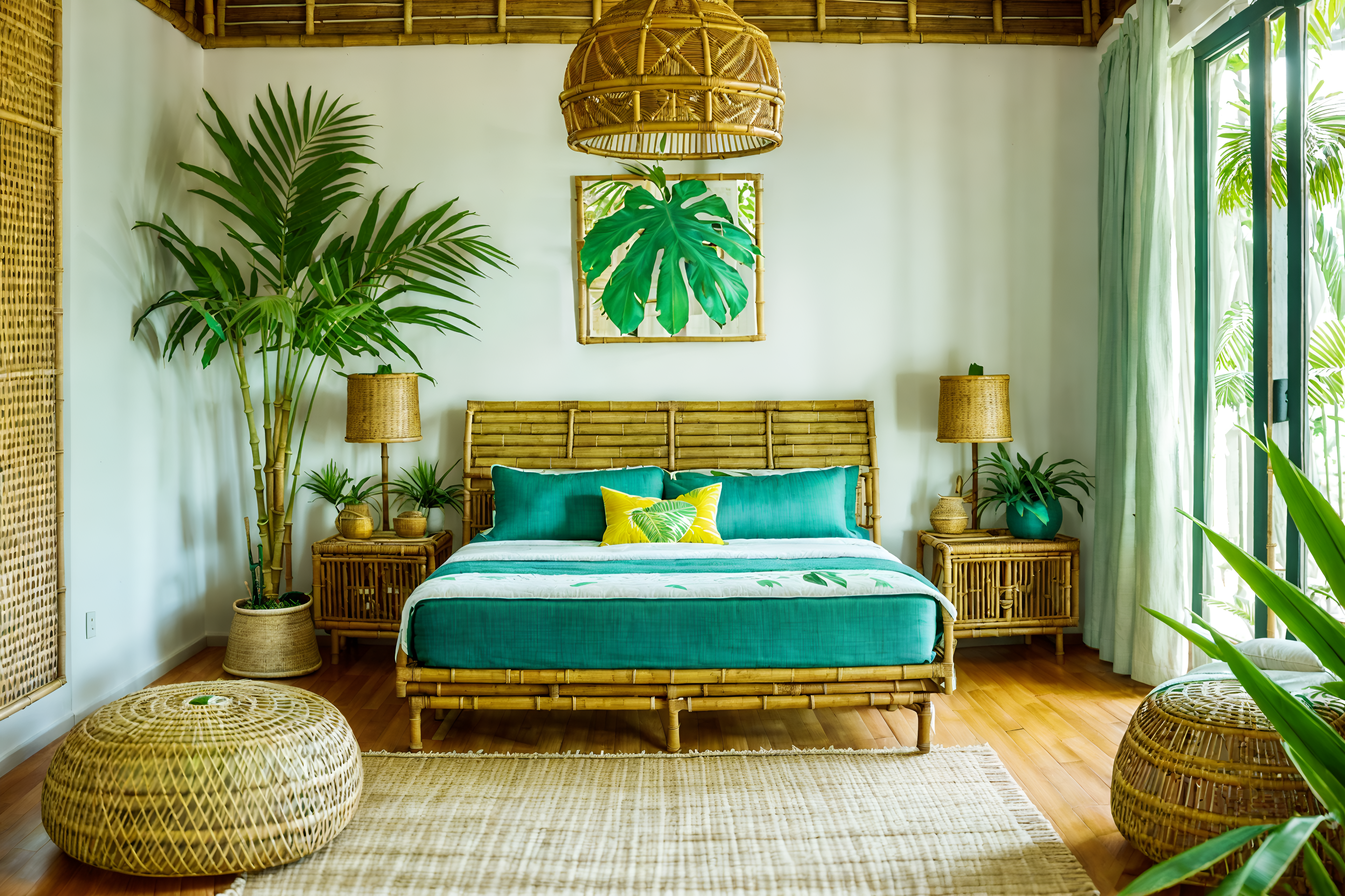photo from pinterest of tropical-style interior designed (kids room interior) with headboard and accent chair and storage bench or ottoman and plant and bed and bedside table or night stand and night light and mirror. . with palm leaves and wicker and teak and cane motifs and rattan and lattice prints and palm trees and bamboo. . cinematic photo, highly detailed, cinematic lighting, ultra-detailed, ultrarealistic, photorealism, 8k. trending on pinterest. tropical interior design style. masterpiece, cinematic light, ultrarealistic+, photorealistic+, 8k, raw photo, realistic, sharp focus on eyes, (symmetrical eyes), (intact eyes), hyperrealistic, highest quality, best quality, , highly detailed, masterpiece, best quality, extremely detailed 8k wallpaper, masterpiece, best quality, ultra-detailed, best shadow, detailed background, detailed face, detailed eyes, high contrast, best illumination, detailed face, dulux, caustic, dynamic angle, detailed glow. dramatic lighting. highly detailed, insanely detailed hair, symmetrical, intricate details, professionally retouched, 8k high definition. strong bokeh. award winning photo.