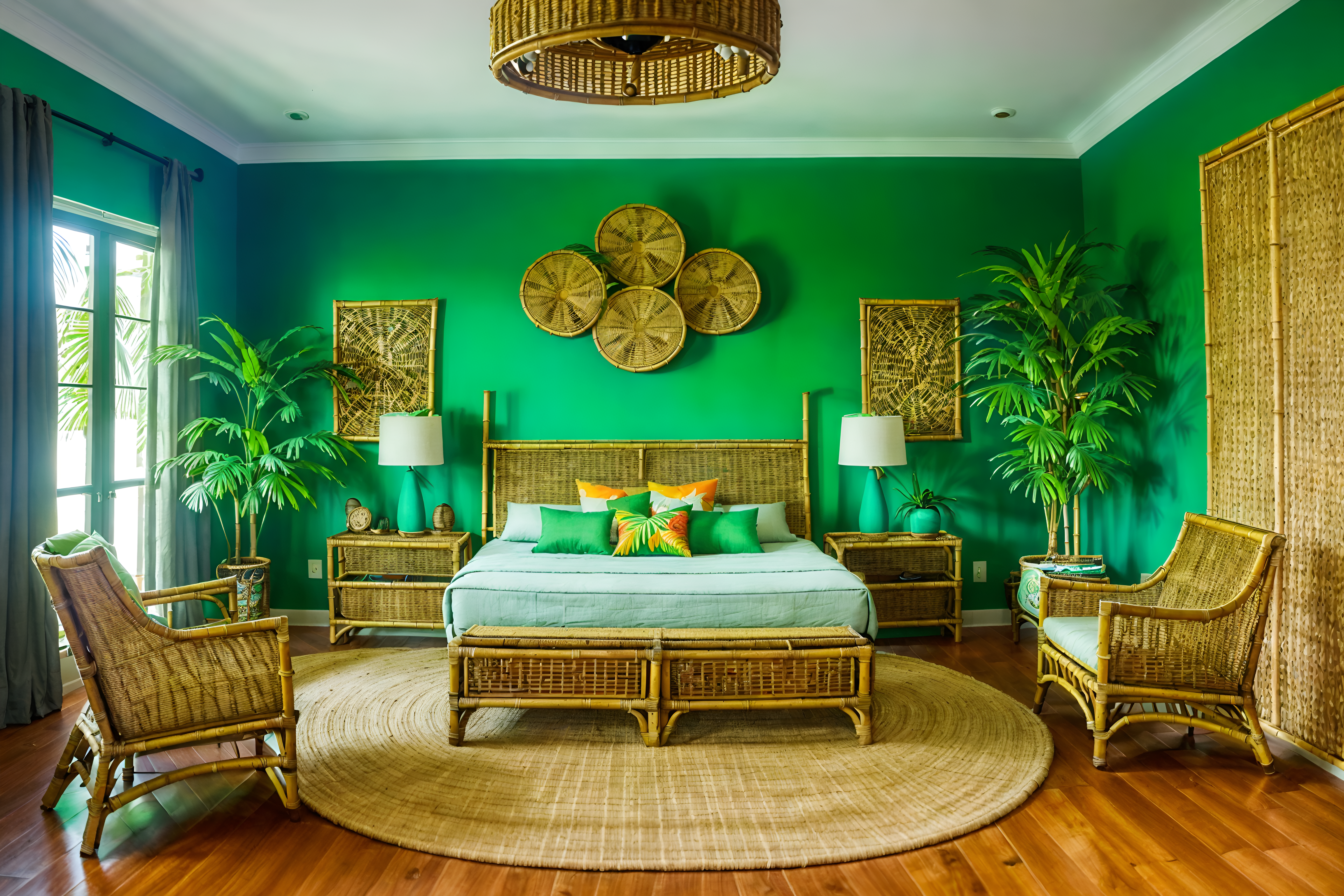 photo from pinterest of tropical-style interior designed (kids room interior) with headboard and accent chair and storage bench or ottoman and plant and bed and bedside table or night stand and night light and mirror. . with palm leaves and wicker and teak and cane motifs and rattan and lattice prints and palm trees and bamboo. . cinematic photo, highly detailed, cinematic lighting, ultra-detailed, ultrarealistic, photorealism, 8k. trending on pinterest. tropical interior design style. masterpiece, cinematic light, ultrarealistic+, photorealistic+, 8k, raw photo, realistic, sharp focus on eyes, (symmetrical eyes), (intact eyes), hyperrealistic, highest quality, best quality, , highly detailed, masterpiece, best quality, extremely detailed 8k wallpaper, masterpiece, best quality, ultra-detailed, best shadow, detailed background, detailed face, detailed eyes, high contrast, best illumination, detailed face, dulux, caustic, dynamic angle, detailed glow. dramatic lighting. highly detailed, insanely detailed hair, symmetrical, intricate details, professionally retouched, 8k high definition. strong bokeh. award winning photo.
