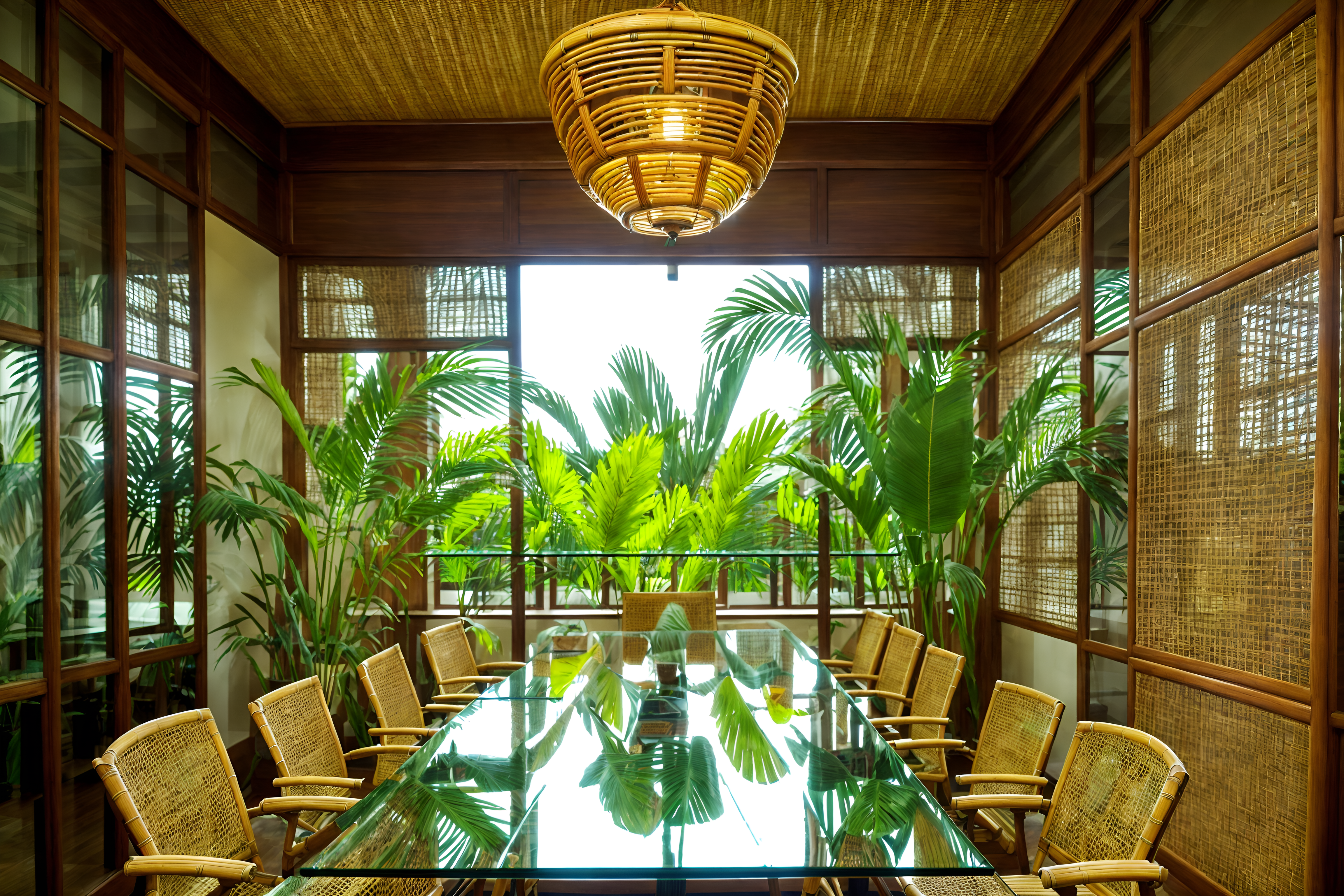 photo from pinterest of tropical-style interior designed (meeting room interior) with office chairs and boardroom table and glass walls and vase and painting or photo on wall and plant and cabinets and glass doors. . with palm leaves and teak and lattice prints and wicker and rattan and cane motifs and palm trees and bamboo. . cinematic photo, highly detailed, cinematic lighting, ultra-detailed, ultrarealistic, photorealism, 8k. trending on pinterest. tropical interior design style. masterpiece, cinematic light, ultrarealistic+, photorealistic+, 8k, raw photo, realistic, sharp focus on eyes, (symmetrical eyes), (intact eyes), hyperrealistic, highest quality, best quality, , highly detailed, masterpiece, best quality, extremely detailed 8k wallpaper, masterpiece, best quality, ultra-detailed, best shadow, detailed background, detailed face, detailed eyes, high contrast, best illumination, detailed face, dulux, caustic, dynamic angle, detailed glow. dramatic lighting. highly detailed, insanely detailed hair, symmetrical, intricate details, professionally retouched, 8k high definition. strong bokeh. award winning photo.
