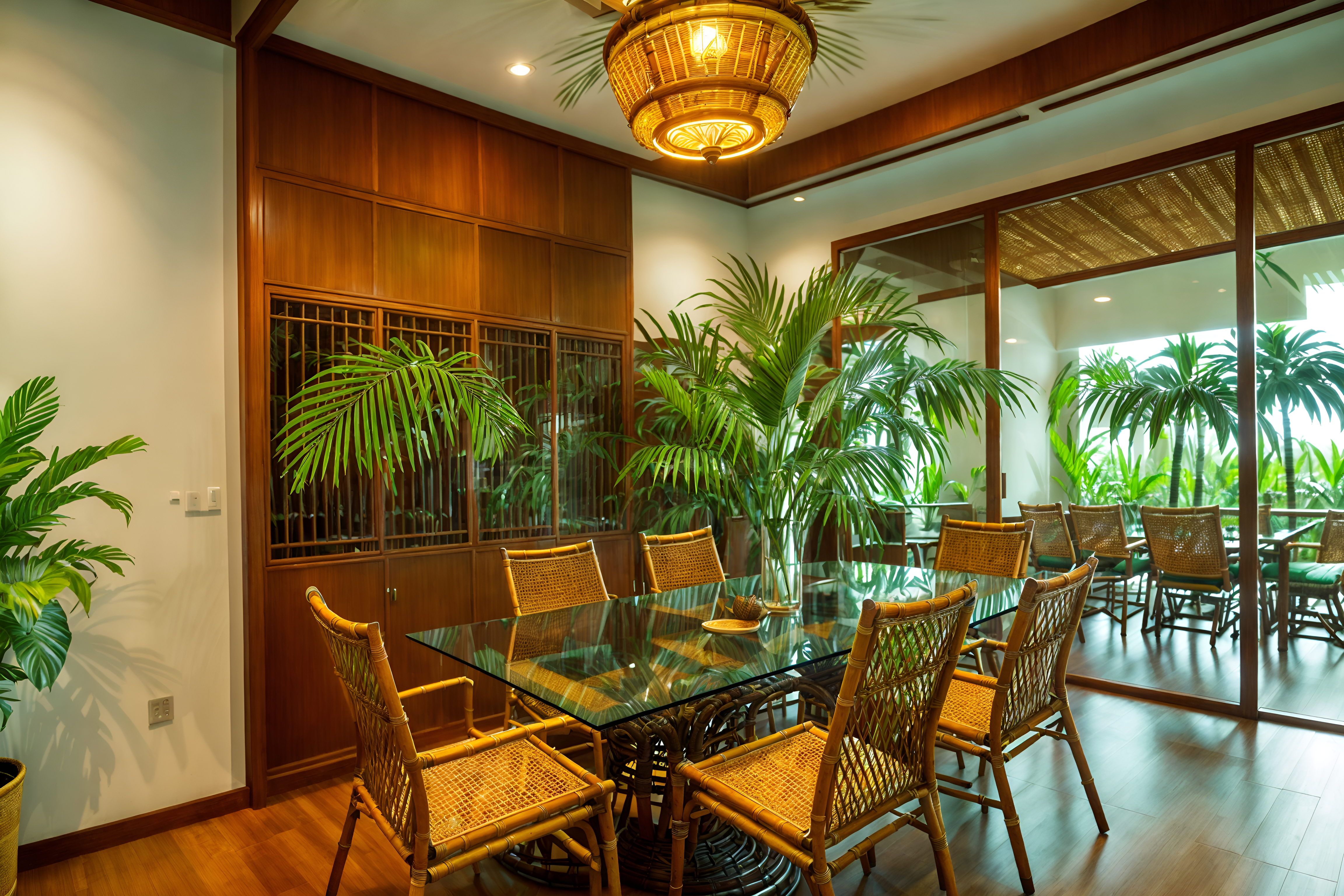 photo from pinterest of tropical-style interior designed (meeting room interior) with office chairs and boardroom table and glass walls and vase and painting or photo on wall and plant and cabinets and glass doors. . with palm leaves and teak and lattice prints and wicker and rattan and cane motifs and palm trees and bamboo. . cinematic photo, highly detailed, cinematic lighting, ultra-detailed, ultrarealistic, photorealism, 8k. trending on pinterest. tropical interior design style. masterpiece, cinematic light, ultrarealistic+, photorealistic+, 8k, raw photo, realistic, sharp focus on eyes, (symmetrical eyes), (intact eyes), hyperrealistic, highest quality, best quality, , highly detailed, masterpiece, best quality, extremely detailed 8k wallpaper, masterpiece, best quality, ultra-detailed, best shadow, detailed background, detailed face, detailed eyes, high contrast, best illumination, detailed face, dulux, caustic, dynamic angle, detailed glow. dramatic lighting. highly detailed, insanely detailed hair, symmetrical, intricate details, professionally retouched, 8k high definition. strong bokeh. award winning photo.