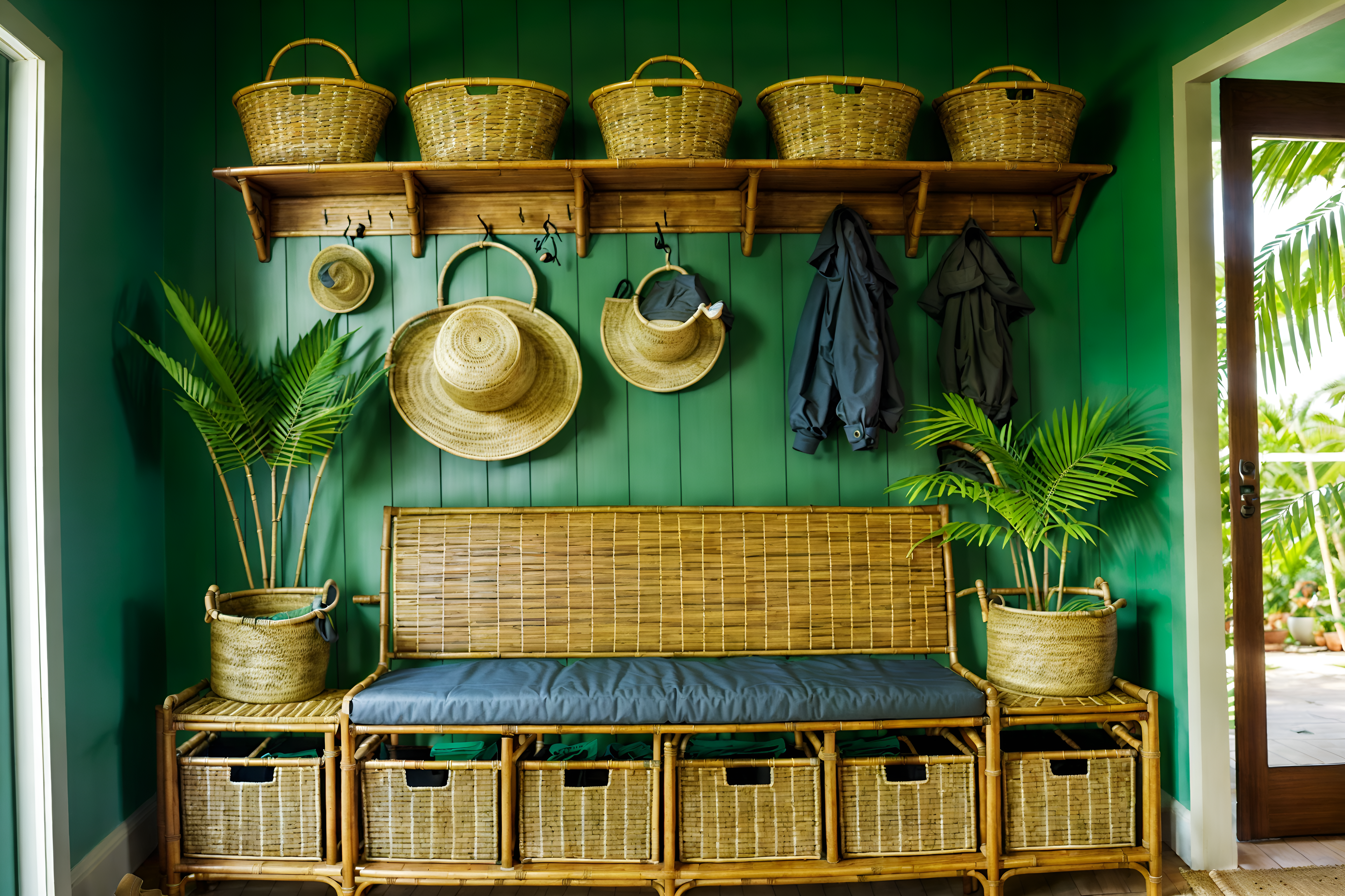 photo from pinterest of tropical-style interior designed (mudroom interior) with storage baskets and wall hooks for coats and shelves for shoes and a bench and high up storage and cabinets and storage drawers and cubbies. . with rattan and teak and palm trees and wicker and bamboo and cane motifs and lattice prints and palm leaves. . cinematic photo, highly detailed, cinematic lighting, ultra-detailed, ultrarealistic, photorealism, 8k. trending on pinterest. tropical interior design style. masterpiece, cinematic light, ultrarealistic+, photorealistic+, 8k, raw photo, realistic, sharp focus on eyes, (symmetrical eyes), (intact eyes), hyperrealistic, highest quality, best quality, , highly detailed, masterpiece, best quality, extremely detailed 8k wallpaper, masterpiece, best quality, ultra-detailed, best shadow, detailed background, detailed face, detailed eyes, high contrast, best illumination, detailed face, dulux, caustic, dynamic angle, detailed glow. dramatic lighting. highly detailed, insanely detailed hair, symmetrical, intricate details, professionally retouched, 8k high definition. strong bokeh. award winning photo.