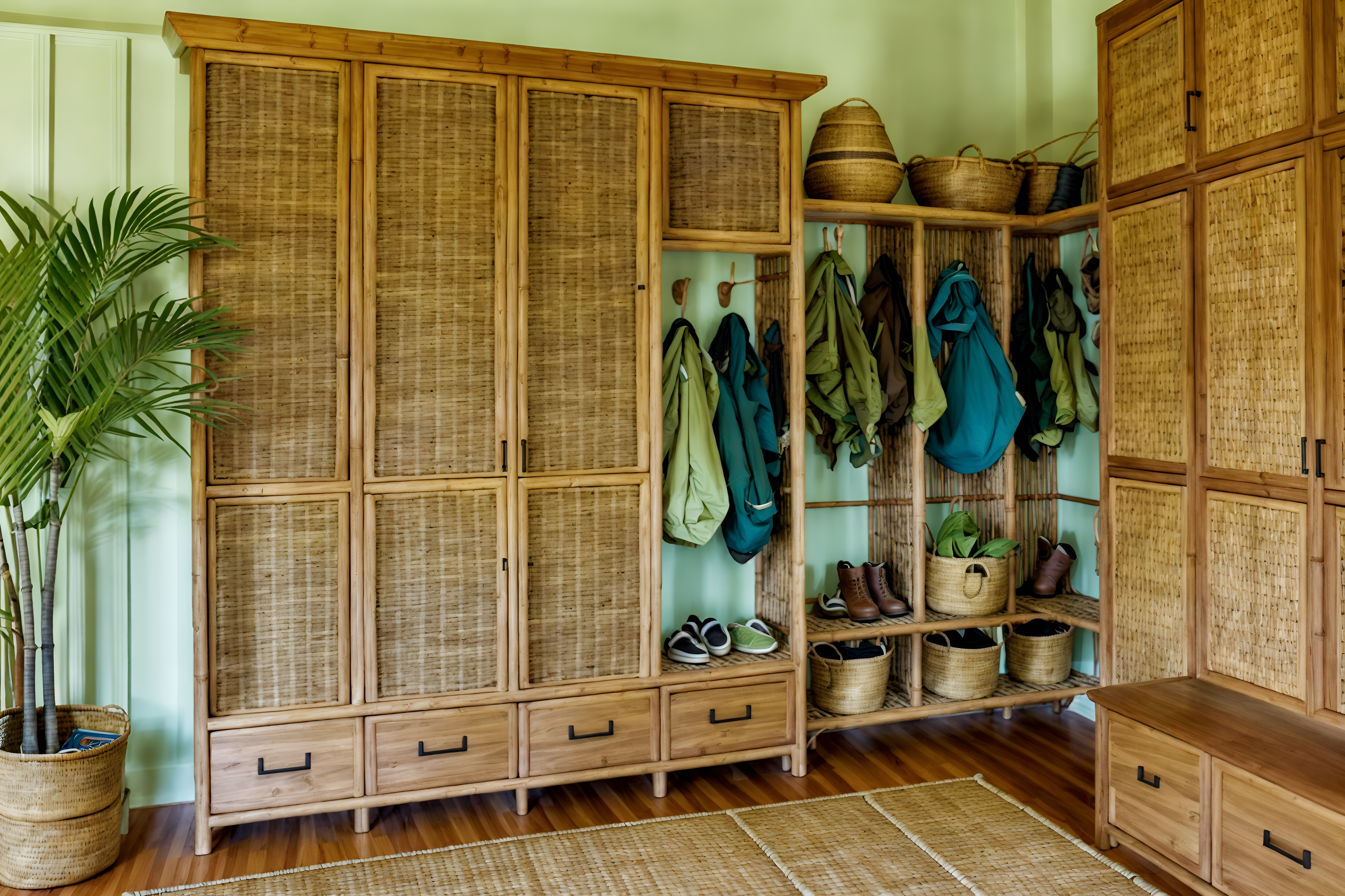 photo from pinterest of tropical-style interior designed (mudroom interior) with storage baskets and wall hooks for coats and shelves for shoes and a bench and high up storage and cabinets and storage drawers and cubbies. . with rattan and teak and palm trees and wicker and bamboo and cane motifs and lattice prints and palm leaves. . cinematic photo, highly detailed, cinematic lighting, ultra-detailed, ultrarealistic, photorealism, 8k. trending on pinterest. tropical interior design style. masterpiece, cinematic light, ultrarealistic+, photorealistic+, 8k, raw photo, realistic, sharp focus on eyes, (symmetrical eyes), (intact eyes), hyperrealistic, highest quality, best quality, , highly detailed, masterpiece, best quality, extremely detailed 8k wallpaper, masterpiece, best quality, ultra-detailed, best shadow, detailed background, detailed face, detailed eyes, high contrast, best illumination, detailed face, dulux, caustic, dynamic angle, detailed glow. dramatic lighting. highly detailed, insanely detailed hair, symmetrical, intricate details, professionally retouched, 8k high definition. strong bokeh. award winning photo.