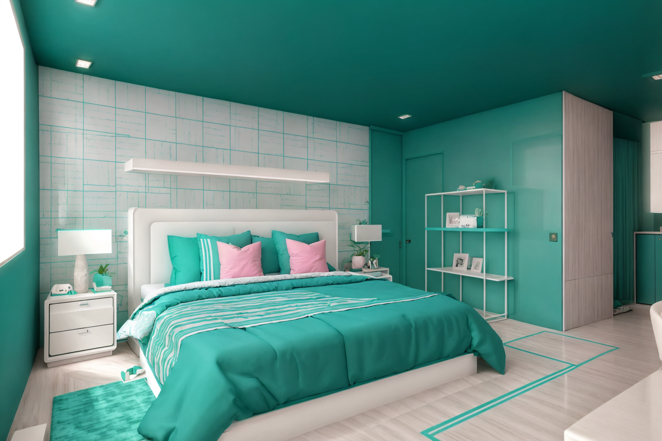 Photo from Pinterest of Vaporwave-style interior designed (bedroom interior) With bed and accent chair and storage bench or ottoman and headboard and bedside table or night stand and mirror and plant and dresser closet. . With white square bathroom tiles and teal colors and palm trees and neon glow and white square bathroom tiles and white square bathroom tiles and bright pink and baby blue. . Cinematic photo, highly detailed, cinematic lighting, ultra-detailed, ultrarealistic, photorealism, 8k. Trending on Pinterest. Vaporwave interior design style