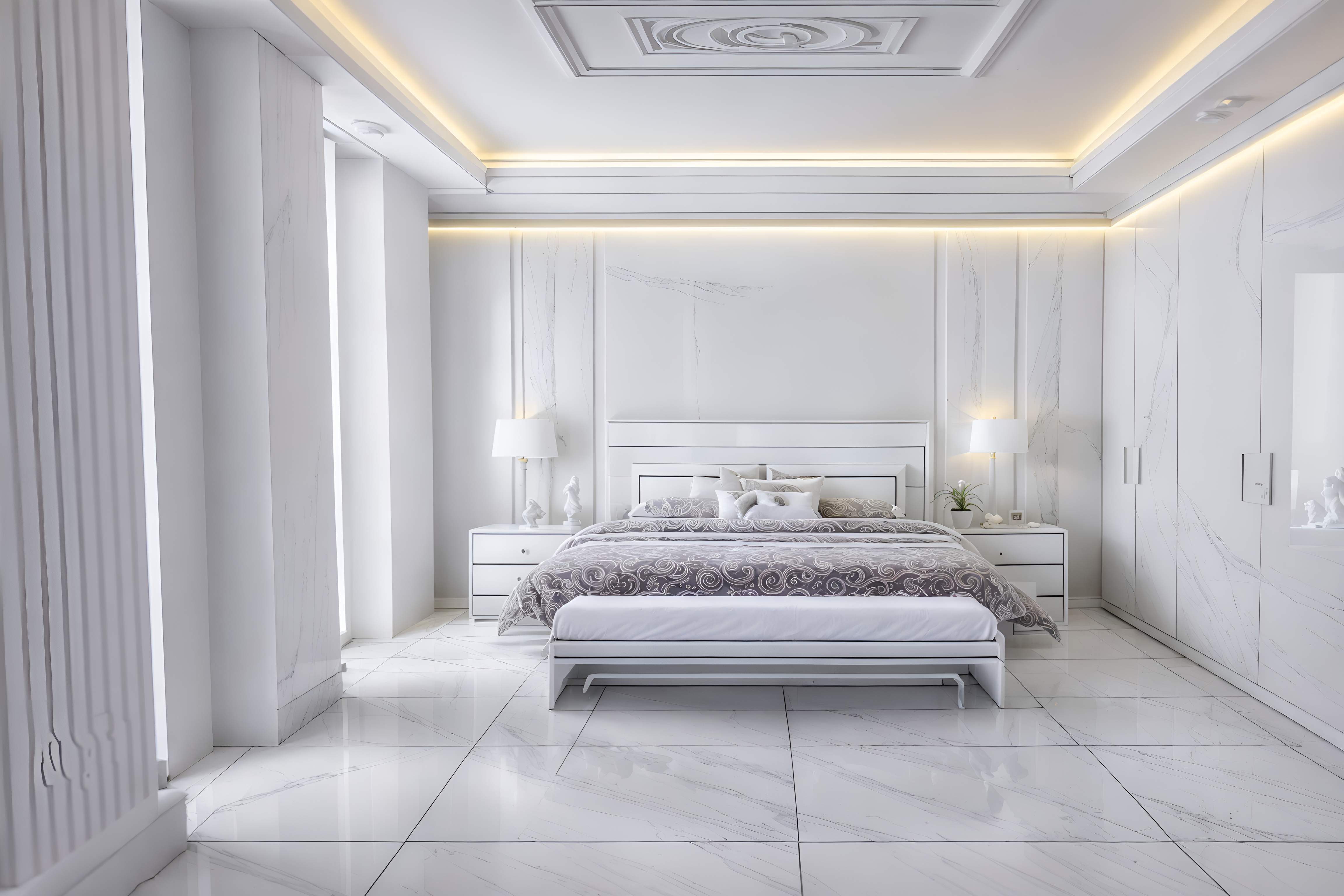 photo from pinterest of vaporwave-style interior designed (bedroom interior) with storage bench or ottoman and dresser closet and mirror and bedside table or night stand and bed and headboard and night light and plant. . with white square bathroom tiles and white square bathroom tiles and neon glow and white roman statues, white roman sculptures, white roman columns, white roman pillars in the center of the room, and purple lights and white square bathroom tiles and hanging plants and teal colors. . cinematic photo, highly detailed, cinematic lighting, ultra-detailed, ultrarealistic, photorealism, 8k. trending on pinterest. vaporwave interior design style. masterpiece, cinematic light, ultrarealistic+, photorealistic+, 8k, raw photo, realistic, sharp focus on eyes, (symmetrical eyes), (intact eyes), hyperrealistic, highest quality, best quality, , highly detailed, masterpiece, best quality, extremely detailed 8k wallpaper, masterpiece, best quality, ultra-detailed, best shadow, detailed background, detailed face, detailed eyes, high contrast, best illumination, detailed face, dulux, caustic, dynamic angle, detailed glow. dramatic lighting. highly detailed, insanely detailed hair, symmetrical, intricate details, professionally retouched, 8k high definition. strong bokeh. award winning photo.