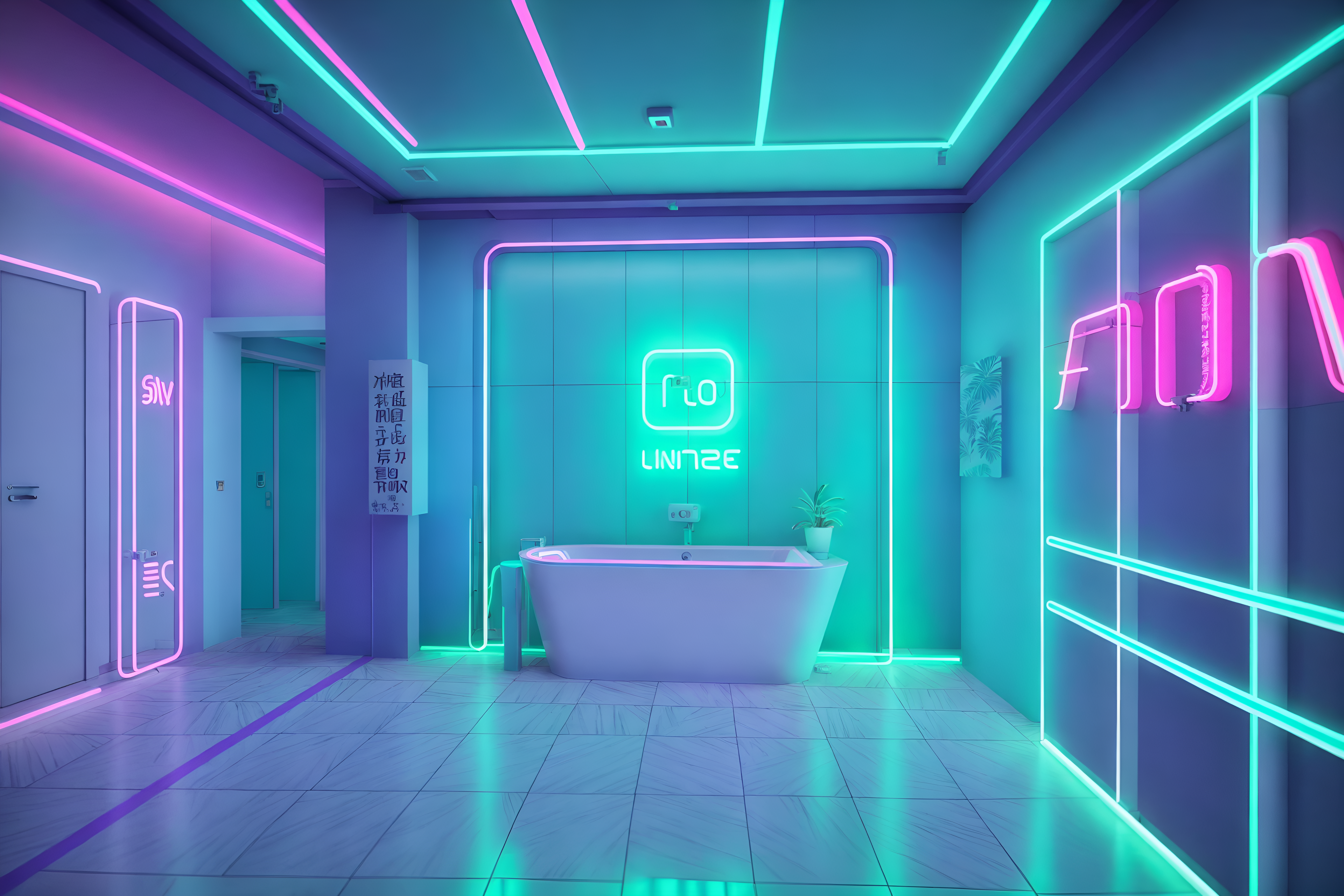 photo from pinterest of vaporwave-style interior designed (clothing store interior) . with neon glow and japanese letters on wall and baby blue and neon glow and palm trees and purple lights and teal colors and white square bathroom tiles. . cinematic photo, highly detailed, cinematic lighting, ultra-detailed, ultrarealistic, photorealism, 8k. trending on pinterest. vaporwave interior design style. masterpiece, cinematic light, ultrarealistic+, photorealistic+, 8k, raw photo, realistic, sharp focus on eyes, (symmetrical eyes), (intact eyes), hyperrealistic, highest quality, best quality, , highly detailed, masterpiece, best quality, extremely detailed 8k wallpaper, masterpiece, best quality, ultra-detailed, best shadow, detailed background, detailed face, detailed eyes, high contrast, best illumination, detailed face, dulux, caustic, dynamic angle, detailed glow. dramatic lighting. highly detailed, insanely detailed hair, symmetrical, intricate details, professionally retouched, 8k high definition. strong bokeh. award winning photo.