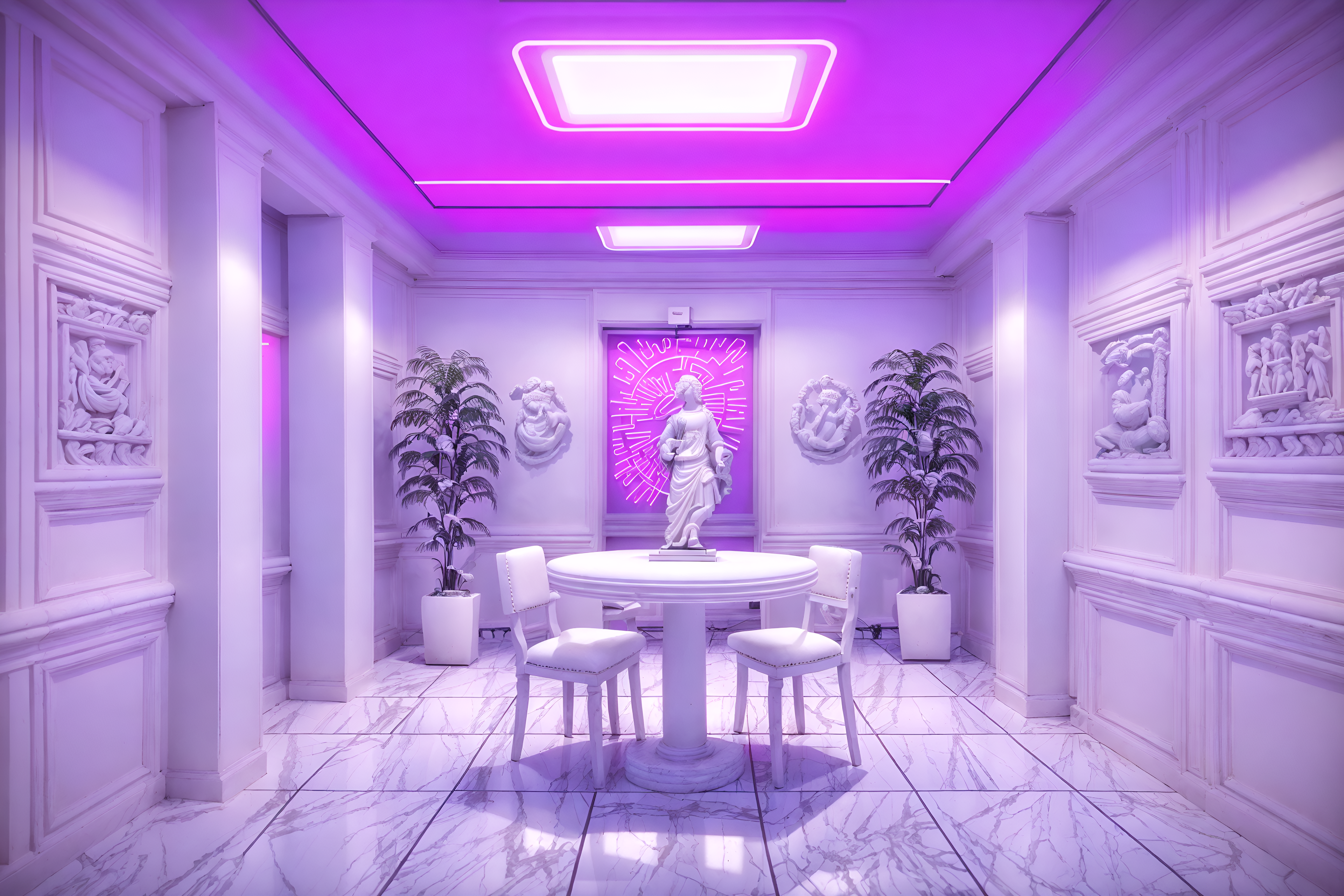 photo from pinterest of vaporwave-style interior designed (coffee shop interior) . with white roman statues, white roman sculptures, white roman columns, white roman pillars in the center of the room, and palm trees and palm trees and purple lights and neon glow and japanese letters on wall and purple lights and white square bathroom tiles. . cinematic photo, highly detailed, cinematic lighting, ultra-detailed, ultrarealistic, photorealism, 8k. trending on pinterest. vaporwave interior design style. masterpiece, cinematic light, ultrarealistic+, photorealistic+, 8k, raw photo, realistic, sharp focus on eyes, (symmetrical eyes), (intact eyes), hyperrealistic, highest quality, best quality, , highly detailed, masterpiece, best quality, extremely detailed 8k wallpaper, masterpiece, best quality, ultra-detailed, best shadow, detailed background, detailed face, detailed eyes, high contrast, best illumination, detailed face, dulux, caustic, dynamic angle, detailed glow. dramatic lighting. highly detailed, insanely detailed hair, symmetrical, intricate details, professionally retouched, 8k high definition. strong bokeh. award winning photo.