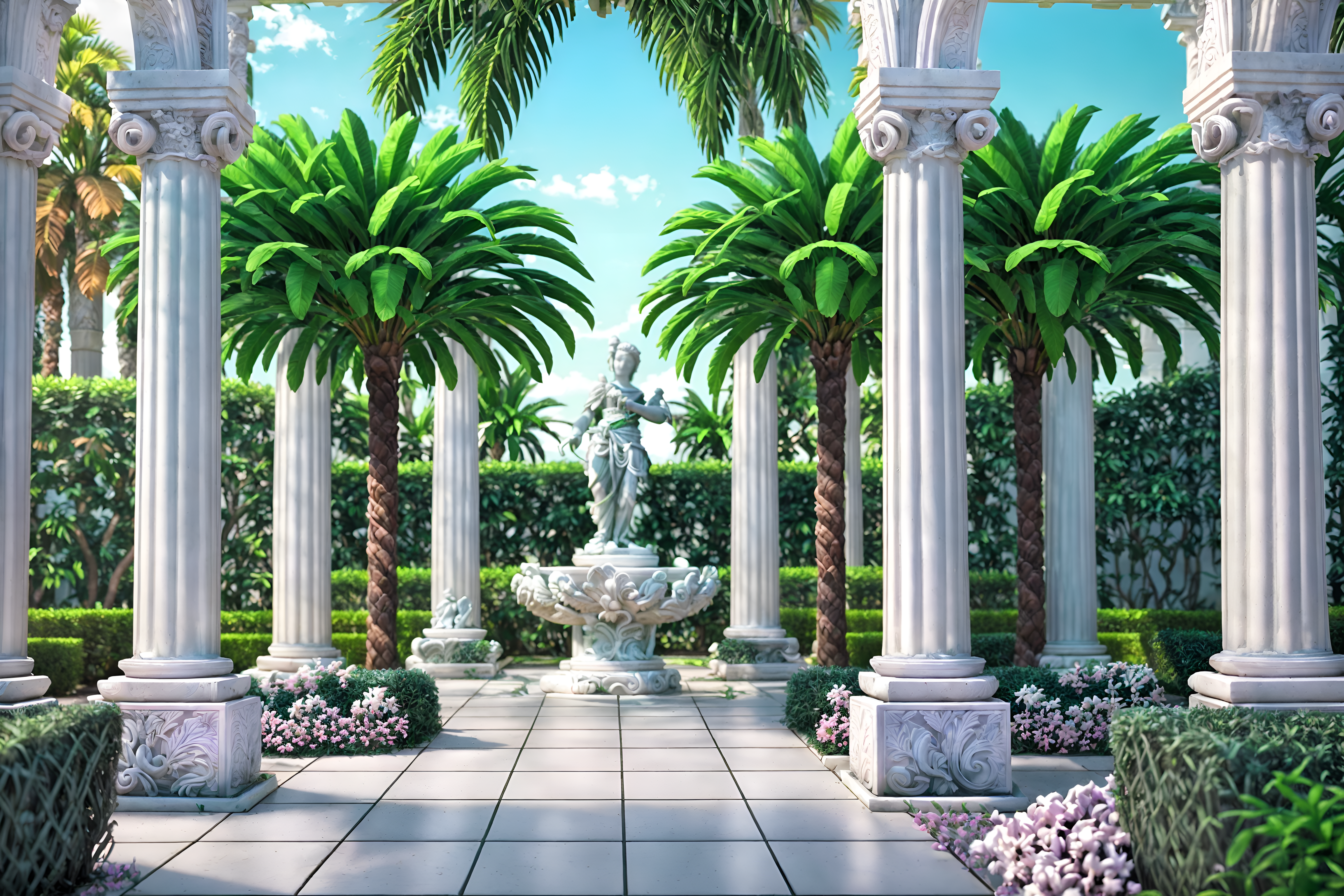 photo from pinterest of vaporwave-style designed (outdoor garden ) with garden tree and garden plants and grass and garden tree. . with purple lights and palm trees and purple lights and white roman statues, white roman sculptures, white roman columns, white roman pillars in the center of the room, and neon glow and baby blue and bright pink and white square bathroom tiles. . cinematic photo, highly detailed, cinematic lighting, ultra-detailed, ultrarealistic, photorealism, 8k. trending on pinterest. vaporwave design style. masterpiece, cinematic light, ultrarealistic+, photorealistic+, 8k, raw photo, realistic, sharp focus on eyes, (symmetrical eyes), (intact eyes), hyperrealistic, highest quality, best quality, , highly detailed, masterpiece, best quality, extremely detailed 8k wallpaper, masterpiece, best quality, ultra-detailed, best shadow, detailed background, detailed face, detailed eyes, high contrast, best illumination, detailed face, dulux, caustic, dynamic angle, detailed glow. dramatic lighting. highly detailed, insanely detailed hair, symmetrical, intricate details, professionally retouched, 8k high definition. strong bokeh. award winning photo.