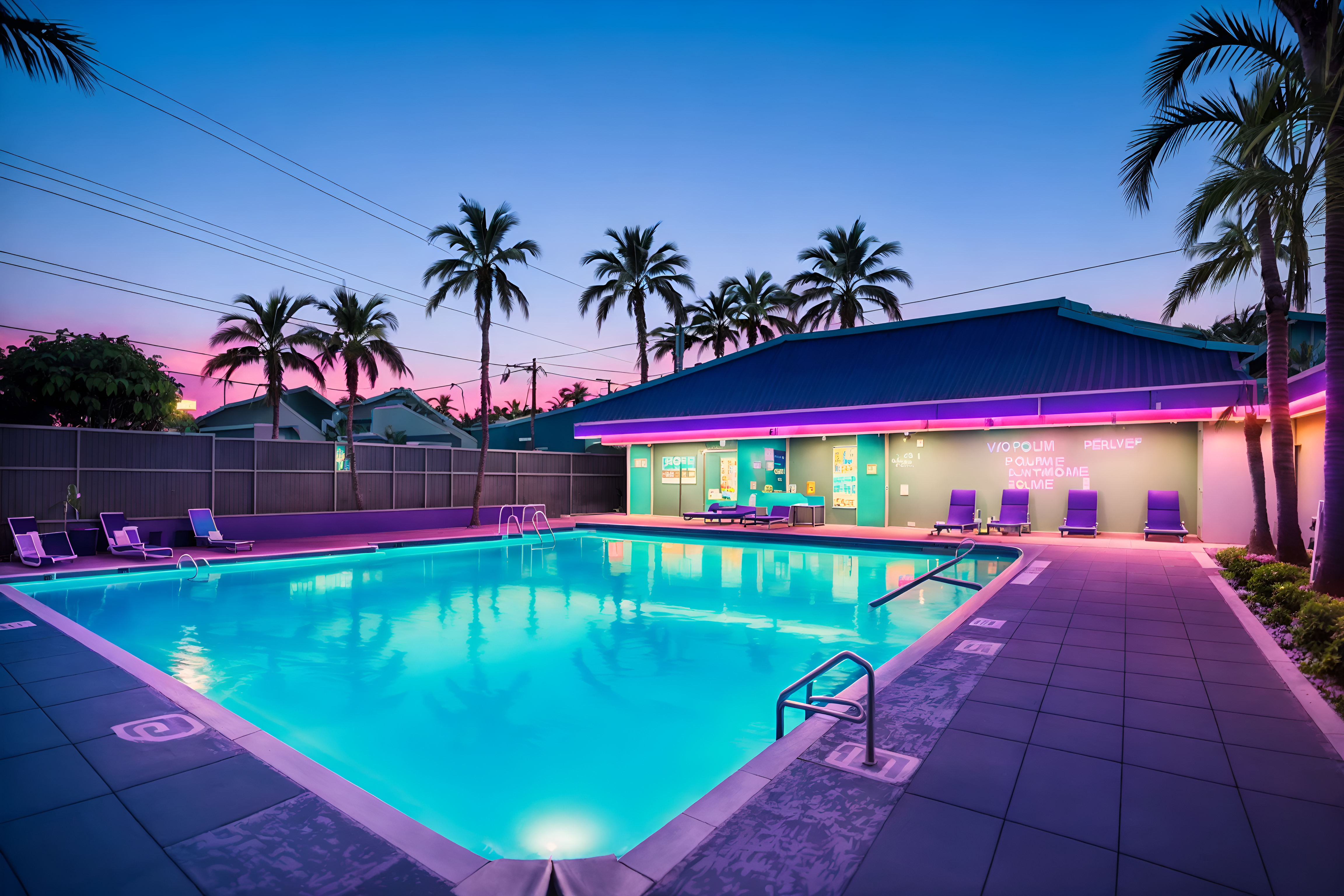 photo from pinterest of vaporwave-style designed (outdoor pool area ) with pool lights and pool and pool lounge chairs and pool lights. . with purple lights and purple lights and japanese letters on wall and 1980s retail shops and white square bathroom tiles and japanese letters on wall and baby blue and palm trees. . cinematic photo, highly detailed, cinematic lighting, ultra-detailed, ultrarealistic, photorealism, 8k. trending on pinterest. vaporwave design style. masterpiece, cinematic light, ultrarealistic+, photorealistic+, 8k, raw photo, realistic, sharp focus on eyes, (symmetrical eyes), (intact eyes), hyperrealistic, highest quality, best quality, , highly detailed, masterpiece, best quality, extremely detailed 8k wallpaper, masterpiece, best quality, ultra-detailed, best shadow, detailed background, detailed face, detailed eyes, high contrast, best illumination, detailed face, dulux, caustic, dynamic angle, detailed glow. dramatic lighting. highly detailed, insanely detailed hair, symmetrical, intricate details, professionally retouched, 8k high definition. strong bokeh. award winning photo.