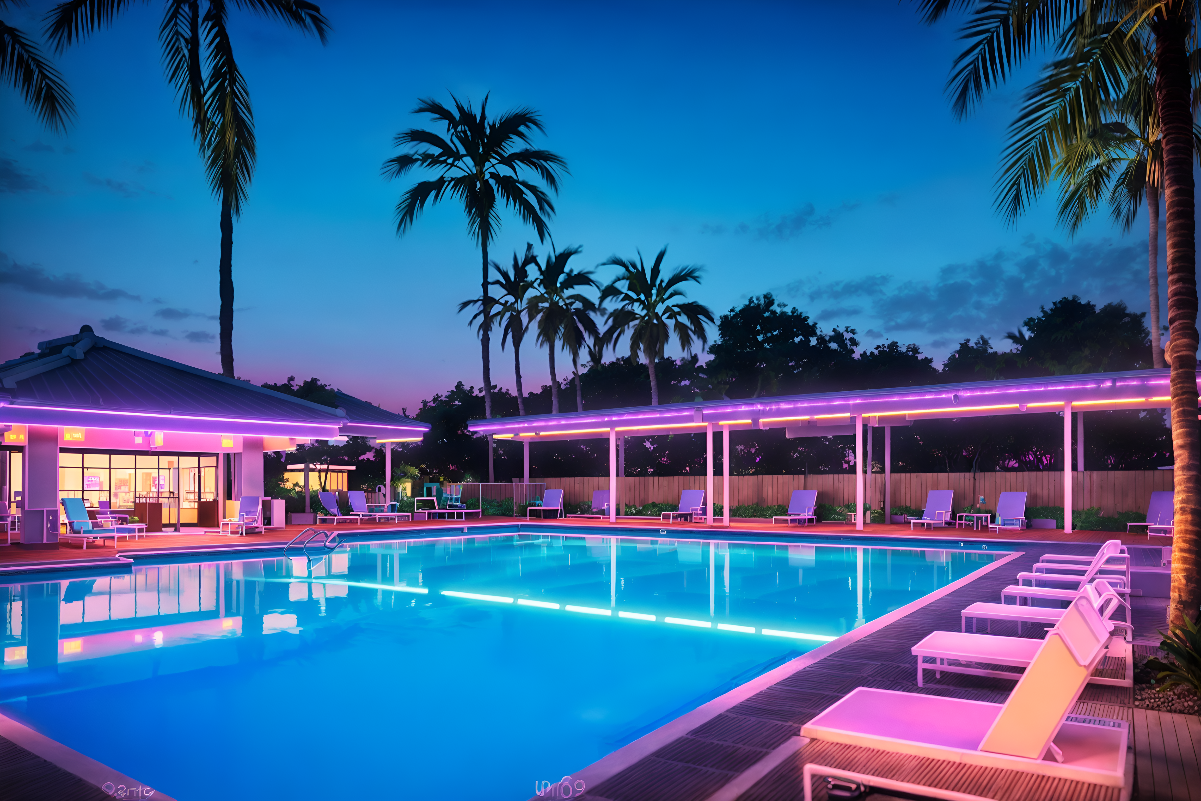 photo from pinterest of vaporwave-style designed (outdoor pool area ) with pool lights and pool and pool lounge chairs and pool lights. . with purple lights and purple lights and japanese letters on wall and 1980s retail shops and white square bathroom tiles and japanese letters on wall and baby blue and palm trees. . cinematic photo, highly detailed, cinematic lighting, ultra-detailed, ultrarealistic, photorealism, 8k. trending on pinterest. vaporwave design style. masterpiece, cinematic light, ultrarealistic+, photorealistic+, 8k, raw photo, realistic, sharp focus on eyes, (symmetrical eyes), (intact eyes), hyperrealistic, highest quality, best quality, , highly detailed, masterpiece, best quality, extremely detailed 8k wallpaper, masterpiece, best quality, ultra-detailed, best shadow, detailed background, detailed face, detailed eyes, high contrast, best illumination, detailed face, dulux, caustic, dynamic angle, detailed glow. dramatic lighting. highly detailed, insanely detailed hair, symmetrical, intricate details, professionally retouched, 8k high definition. strong bokeh. award winning photo.