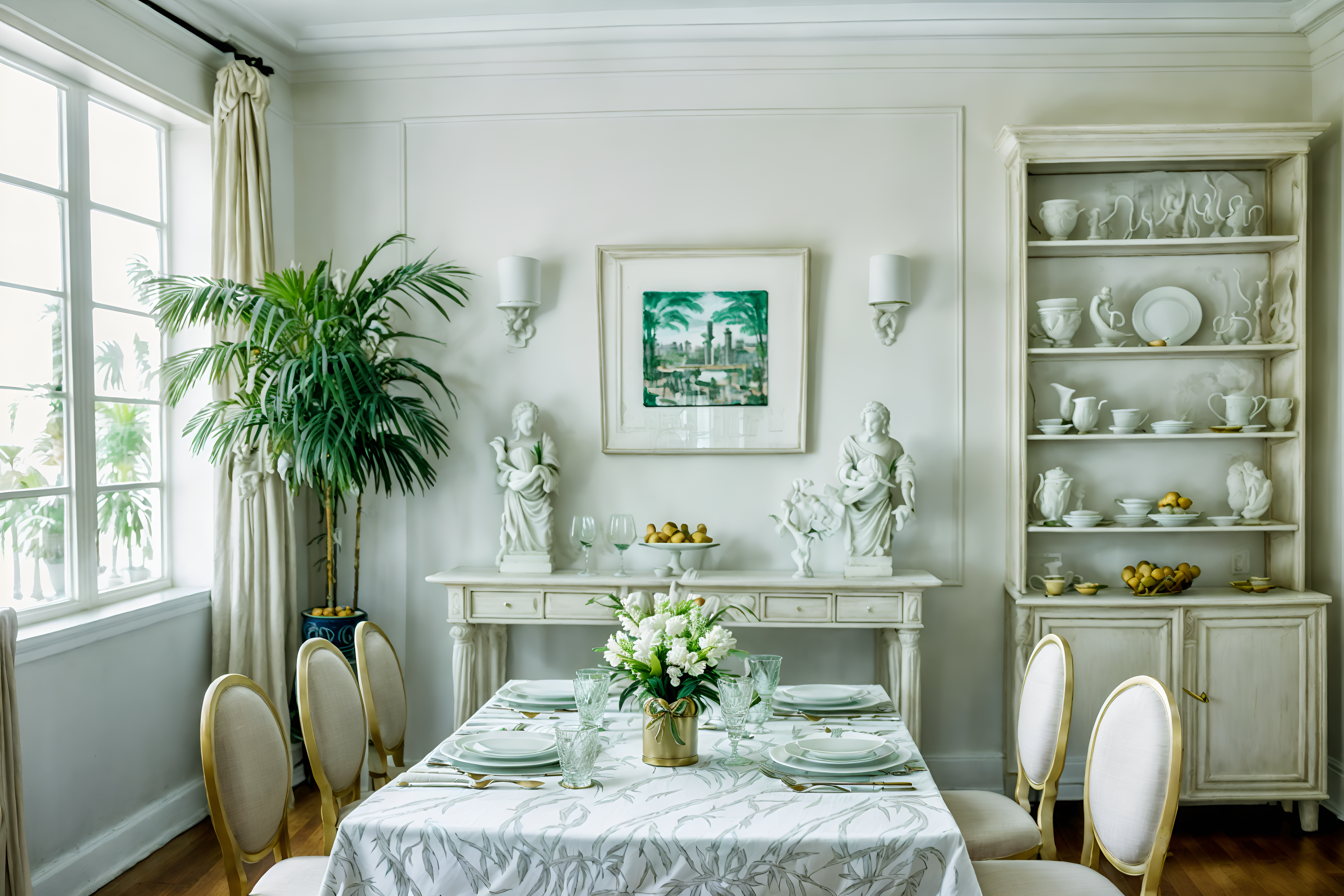 photo from pinterest of vaporwave-style interior designed (dining room interior) with bookshelves and table cloth and plates, cutlery and glasses on dining table and dining table and painting or photo on wall and vase and dining table chairs and plant. . with washed out colors and palm trees and white roman statues, white roman sculptures, white roman columns, white roman pillars in the center of the room, and teal colors and palm trees and neon glow and white square bathroom tiles and neon glow. . cinematic photo, highly detailed, cinematic lighting, ultra-detailed, ultrarealistic, photorealism, 8k. trending on pinterest. vaporwave interior design style. masterpiece, cinematic light, ultrarealistic+, photorealistic+, 8k, raw photo, realistic, sharp focus on eyes, (symmetrical eyes), (intact eyes), hyperrealistic, highest quality, best quality, , highly detailed, masterpiece, best quality, extremely detailed 8k wallpaper, masterpiece, best quality, ultra-detailed, best shadow, detailed background, detailed face, detailed eyes, high contrast, best illumination, detailed face, dulux, caustic, dynamic angle, detailed glow. dramatic lighting. highly detailed, insanely detailed hair, symmetrical, intricate details, professionally retouched, 8k high definition. strong bokeh. award winning photo.