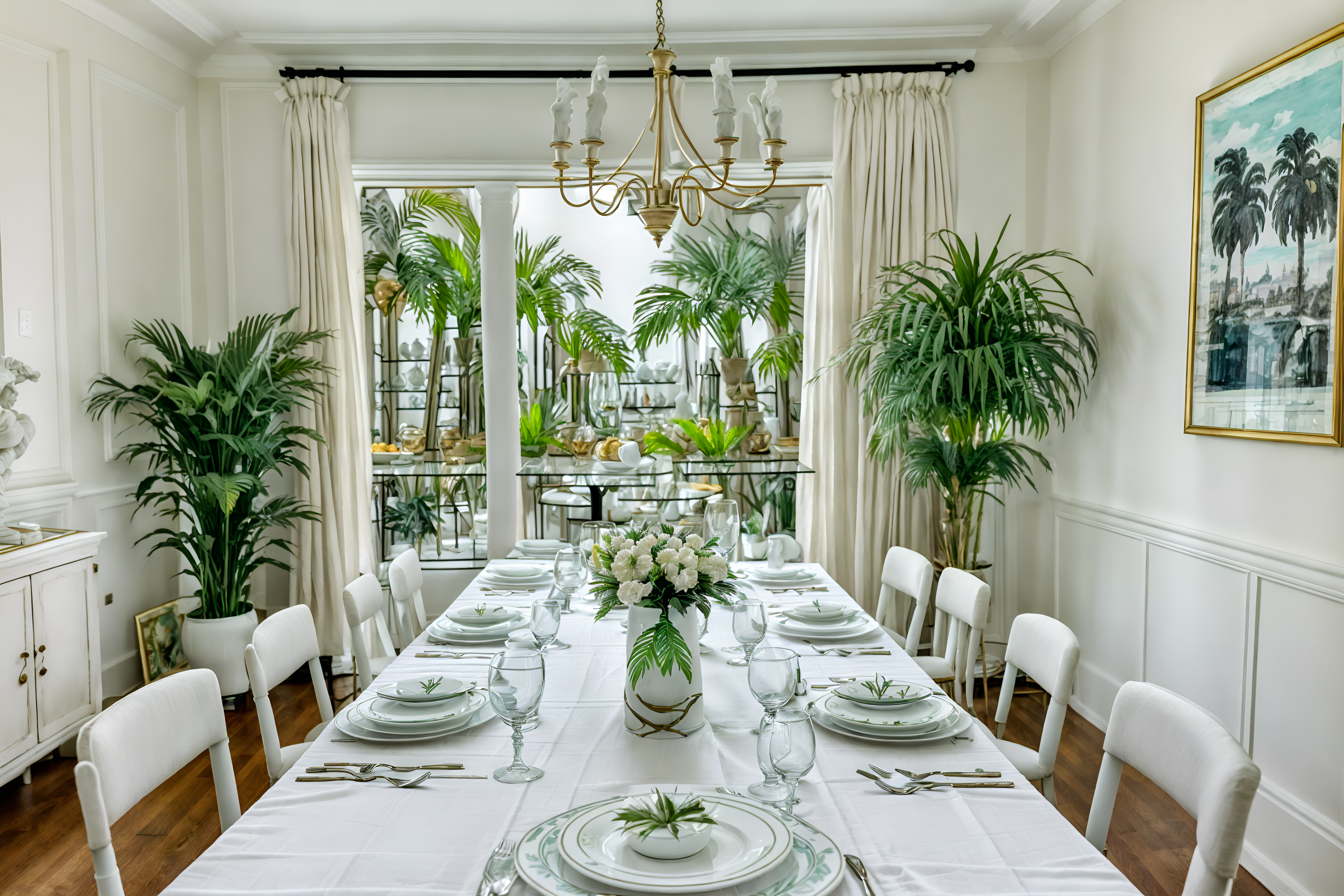 photo from pinterest of vaporwave-style interior designed (dining room interior) with bookshelves and table cloth and plates, cutlery and glasses on dining table and dining table and painting or photo on wall and vase and dining table chairs and plant. . with washed out colors and palm trees and white roman statues, white roman sculptures, white roman columns, white roman pillars in the center of the room, and teal colors and palm trees and neon glow and white square bathroom tiles and neon glow. . cinematic photo, highly detailed, cinematic lighting, ultra-detailed, ultrarealistic, photorealism, 8k. trending on pinterest. vaporwave interior design style. masterpiece, cinematic light, ultrarealistic+, photorealistic+, 8k, raw photo, realistic, sharp focus on eyes, (symmetrical eyes), (intact eyes), hyperrealistic, highest quality, best quality, , highly detailed, masterpiece, best quality, extremely detailed 8k wallpaper, masterpiece, best quality, ultra-detailed, best shadow, detailed background, detailed face, detailed eyes, high contrast, best illumination, detailed face, dulux, caustic, dynamic angle, detailed glow. dramatic lighting. highly detailed, insanely detailed hair, symmetrical, intricate details, professionally retouched, 8k high definition. strong bokeh. award winning photo.