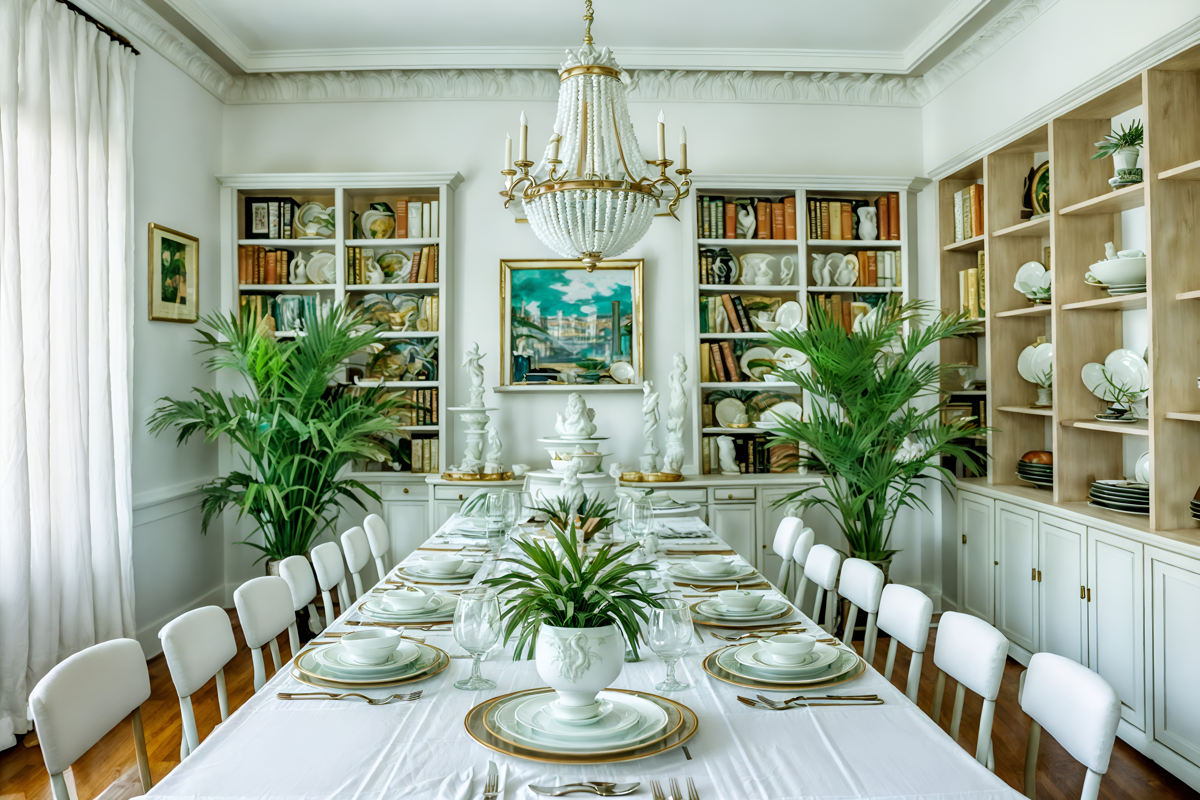 photo from pinterest of vaporwave-style interior designed (dining room interior) with bookshelves and table cloth and plates, cutlery and glasses on dining table and dining table and painting or photo on wall and vase and dining table chairs and plant. . with washed out colors and palm trees and white roman statues, white roman sculptures, white roman columns, white roman pillars in the center of the room, and teal colors and palm trees and neon glow and white square bathroom tiles and neon glow. . cinematic photo, highly detailed, cinematic lighting, ultra-detailed, ultrarealistic, photorealism, 8k. trending on pinterest. vaporwave interior design style. masterpiece, cinematic light, ultrarealistic+, photorealistic+, 8k, raw photo, realistic, sharp focus on eyes, (symmetrical eyes), (intact eyes), hyperrealistic, highest quality, best quality, , highly detailed, masterpiece, best quality, extremely detailed 8k wallpaper, masterpiece, best quality, ultra-detailed, best shadow, detailed background, detailed face, detailed eyes, high contrast, best illumination, detailed face, dulux, caustic, dynamic angle, detailed glow. dramatic lighting. highly detailed, insanely detailed hair, symmetrical, intricate details, professionally retouched, 8k high definition. strong bokeh. award winning photo.