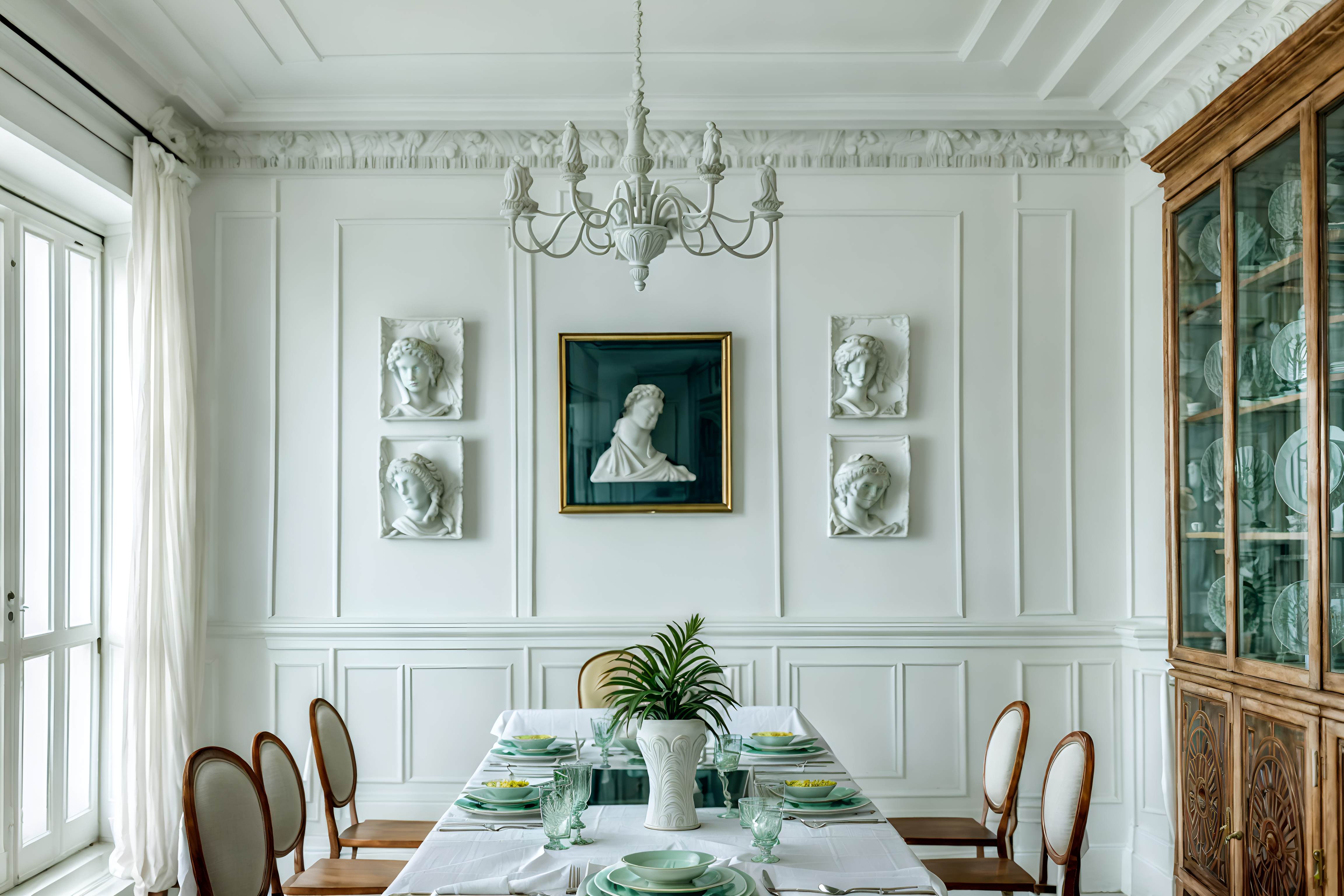 photo from pinterest of vaporwave-style interior designed (dining room interior) with bookshelves and table cloth and plates, cutlery and glasses on dining table and dining table and painting or photo on wall and vase and dining table chairs and plant. . with washed out colors and palm trees and white roman statues, white roman sculptures, white roman columns, white roman pillars in the center of the room, and teal colors and palm trees and neon glow and white square bathroom tiles and neon glow. . cinematic photo, highly detailed, cinematic lighting, ultra-detailed, ultrarealistic, photorealism, 8k. trending on pinterest. vaporwave interior design style. masterpiece, cinematic light, ultrarealistic+, photorealistic+, 8k, raw photo, realistic, sharp focus on eyes, (symmetrical eyes), (intact eyes), hyperrealistic, highest quality, best quality, , highly detailed, masterpiece, best quality, extremely detailed 8k wallpaper, masterpiece, best quality, ultra-detailed, best shadow, detailed background, detailed face, detailed eyes, high contrast, best illumination, detailed face, dulux, caustic, dynamic angle, detailed glow. dramatic lighting. highly detailed, insanely detailed hair, symmetrical, intricate details, professionally retouched, 8k high definition. strong bokeh. award winning photo.