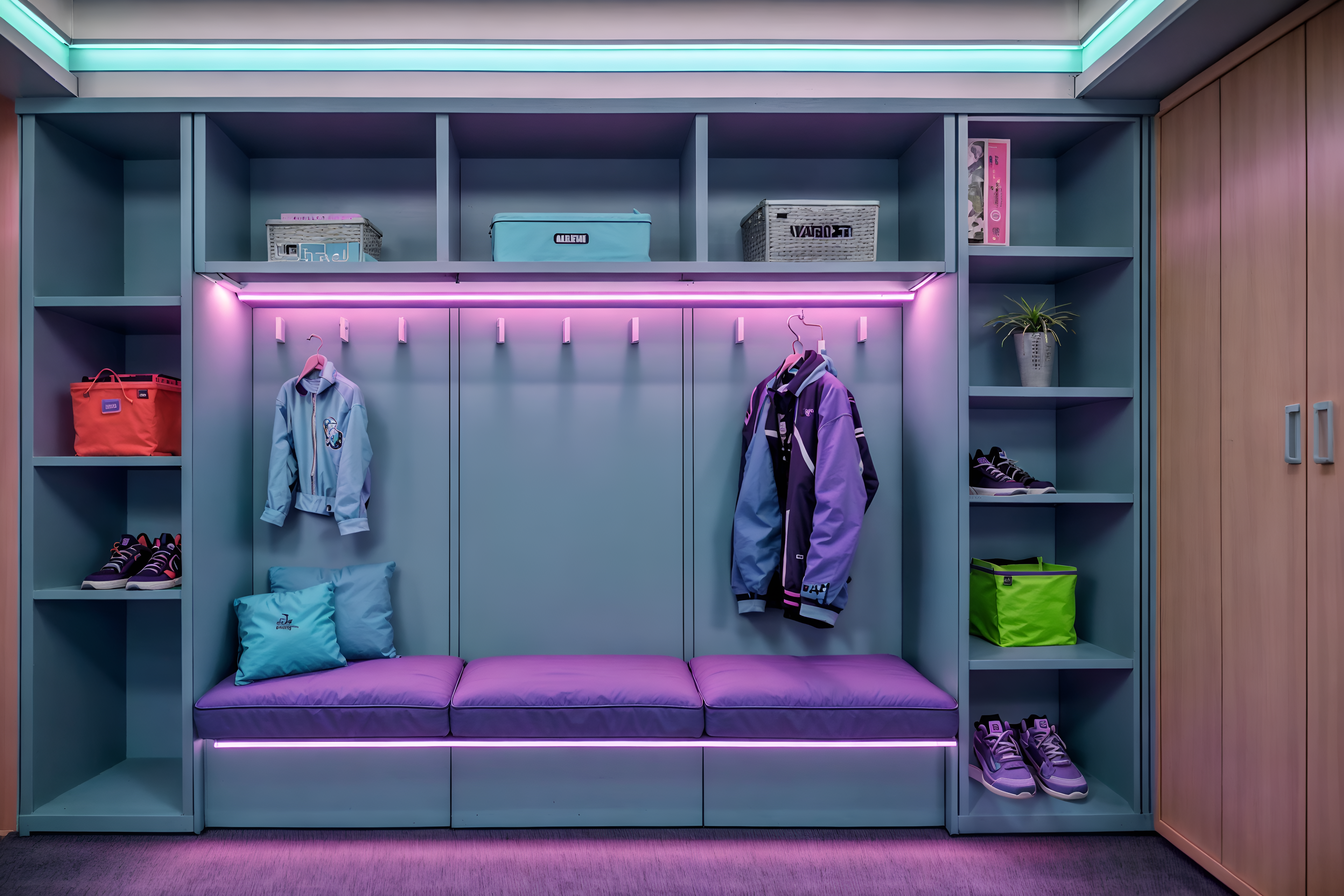 photo from pinterest of vaporwave-style interior designed (drop zone interior) with cabinets and storage baskets and shelves for shoes and high up storage and lockers and a bench and wall hooks for coats and cubbies. . with purple lights and neon glow and baby blue and palm trees and 1980s retail shops and purple lights and japanese letters on wall and japanese letters on wall. . cinematic photo, highly detailed, cinematic lighting, ultra-detailed, ultrarealistic, photorealism, 8k. trending on pinterest. vaporwave interior design style. masterpiece, cinematic light, ultrarealistic+, photorealistic+, 8k, raw photo, realistic, sharp focus on eyes, (symmetrical eyes), (intact eyes), hyperrealistic, highest quality, best quality, , highly detailed, masterpiece, best quality, extremely detailed 8k wallpaper, masterpiece, best quality, ultra-detailed, best shadow, detailed background, detailed face, detailed eyes, high contrast, best illumination, detailed face, dulux, caustic, dynamic angle, detailed glow. dramatic lighting. highly detailed, insanely detailed hair, symmetrical, intricate details, professionally retouched, 8k high definition. strong bokeh. award winning photo.