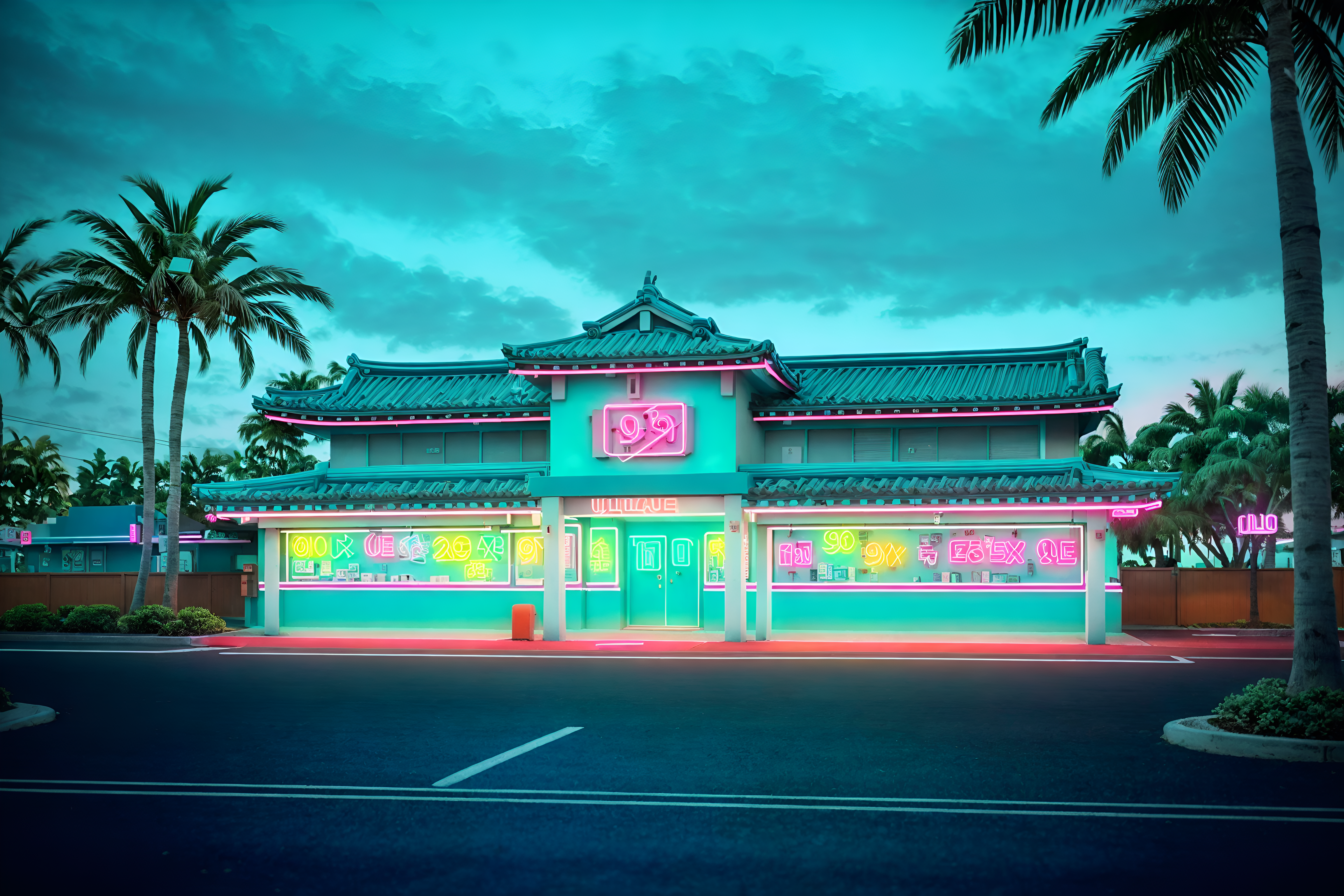 photo from pinterest of vaporwave-style exterior designed (house exterior exterior) . with neon glow and 1980s retail shops and baby blue and teal colors and white square bathroom tiles and palm trees and japanese letters on wall and japanese letters on wall. . cinematic photo, highly detailed, cinematic lighting, ultra-detailed, ultrarealistic, photorealism, 8k. trending on pinterest. vaporwave exterior design style. masterpiece, cinematic light, ultrarealistic+, photorealistic+, 8k, raw photo, realistic, sharp focus on eyes, (symmetrical eyes), (intact eyes), hyperrealistic, highest quality, best quality, , highly detailed, masterpiece, best quality, extremely detailed 8k wallpaper, masterpiece, best quality, ultra-detailed, best shadow, detailed background, detailed face, detailed eyes, high contrast, best illumination, detailed face, dulux, caustic, dynamic angle, detailed glow. dramatic lighting. highly detailed, insanely detailed hair, symmetrical, intricate details, professionally retouched, 8k high definition. strong bokeh. award winning photo.