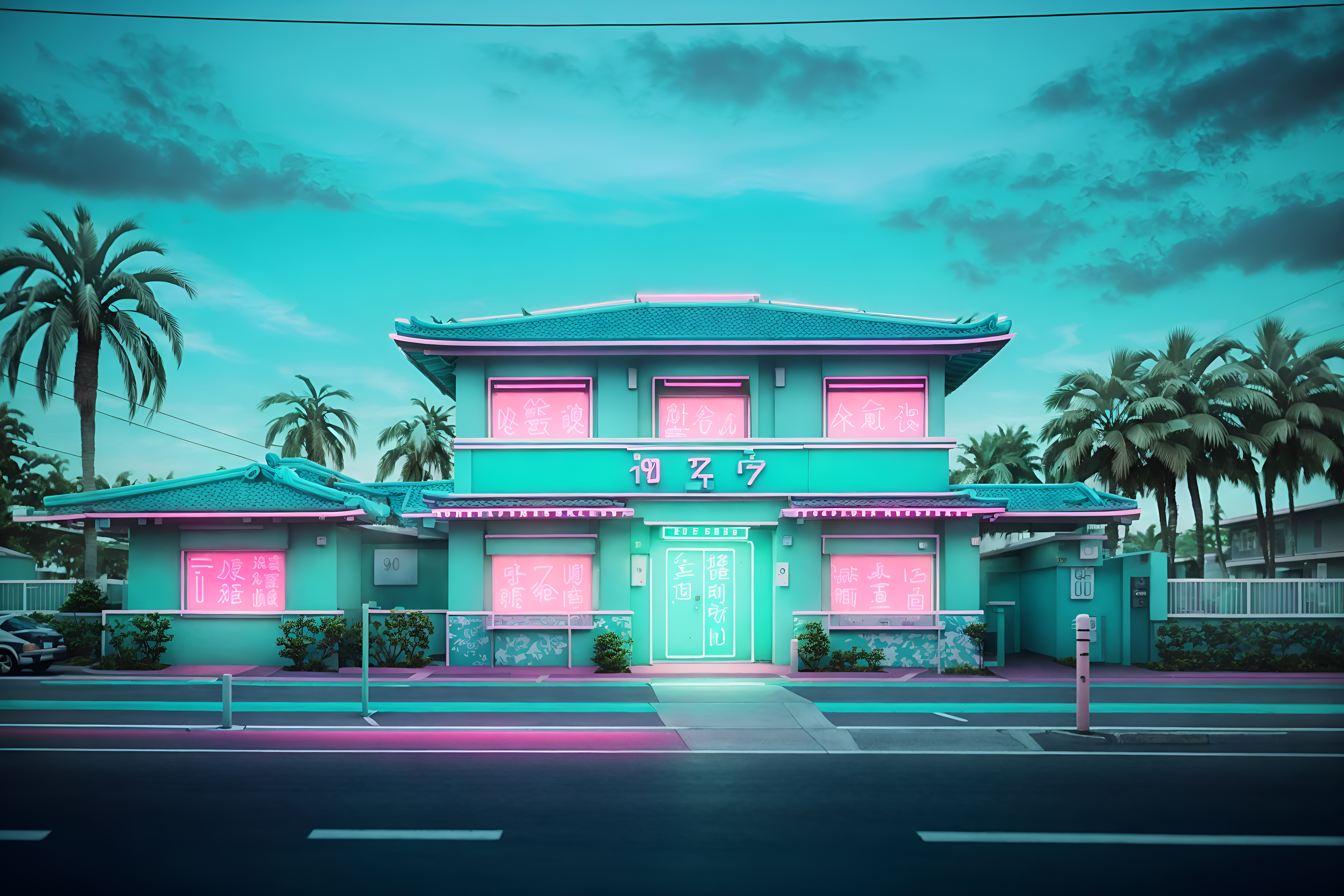 photo from pinterest of vaporwave-style exterior designed (house exterior exterior) . with neon glow and 1980s retail shops and baby blue and teal colors and white square bathroom tiles and palm trees and japanese letters on wall and japanese letters on wall. . cinematic photo, highly detailed, cinematic lighting, ultra-detailed, ultrarealistic, photorealism, 8k. trending on pinterest. vaporwave exterior design style. masterpiece, cinematic light, ultrarealistic+, photorealistic+, 8k, raw photo, realistic, sharp focus on eyes, (symmetrical eyes), (intact eyes), hyperrealistic, highest quality, best quality, , highly detailed, masterpiece, best quality, extremely detailed 8k wallpaper, masterpiece, best quality, ultra-detailed, best shadow, detailed background, detailed face, detailed eyes, high contrast, best illumination, detailed face, dulux, caustic, dynamic angle, detailed glow. dramatic lighting. highly detailed, insanely detailed hair, symmetrical, intricate details, professionally retouched, 8k high definition. strong bokeh. award winning photo.