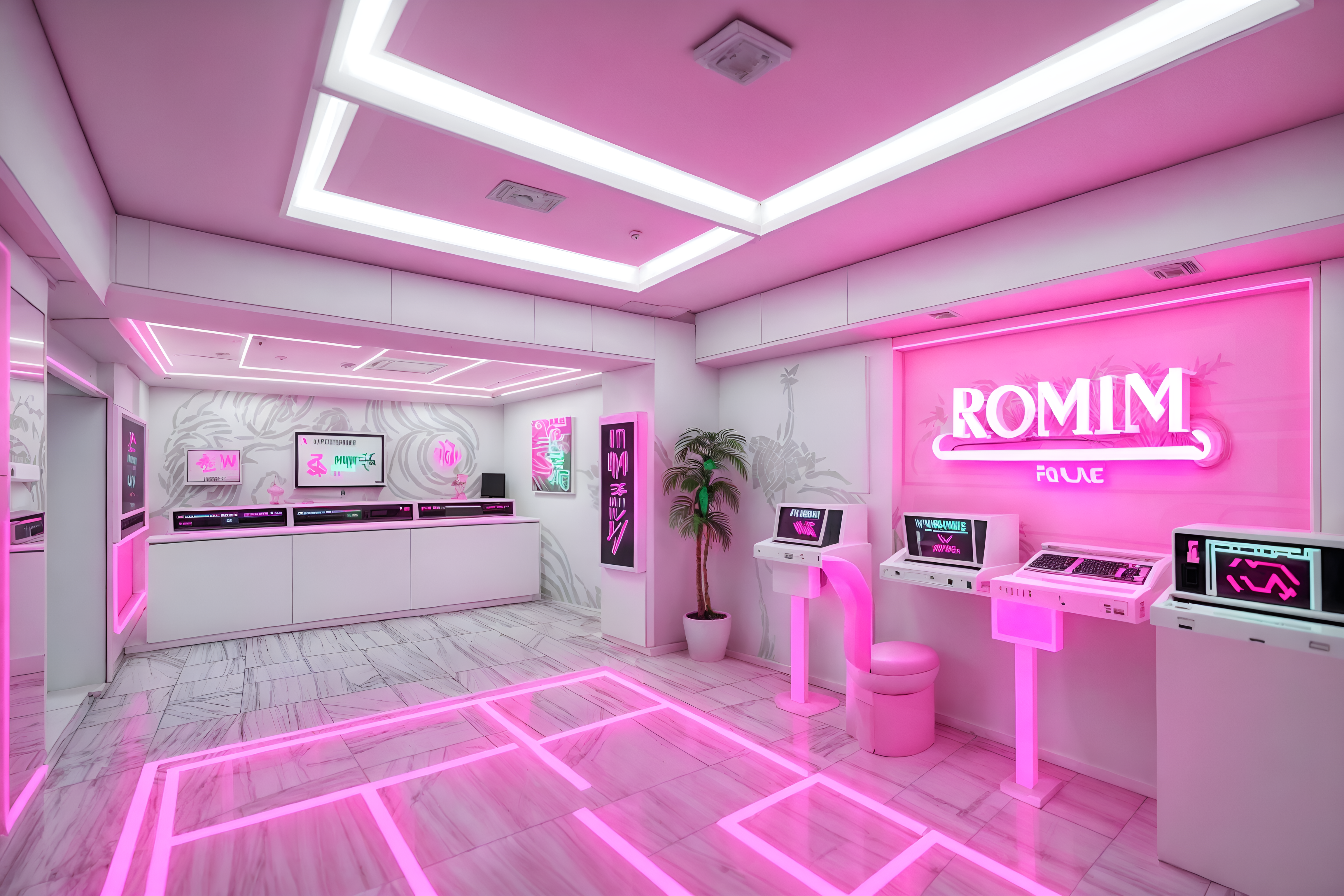 photo from pinterest of vaporwave-style interior designed (gaming room interior) . with white square bathroom tiles and bright pink and neon glow and 1980s retail shops and palm trees and japanese letters on wall and palm trees and white roman statues, white roman sculptures, white roman columns, white roman pillars in the center of the room,. . cinematic photo, highly detailed, cinematic lighting, ultra-detailed, ultrarealistic, photorealism, 8k. trending on pinterest. vaporwave interior design style. masterpiece, cinematic light, ultrarealistic+, photorealistic+, 8k, raw photo, realistic, sharp focus on eyes, (symmetrical eyes), (intact eyes), hyperrealistic, highest quality, best quality, , highly detailed, masterpiece, best quality, extremely detailed 8k wallpaper, masterpiece, best quality, ultra-detailed, best shadow, detailed background, detailed face, detailed eyes, high contrast, best illumination, detailed face, dulux, caustic, dynamic angle, detailed glow. dramatic lighting. highly detailed, insanely detailed hair, symmetrical, intricate details, professionally retouched, 8k high definition. strong bokeh. award winning photo.