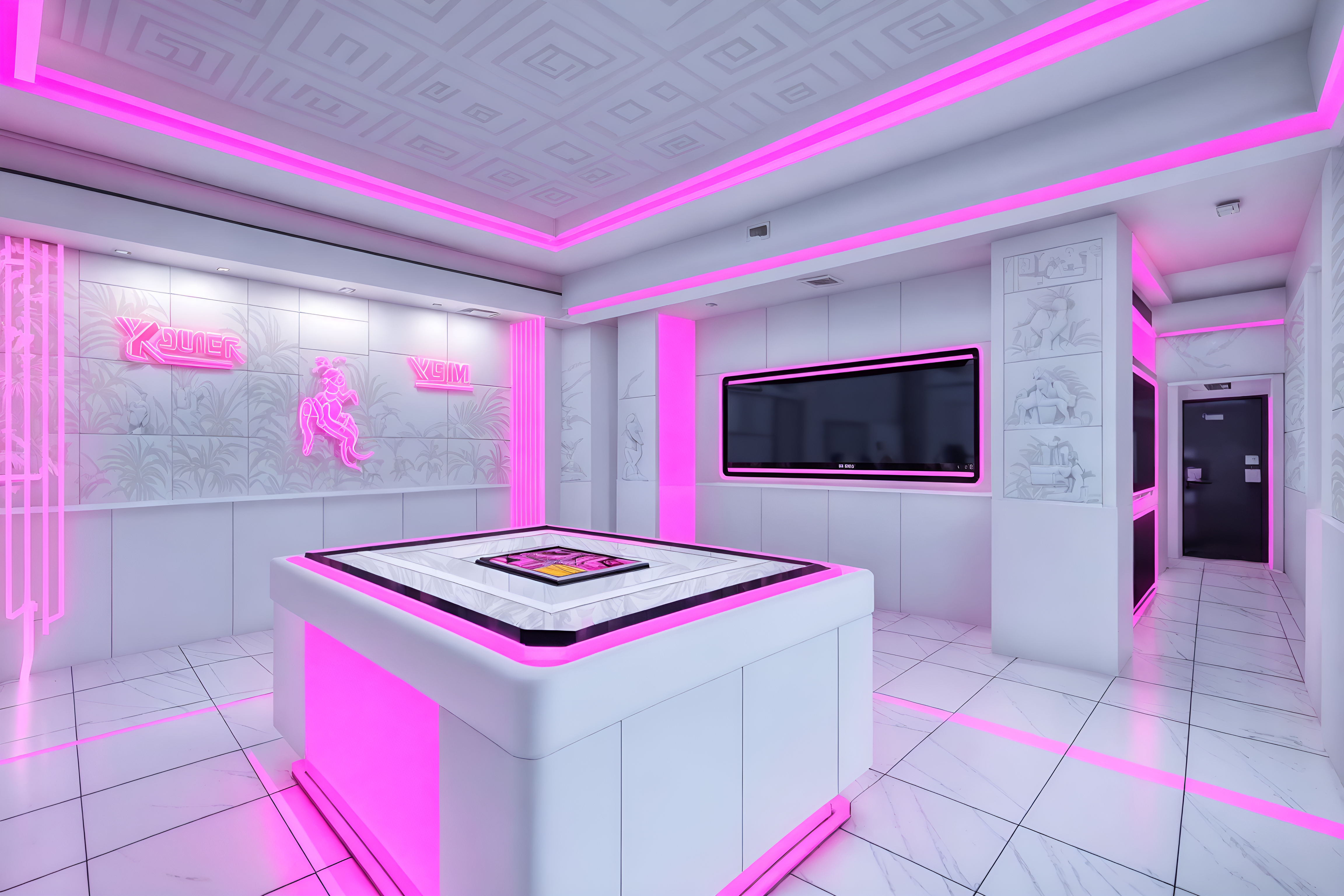 photo from pinterest of vaporwave-style interior designed (gaming room interior) . with white square bathroom tiles and bright pink and neon glow and 1980s retail shops and palm trees and japanese letters on wall and palm trees and white roman statues, white roman sculptures, white roman columns, white roman pillars in the center of the room,. . cinematic photo, highly detailed, cinematic lighting, ultra-detailed, ultrarealistic, photorealism, 8k. trending on pinterest. vaporwave interior design style. masterpiece, cinematic light, ultrarealistic+, photorealistic+, 8k, raw photo, realistic, sharp focus on eyes, (symmetrical eyes), (intact eyes), hyperrealistic, highest quality, best quality, , highly detailed, masterpiece, best quality, extremely detailed 8k wallpaper, masterpiece, best quality, ultra-detailed, best shadow, detailed background, detailed face, detailed eyes, high contrast, best illumination, detailed face, dulux, caustic, dynamic angle, detailed glow. dramatic lighting. highly detailed, insanely detailed hair, symmetrical, intricate details, professionally retouched, 8k high definition. strong bokeh. award winning photo.