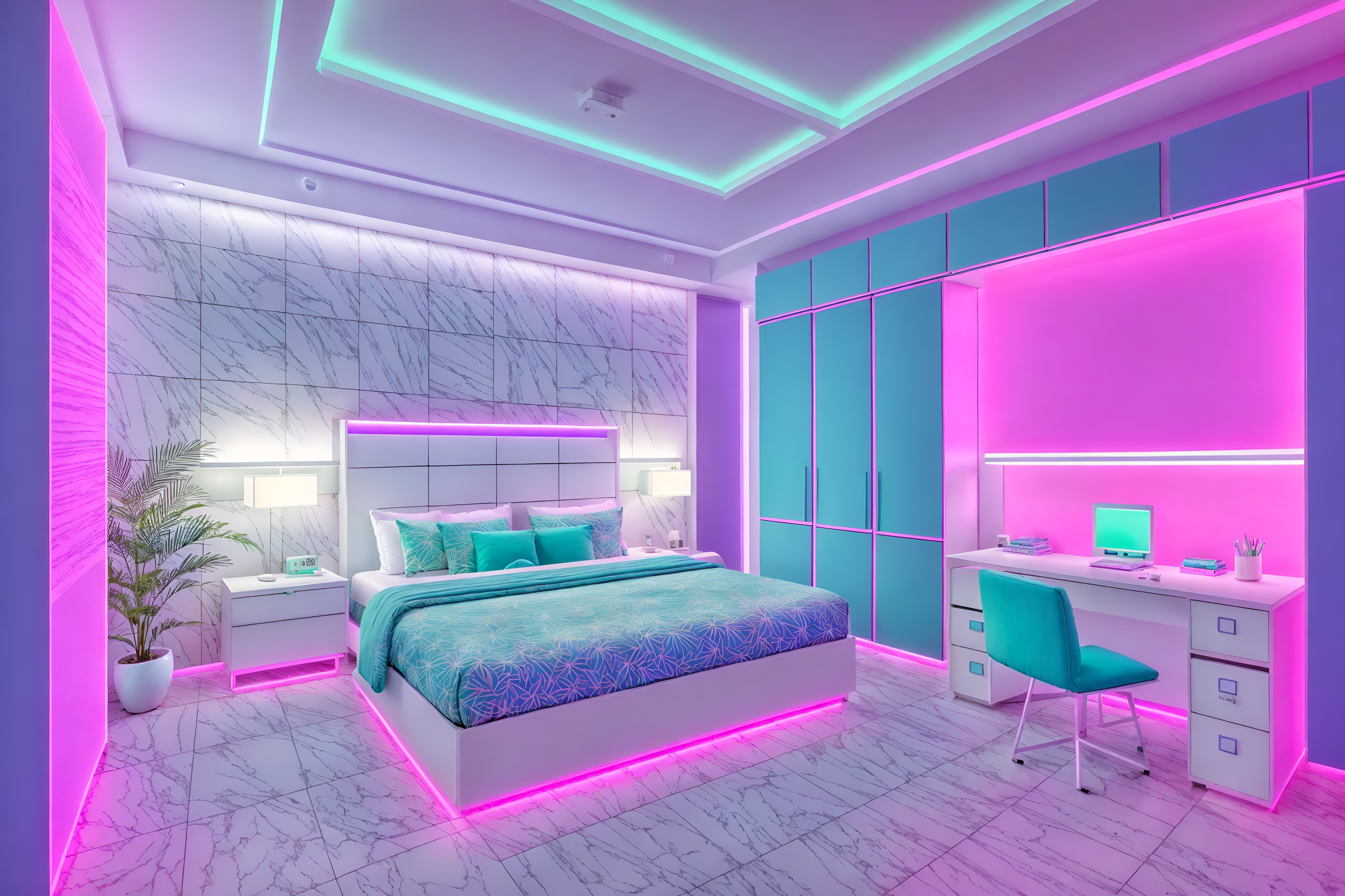 photo from pinterest of vaporwave-style interior designed (hotel room interior) with headboard and storage bench or ottoman and night light and bedside table or night stand and bed and dresser closet and mirror and working desk with desk chair. . with washed out colors and white square bathroom tiles and teal colors and purple lights and palm trees and white square bathroom tiles and neon glow and bright pink. . cinematic photo, highly detailed, cinematic lighting, ultra-detailed, ultrarealistic, photorealism, 8k. trending on pinterest. vaporwave interior design style. masterpiece, cinematic light, ultrarealistic+, photorealistic+, 8k, raw photo, realistic, sharp focus on eyes, (symmetrical eyes), (intact eyes), hyperrealistic, highest quality, best quality, , highly detailed, masterpiece, best quality, extremely detailed 8k wallpaper, masterpiece, best quality, ultra-detailed, best shadow, detailed background, detailed face, detailed eyes, high contrast, best illumination, detailed face, dulux, caustic, dynamic angle, detailed glow. dramatic lighting. highly detailed, insanely detailed hair, symmetrical, intricate details, professionally retouched, 8k high definition. strong bokeh. award winning photo.