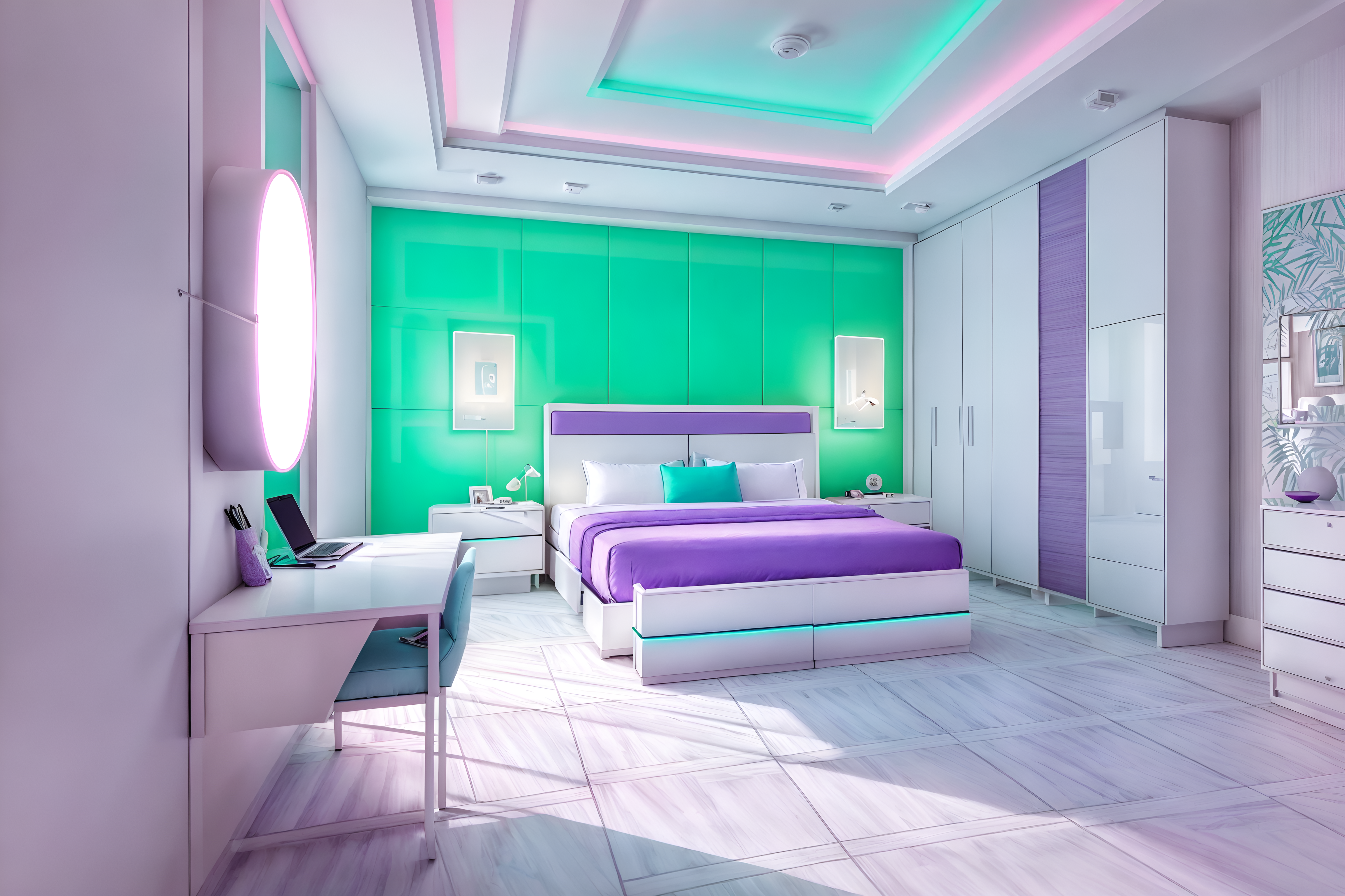 photo from pinterest of vaporwave-style interior designed (hotel room interior) with headboard and storage bench or ottoman and night light and bedside table or night stand and bed and dresser closet and mirror and working desk with desk chair. . with washed out colors and white square bathroom tiles and teal colors and purple lights and palm trees and white square bathroom tiles and neon glow and bright pink. . cinematic photo, highly detailed, cinematic lighting, ultra-detailed, ultrarealistic, photorealism, 8k. trending on pinterest. vaporwave interior design style. masterpiece, cinematic light, ultrarealistic+, photorealistic+, 8k, raw photo, realistic, sharp focus on eyes, (symmetrical eyes), (intact eyes), hyperrealistic, highest quality, best quality, , highly detailed, masterpiece, best quality, extremely detailed 8k wallpaper, masterpiece, best quality, ultra-detailed, best shadow, detailed background, detailed face, detailed eyes, high contrast, best illumination, detailed face, dulux, caustic, dynamic angle, detailed glow. dramatic lighting. highly detailed, insanely detailed hair, symmetrical, intricate details, professionally retouched, 8k high definition. strong bokeh. award winning photo.