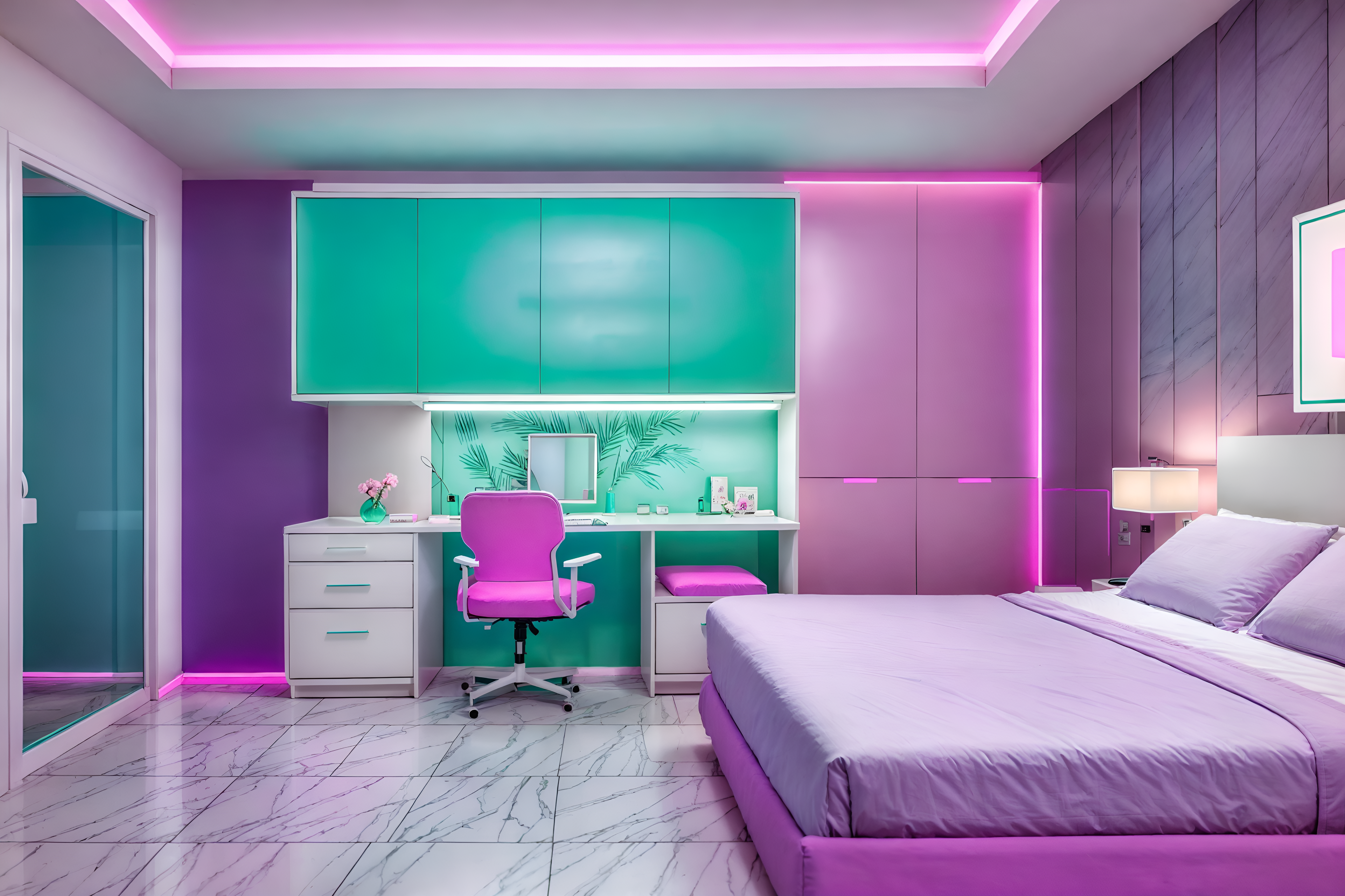 photo from pinterest of vaporwave-style interior designed (hotel room interior) with headboard and storage bench or ottoman and night light and bedside table or night stand and bed and dresser closet and mirror and working desk with desk chair. . with washed out colors and white square bathroom tiles and teal colors and purple lights and palm trees and white square bathroom tiles and neon glow and bright pink. . cinematic photo, highly detailed, cinematic lighting, ultra-detailed, ultrarealistic, photorealism, 8k. trending on pinterest. vaporwave interior design style. masterpiece, cinematic light, ultrarealistic+, photorealistic+, 8k, raw photo, realistic, sharp focus on eyes, (symmetrical eyes), (intact eyes), hyperrealistic, highest quality, best quality, , highly detailed, masterpiece, best quality, extremely detailed 8k wallpaper, masterpiece, best quality, ultra-detailed, best shadow, detailed background, detailed face, detailed eyes, high contrast, best illumination, detailed face, dulux, caustic, dynamic angle, detailed glow. dramatic lighting. highly detailed, insanely detailed hair, symmetrical, intricate details, professionally retouched, 8k high definition. strong bokeh. award winning photo.