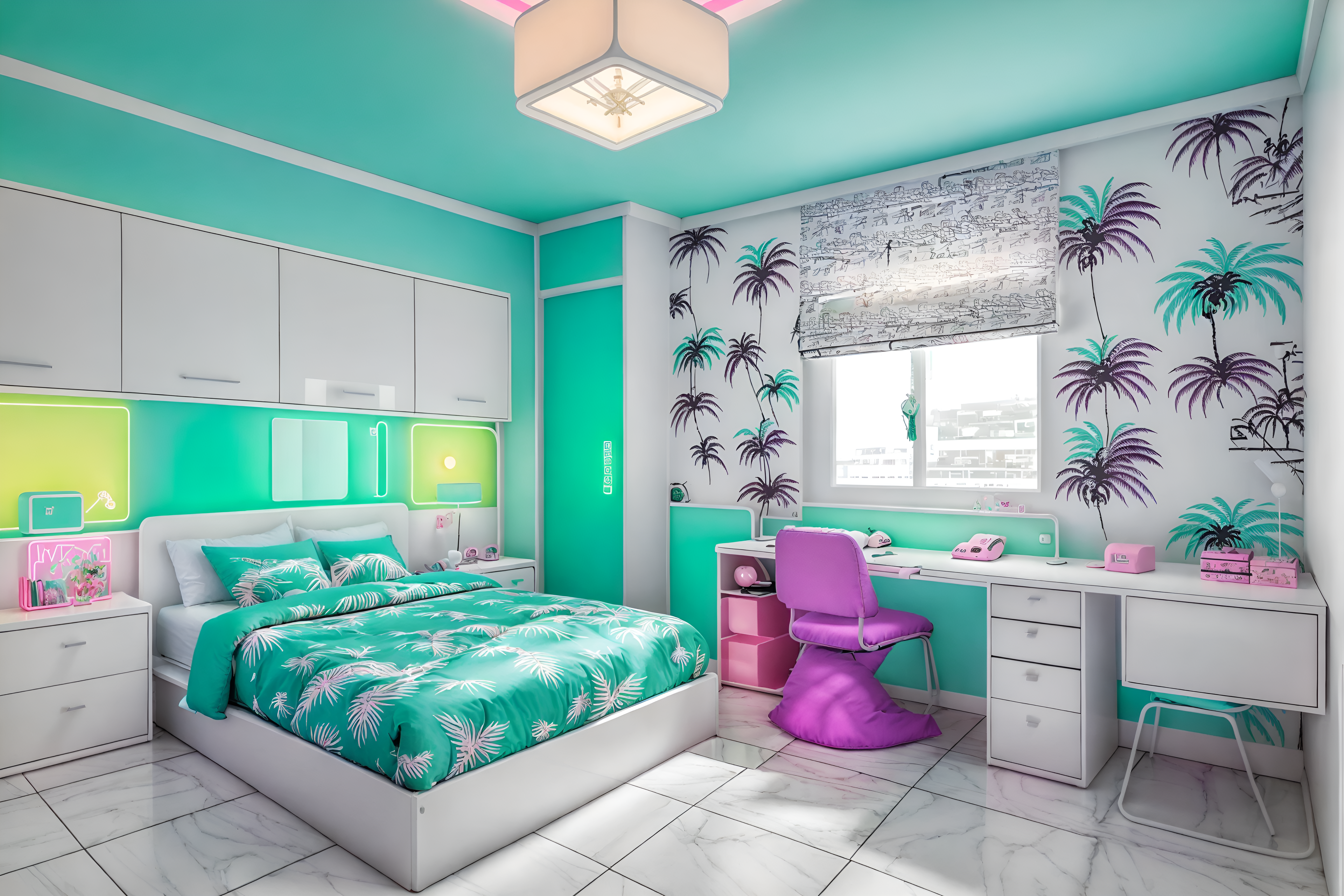 photo from pinterest of vaporwave-style interior designed (kids room interior) with storage bench or ottoman and bed and mirror and night light and dresser closet and accent chair and kids desk and bedside table or night stand. . with japanese letters on wall and white square bathroom tiles and palm trees and teal colors and palm trees and neon glow and white square bathroom tiles and purple lights. . cinematic photo, highly detailed, cinematic lighting, ultra-detailed, ultrarealistic, photorealism, 8k. trending on pinterest. vaporwave interior design style. masterpiece, cinematic light, ultrarealistic+, photorealistic+, 8k, raw photo, realistic, sharp focus on eyes, (symmetrical eyes), (intact eyes), hyperrealistic, highest quality, best quality, , highly detailed, masterpiece, best quality, extremely detailed 8k wallpaper, masterpiece, best quality, ultra-detailed, best shadow, detailed background, detailed face, detailed eyes, high contrast, best illumination, detailed face, dulux, caustic, dynamic angle, detailed glow. dramatic lighting. highly detailed, insanely detailed hair, symmetrical, intricate details, professionally retouched, 8k high definition. strong bokeh. award winning photo.